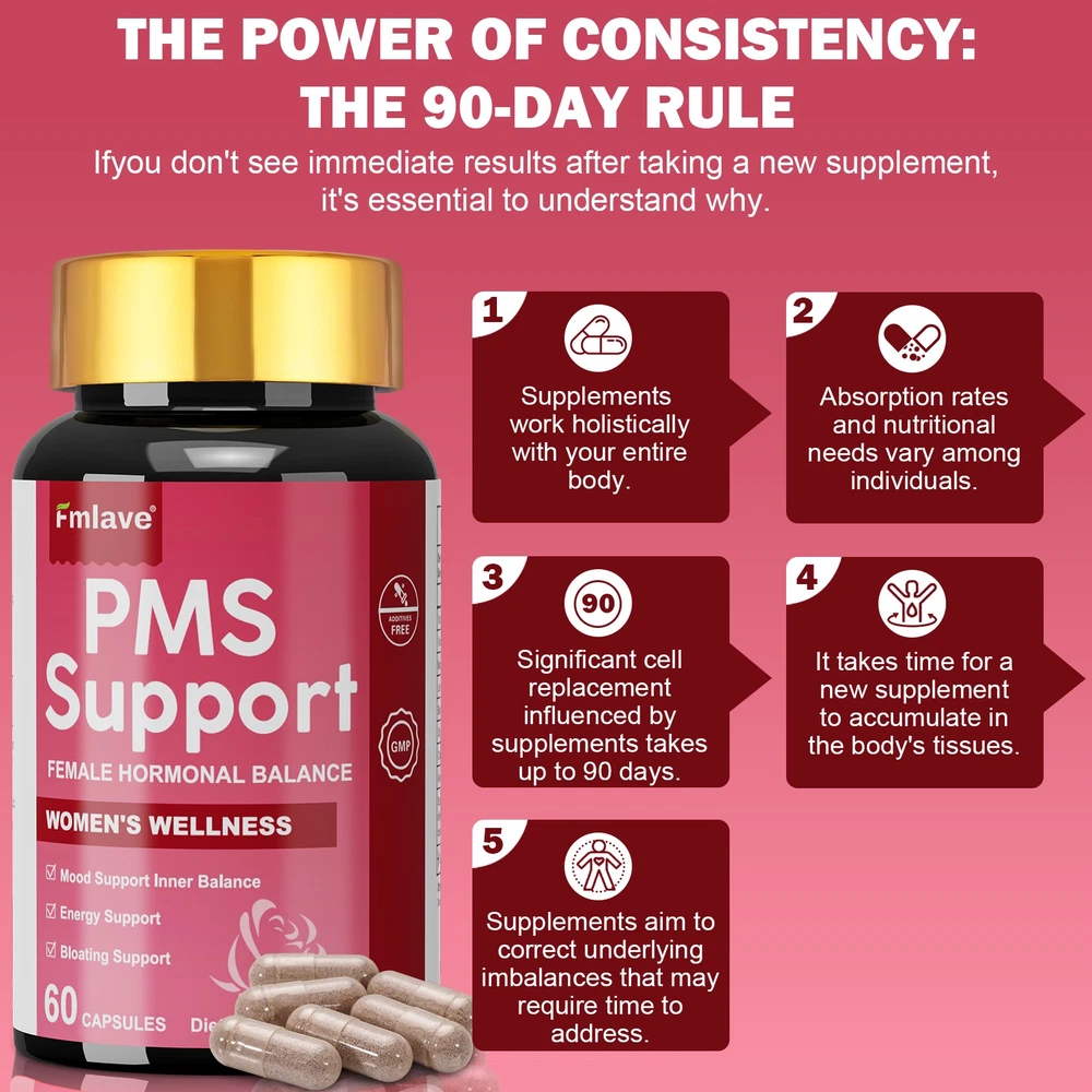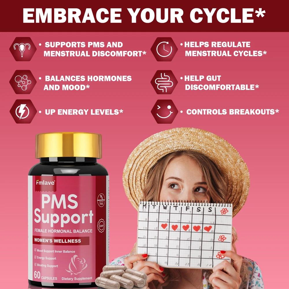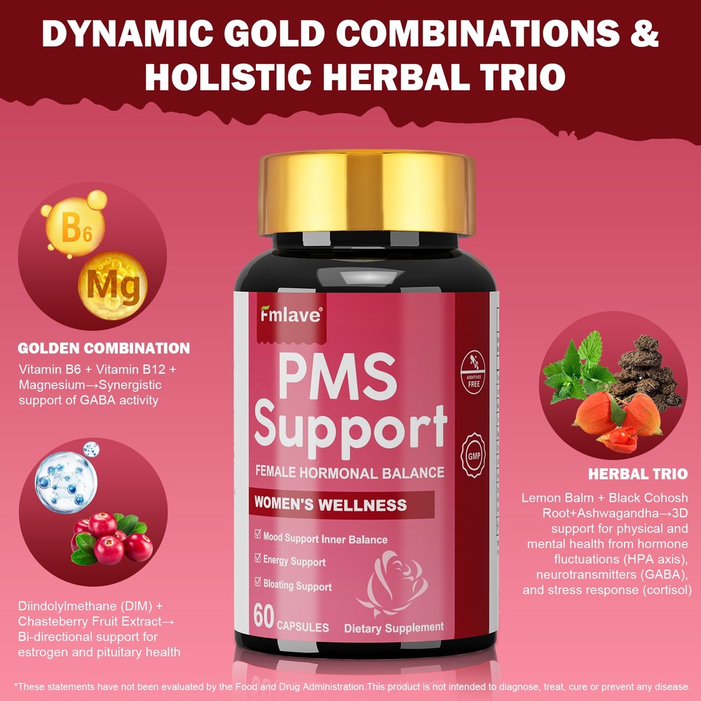 Fmlave PMS Vitamins for Women - Proactive PMS Surpport & Estrogen Support, High-Potency Hormone Balance with Vitamin B6,B12, DIM & Ashwagandha, Targets For Mood Swings Breakouts, Bloating, Cramps. Each bottle 60 Capsule, 30-day supply. What is PMS? PMS (Premenstrual Syndrome) refers to physical and emotional symptoms women may experience 1-2 weeks before their period. If you struggle with menstrual discomfort, hormonal fluctuations, mood swings, breast tenderness, or digestive issues, our PMS supplement can help bring your body back into balance. Features: Nurture Your Natural Rhythm Crafted for modern women, Fmlave combines clinically-studied botanicals with essential vitamins to gently support hormonal equilibrium, promote emotional balance, and maintain abdominal comfort** during your monthly cycle. Triple-Action Support System --Mood & Inner Balance: Features Lemon Balm + Black Cohosh with Vitamins B6/B12 to help maintain a calm mood and support nervous system health. --Bloating Discomfort Support: DIM (Diindolylmethane) + Chasteberry Extract work synergistically to encourage healthy estrogen metabolism and promote abdominal ease. --Sustainable Energy: High-potency Magnesium (350mg) + Ashwagandha combat fatigue by supporting adrenal health and cellular energy production. Science-Backed Ingredients -Vitamin B6 (10mg) & B12 (10mcg)–Aid neurotransmitter synthesis & hormonal metabolism. -Absorbable Magnesium (350mg)–Supports muscle relaxation and electrolyte balance. -Bioactive DIM (100mg) – Sourced from cruciferous vegetables for estrogen balance. -Botanical Powerhouse Blend: 1) Lemon Balm (150mg): Traditionally used for relaxation support. 2) Black Cohosh (100mg): Promotes women’s cyclical wellness. 3) Chasteberry (100mg, 0.5% Aucubin): Helps maintain hormonal harmony. 4) Ashwagandha 4:1 Extract (100mg): Adaptogen for stress resilience. Quality Assurance -cGMP Certified Manufacturing | Third-party lab tested. -Clean Formula: Vegan capsules, No artificial colors/flavors. -Freshness Guaranteed: Moisture-proof bottle (60 caps = 30-day supply). Why Women Choose Fmlave? Precise Formulation: Evidence-based dosages for tangible support. Gentle Yet Effective: Gradual approach respects your body’s natural processes. Holistic Approach: Targets mood, energy, and physical comfort in one formula. Rediscover Your Balanced Self – Make Fmlave Part of Your Wellness Journey Statements: These statements have not been evaluated by the FDA. This product is not intended to diagnose, treat, cure, or prevent any disease. SUGGESTED USE: As a dietary supplement, take 2 capsules once daily, preferably with a meal and water, or as directed by a healthcare professional. What you would receive? 2 x 60 capsules PMS Surpport Supplement.