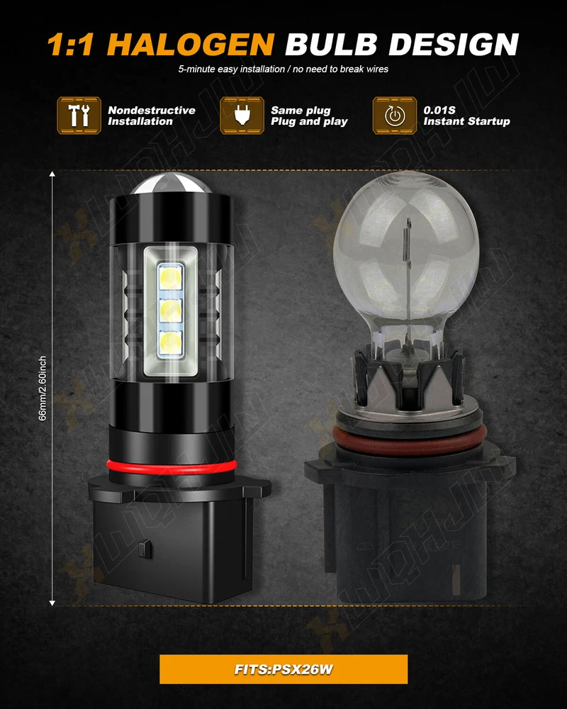 Notes: Please check whether it is fit your vehicle before purchase. Product Description: Compatible With: PSX26W Specifications: 1. Condition: 100% Brand New / Never Used 2. Voltage: DC 9-32V ( Fit 12V,24V Vehicle ) 3. Power: 110W/bulb 4. IP Rate: IP67 5. LED type: LED 6. Beam Angle: 360° 7. Color Temperature: 6000K White 8. Heat Dissipation Theory: Heat Pipe Technology + A380 Aluminum Heatsink 9. Operating Life: >50000hrs 10. Operating Temperature: -40 - +80°C 11. Application: Daytime Running Light Bulb 12. Number of Bulbs: 2 13. To Fit: Daytime Running Light Bulb 14. Placement on Vehicle: Front Package Content: 2 x LED Daytime Running Light Well Packaged in Retail Box 5 Years Warranty Features: 1.100% New / Never Used and Well Packaged in Retail Box 2.Beam Angel: 360 Degrees 3.Color Temperature: 6000K White 4.Fanless Design,Smart Efficient Cooling System Fast Heat Dissipation 5.Low Power Consumption than Halogen bulb, Energy Saving 6.Low Voltage Protection, High Precision Constant Current driver Chip 7.Shakeproof and Long lasting up to 50,000 Hours. 8.Easy installation 9.Operating Temperature: -40°C ~ +80°C !!! This Bulb is ONLY recommended for Fog Light or Daytime Running Light !!! !!! NOT recommended for Head Light except for Off-Road or Car Show !!! !!! LED bulb is not Dual Beam. No brightness change for dual beam Model 9003 9004 9007 9008 !!! On Nov 14, 2024 at 03:28:31 PST, seller added the following information:
