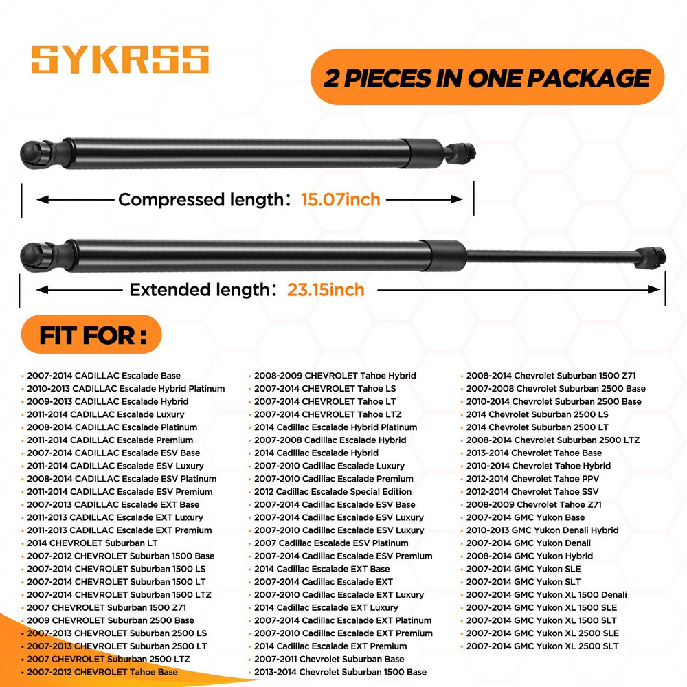 About this item Rear Hatch Liftgate Lift Supports Placement on Vehicle: Rear Left & Right Gate Extended Length [in] 22.70. Compressed Length [in] 15.45 Fit for Chevrolet Suburban 1500 2007 - 2014, Suburban 2500 2007 - 2014, Tahoe 2007 - 2014, Fits for GMC Yukon 2007 - 2014, Yukon XL 1500 2007 - 2014, Yukon XL 2500 2007 - 2014 Liftgate Interchange Part Number: 6156, SG330076, PM1062, 025060, 10029990, 024851, 4705WW, 4705WW, 9173VX, 9524VU, 4482YC, 9173VX, 22743451,10029990,15854712,15827433 Easy to install in just minutes and no special tools required for installation 2x Rear Hatch Liftgate Lift Support Strut Shock For 07-14 Chevy GMC Cadillac V8 About this item Rear Hatch Liftgate Lift Supports Placement on Vehicle: Rear Left & Right Gate Extended Length [in] 22.70. Compressed Length [in] 15.45 Fit for Chevrolet Suburban 1500 2007 - 2014, Suburban 2500 2007 - 2014, Tahoe 2007 - 2014, Fits for GMC Yukon 2007 - 2014, Yukon XL 1500 2007 - 2014, Yukon XL 2500 2007 - 2014 Liftgate Interchange Part Number: 6156, SG330076, PM1062, 025060, 10029990, 024851, 4705WW, 4705WW, 9173VX, 9524VU, 4482YC, 9173VX, 22743451,10029990,15854712,15827433 Easy to install in just minutes and no special tools required for installation Payment Delivery details Terms of sales About us Contact us Payment 1.We only accept PayPal. PayPal is the only online payment method we accept. Please make sure you have a valid/confirmed PayPal account prior bidding. 2.All Paypal Payments must be Confirmed. Payment must be made within 48hrs of the auction end time. Non-Paying bidders will be reported. 3.When you get your package,maybe you will pay some charges, it's taxes for local customs,not pay to us, and the fees are depends on the customs, all buyer are same. Delivery details 1.Items will be shipped within 2 business days after payment is received. 2.We ship to your eBay address. Please make sure your eBay address is correct. Buyer takes responsibility if eBay address is wrong. 3.Import duties, taxes and charges are not included in the item price or shipping charges. Please check with your country customs office for these additional charges. 4.We shipping using UPS or USPS from our nearest warehouse to you. Tracking numbers will be emailed upon shipment. Terms of sales 1.Please feel free to email us if you have any question. 2.We appreciate you contact us via eBay message when you are not satisfied rather than open case or leave negative feedback directly. We'll try our best to solve the issue. 3.Refund will be issued once we receive your returned items. Buyer is responsible for all return shipping charges. 4.Please contact us for return process before you return the item. 5.All items for exchange or refund must be returned in "as new" condition. About us We are the responsible seller ,always provide high-quality products and best service .If you have any questions, please contact us, and will try our best to help you. Please contact us by eBay Message, and we will reply you within 24 hours. Thank you very much! Contact us We are the professional auto parts manufacturer , and provide line lock, AN hose end fittings , fuel line , fuel filter , fuel regulator , exhaust cutout , exhaust tips , exhaust muffler and so on .The quality of the product to be secured. If you have any questions or any needs , please contact us , and will try our best to help you.