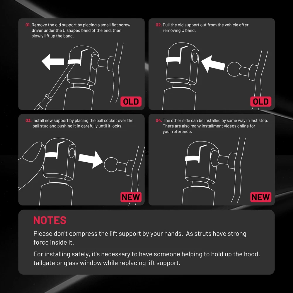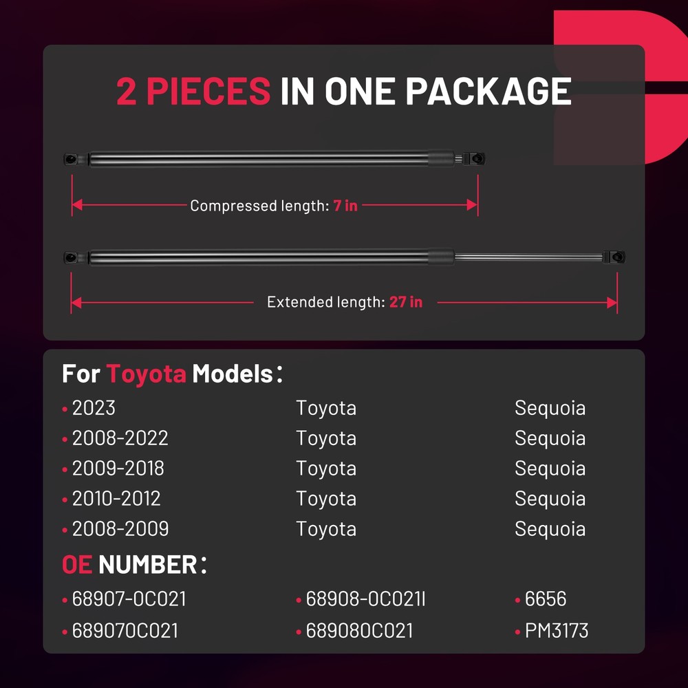 【Basic Info.】Hood lift supports are compatible with Toyota Sequoia 2008-2023. Please see specifications at detail page.It has 2 items in one set and is installed at front hood. Hood struts are 7in compressed and 27in extended.No ball studs. 12+6 months warrany. 【Worry about the Fitting?】Compatible with Toyota Sequoia 2008-2023 for OE: 6656, PM3173, 68907-0C021, 68908-0C021I, 689070C021, 689080C02. We compared all the dimensions with OEM product in order to make sure every aspect meets your expectation. And it is. Fits the followings: 2008-2017 Toyota Sequoia Base Sport Utility 4-Door Liftgate-With Power Liftgate 2008-2017 Toyota Sequoia Limited Sport Utility 4-Door Liftgate-With Power Liftgate 2008-2017 Toyota Sequoia Platinum Sport Utility 4-Door Liftgate-With Power Liftgate 2008 Toyota Sequoia SR5 Premium Sport Utility 4-Door Liftgate-With Power Liftgate 2008-2017 Toyota Sequoia SR5 Sport Utility 4-Door Liftgate-With Power Liftgate Application: Liftgate Extended Length [in]:27.10 Compressed Length [in]:20.30 Package included: 2pcs Liftgate Lift Supports OE: 6656, PM3173, 68907-0C021, 68908-0C021I, 689070C021, 689080C02