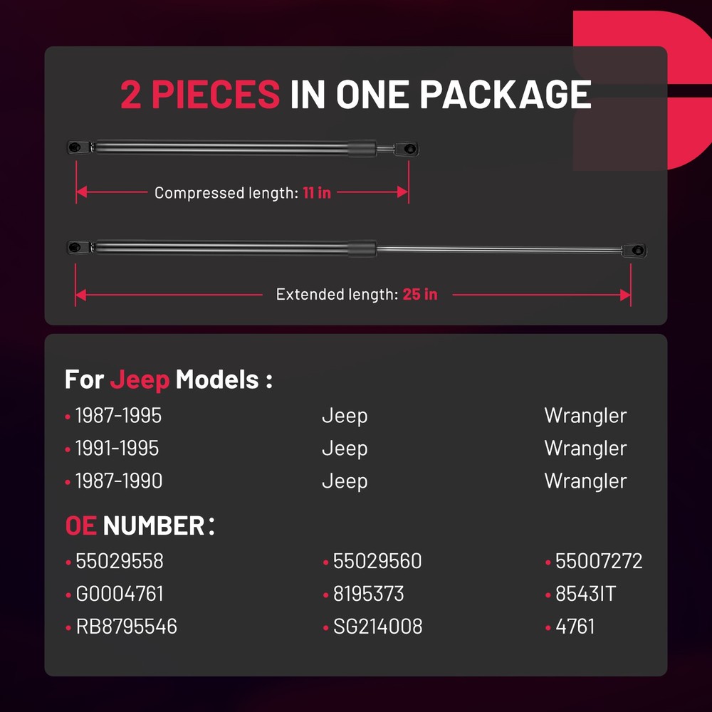 【Perfect Fitment】Compatible with Jeep Wrangler 1987-1995------ (Rear Window Glass) 【Reference Number】Replacement for 55029558 55029560 55007272 G0004761 8195373 8543IT RB8795546 SG214008 4761 【About Package】Package includes 2 pieces Lift Supports. Strong package with thick cardbord and air column bag, which provides shock absorption and protection during transportation. 【Directly Fit】OE replacement Lift Supports Shock Struts, directly fit. Easy installation, no special tools required. High strength leak-proof piston seal; Superior rod finish resists corrosion; Easy lifting and reduce closing effort. 【Buy with Confidence】1 Year Unlimited-mileage Quality Guarantee for all our Gas Spring Prop Struts---We extremely value your satisfaction and strive to provide you good shopping exprien 2x Rear Window Lift Supports Gas Struts for Jeep Wrangler 1987 1988-1995 SUV Items Description Item Type: Lift Supports Gas Spring Struts Condition: Brand New Warranty: One Year Warranty OE Number: 55029558 55029560 55007272 G0004761 8195373 8543IT RB8795546 SG214008 4761 Quantity Sold: A Set of tow Pieces Installation location: Rear Window Glass FIT THE FOLLOWING For Jeep Models : - 1987 - 1995 Jeep Wrangler - 1991 - 1995 Jeep Wrangler - 1987 - 1990 Jeep Wrangler NOTES: 1. To confirm that this part fits your vehicle, enter your vehicle's Year, Make, Model, Trim and Engine in the Compatibility Table. Also review the notes section in the compatibility chart for additional specifications about this part. 2. Or, please provide your vehicle information or VIN Number, we will help you to check whether fit or not. When To Replace Lift Support? - When you find that using manpower to support the trunk or engine requiring great physical exertion, you should install a pair of gas lift support rod to ensure your safety and save your strength. - Your lift support is beginning to wear-out when the gate or hood is difficult to lift, begins to sag when in an open position, or can't be held in position without some other propping device. That can turn into a physical catastrophe if the lift fails to open or slams closed when in the open position. This is very dangerous! - All lift supports eventually have to be replaced because they have a small gas-charge which naturally escapes over time through the lift support seal. - Lift supports generally wear-out in 3 - 5 years. Extremes in weather (extreme hot or cold) or abnormally excessive opening or closing will shorten the life of your lift support. Payment Delivery details Terms of sales About us Contact us Payment 1.We only accept PayPal. PayPal is the only online payment method we accept. Please make sure you have a valid/confirmed PayPal account prior bidding. 2.All Paypal Payments must be Confirmed. Payment must be made within 48hrs of the auction end time. Non-Paying bidders will be reported. 3.When you get your package,maybe you will pay some charges, it's taxes for local customs,not pay to us, and the fees are depends on the customs, all buyer are same. Delivery details 1.Items will be shipped within 2 business days after payment is received. 2.We ship to your eBay address. Please make sure your eBay address is correct. Buyer takes responsibility if eBay address is wrong. 3.Import duties, taxes and charges are not included in the item price or shipping charges. Please check with your country customs office for these additional charges. 4.We shipping using UPS or USPS from our nearest warehouse to you. Tracking numbers will be emailed upon shipment. Terms of sales 1.Please feel free to email us if you have any question. 2.We appreciate you contact us via eBay message when you are not satisfied rather than open case or leave negative feedback directly. We'll try our best to solve the issue. 3.Refund will be issued once we receive your returned items. Buyer is responsible for all return shipping charges. 4.Please contact us for return process before you return the item. 5.All items for exchange or refund must be returned in "as new" condition. About us We are the responsible seller ,always provide high-quality products and best service .If you have any questions, please contact us, and will try our best to help you. Please contact us by eBay Message, and we will reply you within 24 hours. Thank you very much! Contact us We are the professional auto parts manufacturer , and provide line lock, AN hose end fittings , fuel line , fuel filter , fuel regulator , exhaust cutout , exhaust tips , exhaust muffler and so on .The quality of the product to be secured. If you have any questions or any needs , please contact us , and will try our best to help you.