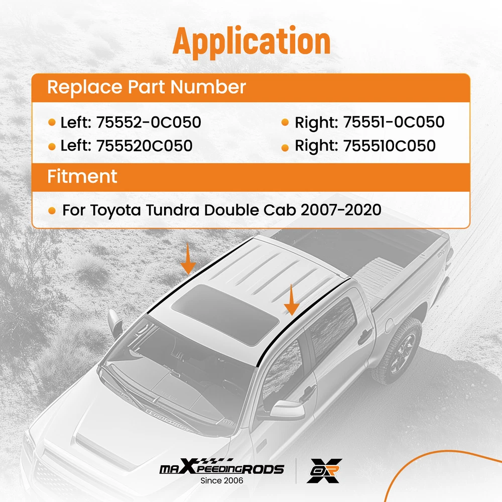 zjpss LOGO Home Contact us Promotion WHY CHOSE US Manufacturer We know our products Easy Return Quick, Simple Guaranteed Fitment Always the correct part PRODUCT DISPLAY 2x Roof Weatherstrip Molding for Toyota Tundra Double Cab 2007-2020 75552-0C050 Fast Shipping International Shipping 30 Days Return Policy Secure Shopping DESCRIPTION Product Specifications Product Type: Roof Trim Molding Material: Rubber Color: Black Placement on Vehicle: Left; Right; Roof Attachment Type: Clip-On Fitment Type: Direct Replacement Manufacturer Warranty: 1-Year Warranty Application for Toyota Tundra Double Cab 2007-2020 OE Number/Replace Part Number Left: 75552-0C050, 755520C050 Right: 75551-0C050, 755510C050 Package included 2* Roof Trim Molding (Left*1, Right*1) (Showing as the picture) *No instruction included. Feature >> Custom Fit Tailor-made for select models, ensuring a perfect fit and finish, enhancing the vehicle's aesthetics without compromising on style. >> Durable Construction Crafted from the highest quality materials, our roof trim is designed for strength and durability. It withstands the elements and the test of time, ensuring your vehicle looks great for miles to come. >> Easy Installation With a user-friendly design, our roof trim can be easily installed, saving you valuable time and effort. No special tools are required, making the process hassle-free. >> Weather Resistance Our trim is built to withstand a variety of weather conditions, protecting your vehicle's interior from the elements and enhancing its longevity. >> Quality Assurance Each piece is rigorously tested to meet industry standards, so you can trust in the reliability and performance of our roof trim. Note >> Please refer to the compatibility table to ascertain whether this part is suitable for your own vehicle, matching in year, make and model. >> Professional installation suggested. >> Please feel free to contact us for whatever we can help. SHIPPING US Domestic Shipping Notice - All items will be dispatched within 24hrs(Mon-Fri) Our carrier collects all the parcels at 4:30am PDT, any payment paid after 5:00am PDT will be shipped the next day at 4:30am PDT. If you paid Item Shipped On Est.Delivery Time Before Apr. 1st at 4:30am Apr. 1st at 5:00am Apr. 5th - Apr. 7th After Apr. 1st at 4:30am Apr. 2nd at 5:00am Apr. 6th - Apr. 8th If our estimated delivery time and eBay’s are contradictory,please refer to the standard delivery time of ours. Estimated Delivery Time From To Service Est.Delivery Time US US UPS or Fedex Ground 3-5 Business days Outside of US DHL FedEx 4-7 Business days Tracking number will be updated in 24 hours after shipment Please provide the following shipping information for your order Full physical address Telephone number Otherwise your shipment will be deferred. We are not responsible for any shipping lost caused by wrong shipping information Shipping rate If our ebay item listing doesn't show the shipping cost to your place. Please contact us to calculate the shipping fee for you. International Shipment For international shipment, we do not cover any import taxes or duties. Import tax is charged by the government, not us. Our item price and shipping cost do not include any import tax which will be charged by the shipping company when you got the parcel. Please be noted that is not the extra shipping fee. ` NO hidden charge!!! WARRANTY Free 2 Year Warranty: All AutoModPlanet products have 2 year warranty (unless otherwise stated). In the very unlikely event that you have a problem with our product, please contact us via eBay messages. Easy Return: If you are unhappy with your purchase for any reason, you can return it to us in an un-used condition in the original packaging within 30 days of purchase and we'll give you a refund or exchange. The refund/Exchange will not include postage/eBay costs. Please note you MUST contact us to obtain a Return Authorization Number before returning any part. Any parcel without the Return Authorization Number will be rejected. If your item is faulty or was incorrect, you must contact our sales representative before returning the parcel and we will endeavour to solve the problem effectively. Video or picture is required to show the item condition before we issue the Return Authorization Number. Important notice: 1. Any returned item(s) without Return authorization number will be rejected. 2. Please return your item(s) in original packaging and ensure that all packages are securely wrapped 3. We will not accept responsibility for loss or damage of goods during transit, please ensure that the insurance cover option is taken where possible 4. Upon receipt, all products will be inspected at our discretion in 3-5 business days. Then, the updated result will be informed. If you have made a mistake on purchase and wish to cancel the order before it is dispatched please contact us by ebay massages or email as quickly as possible. Note: All parcel will be collected by carrier at 8:00am on Monday to Friday. FAQ Will this fit my car? We have used the eBay compatibility list as a guide for buyers to use, but the eBay data system is not accurate and incomplete sometimes. Please make sure you have read through the whole listing and paid attention to “note” and “notice”. If there is any uncertain, please use the eBay message to check with our sales first. How much does delivery cost and how long will it take? You can check the delivery cost in the listing “Shipping and payments” section by selecting your country and entering your zip code. If it is not specified, please provide us your shipping address and zip code via eBay message. For US domestic shipping to 48 states, the delivery time is around 3-5 business days. The international shipment delivery time is around 4-7 business days. What payment methods do you accept? We currently only accept payment via PayPal. You can also use PayPal as a guest and pay using a debit or credit card. When will my order be dispatched? W