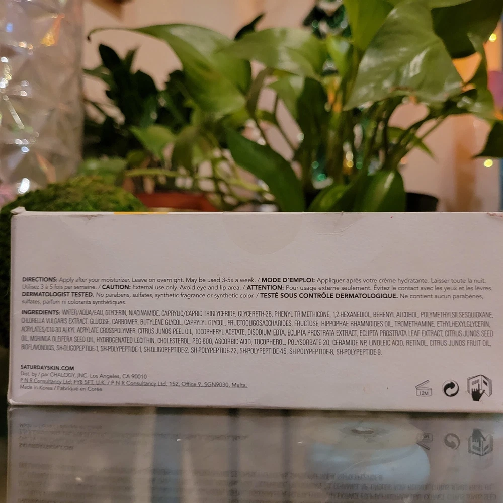 Saturday Skin Yuzu Vitamin C Sleep Overnight Face Mask Skin Care Retinol Niacinamide Face Moisturizer Brightening sleeping mask, Korean skin care, Vegan Smooth Skin About this item Vitamin C and Retinol: Invigorate your skin with our Vitamin C Sleep Overnight Face Mask enriched with Retinol. This blend of potent ingredients brightens and moisturizes, enhancing the youthfulness of your skin. Face masks Skincare Korean: Rooted in the Korean skin care tradition, this face mask is designed to reduce wrinkles and smooth skin, leaving you with a radiant complexion upon waking. Niacinamide and Glycolic Acid: Our face moisturizer is boosted with Niacinamide and Glycolic Acid, known for their skin-brightening and exfoliating properties, promoting a smoother skin texture. DERMATOLOGIST TESTED, Vegan and Cruelty-Free: This overnight facial mask is 100% vegan and cruelty-free, aligning with your ethical values. Indulge in beauty sleep with a clear conscience. POWERED BY 7 PEPTIDE MIX for Versatile Nighttime Care: Whether used as an overnight face mask, a sleeping mask, or a night cream, Our proprietary 7 peptide mix integrates easily into your nighttime skin care routine, rejuvenating your skin as you rest.