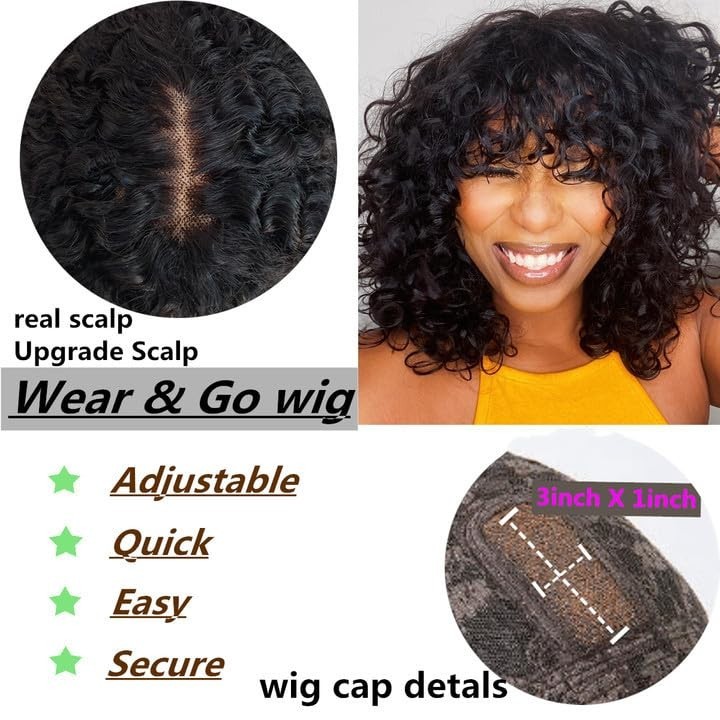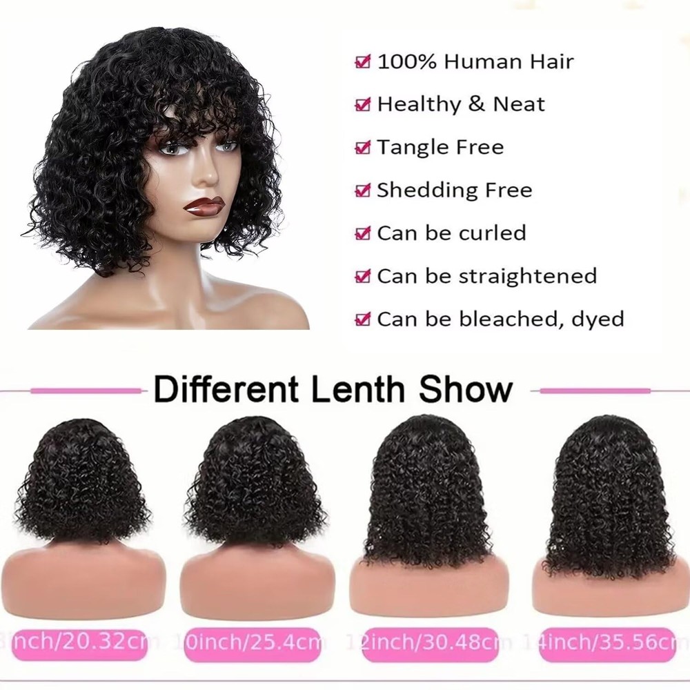 Hair Material: 100% Unprocessed Brazilian Virgin Straight Human Hair Short Bob Wigs With Bangs, Glueless Machine Made Wigs ,Hair Cut From Young Donor,150% Density Non Lace Front Wig For Black Women. Hair Style: Short Bob Human Hair Wigs with Bangs,The Length of Bangs is Slightly Longer According to the Head Circumference of Each Person So That You Can Trim the Length of the Bangs to fit your face,Full And Thick ,Natural And Healthy,No Shedding, No Tangles. Wig Cap:Medium Cap 22-22.5inch (Average Cap Size).With Combs And Adjustment Straps Can Be Intertwined To A Fixed Position ,And Can Be Adjusted To Different Head Sizes.suitable to wear at all times Hair Color&Length: Natural Color, Can Be Dyed, Bleached, Permed, Straightened, Curled Or Styled As Your Own Hair.The Length Of The Bangs Can Be Cut To Fit Your Face.8- 14 Inch Available. Hair Advantage:Machine Made Short Bob Wigs With Bangs,Comfortable And Breathable.Easy To Wear Without Glue, Can Fix Well With Side & Back Combs.You Can Adjust Elastic Straps To Fit Your Head Perfectly. Soft, Breathable, Comfortable, Light. Install Or Take Off Freely.