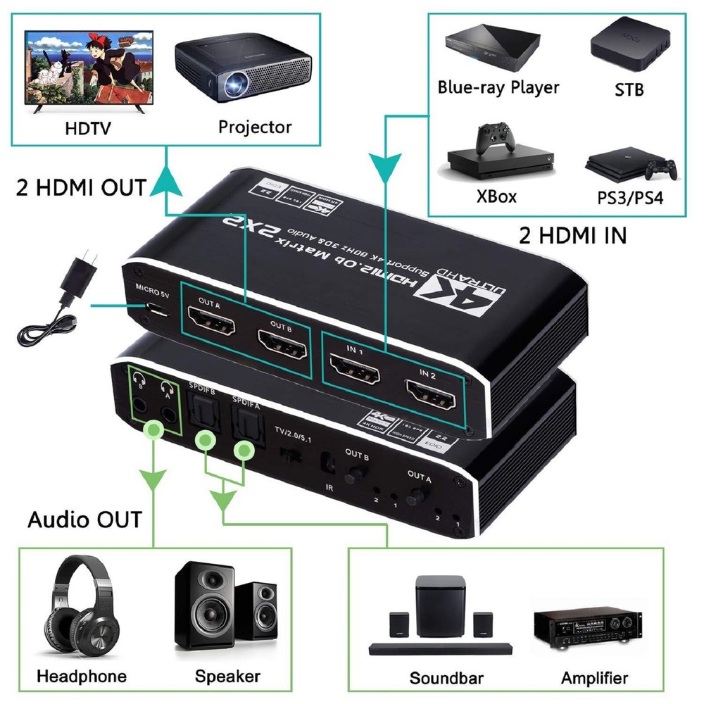 This 2x2 HDMI matrix switcher is a game-changer for my home entertainment setup! It effortlessly switches between my PS4 and laptop, delivering crisp 4K@60Hz video and immersive audio. The plug-and-play design makes setup a breeze, and the compact size fits perfectly behind my TV. I love how it supports 3D and multiple audio formats—perfect for movie nights. No lag, no signal loss, just flawless performance. Highly recommend for anyone needing a reliable HDMI switcher!