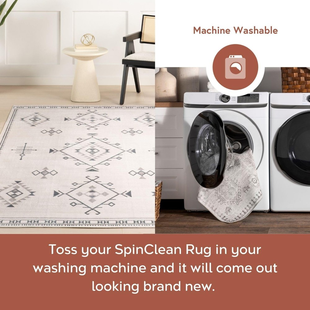 Introducing our SpinClean Machine Washable Collection, the ultimate blend of style, convenience, and practicality for any home. Designed with today's busy lifestyles in mind, this rug is more than just a beautiful addition to your space—it's a game-changer in home maintenance and comfort. SpinClean washable rugs are fully machine washable, making this a child-safe and pet-safe rug as well as the perfect high-traffic area rug. Gone are the days of worrying about spills and stains; simply place your rug in the washing machine, and it will come out looking as good as new. The ease of cleaning not only saves you time but also extends the life of your rug, ensuring that it remains a stylish feature in your home for years to come. Whether you're looking to add a pop of color with a living room rug, a touch of warmth to your bedroom, an inviting front door rug, or a functional runner for your kitchen, our collection has you covered. It’s machine washable and stain-resistant features, combined with a non-slip backing, make it an ideal choice for any home. Need a hall rug to enhance your hallway's look? Or perhaps a grey and white area rug to elevate your modern decor, these rugs offer versatility in any space. The SpinClean collection is proof that you don't have to break the bank to achieve a stylish, comfortable, and low-maintenance home environment. Stylish and Practical: The SpinClean Machine Washable Collection offers an affordable, low-maintenance solution without compromising on style. This collection features a wide array of designs, from vintage to southwestern, boho, abstract, and modern geometric. Machine Washable for Easy Care: Maintaining this rug is a breeze with regular vacuuming and spot cleaning to preserve its beauty. For tougher stains, just toss your rug in the washing machine on a gentle cycle with cold water. We recommend line drying or using the air-only drying cycle without heat. Designed for Every Room: This area rug is kid and pet-friendly, making it ideal for any space in your home that needs an elevated touch. It ensures lasting style in your living room, bedroom, dining room, kitchen, bathroom, home office, dorm room, as a hall runner or entrance rug. Sleek and Functional Pile Height: The low pile of this area rug brings a sleek, sophisticated touch while being easy to clean and maintain. Designed to be placed conveniently under furniture and doorways or as an indoor entrance rug, this is the perfect high traffic rug for your home. Stain-Resistant Material: Our machine washable rugs are crafted from synthetic materials that are stain-resistant, lightweight, and easy to clean. The stain-resistant properties ensure that the rug maintains its vibrant colors and patterns, even after enduring the demands of everyday use. If your rug is located in an area that receives direct sunlight, regularly rotate your rug to maintain its appearance. Durable Design with Non-Slip Backing: This rug’s power-loomed design is made to endure everyday wear and tear, ensuring long-lasting durability. The integrated non-slip backing keeps the rug securely in place while the reinforced, quality-stitched edges enhance its resilience. For added comfort, pair it with one of our rug pads for an extra cushioned feel underfoot.