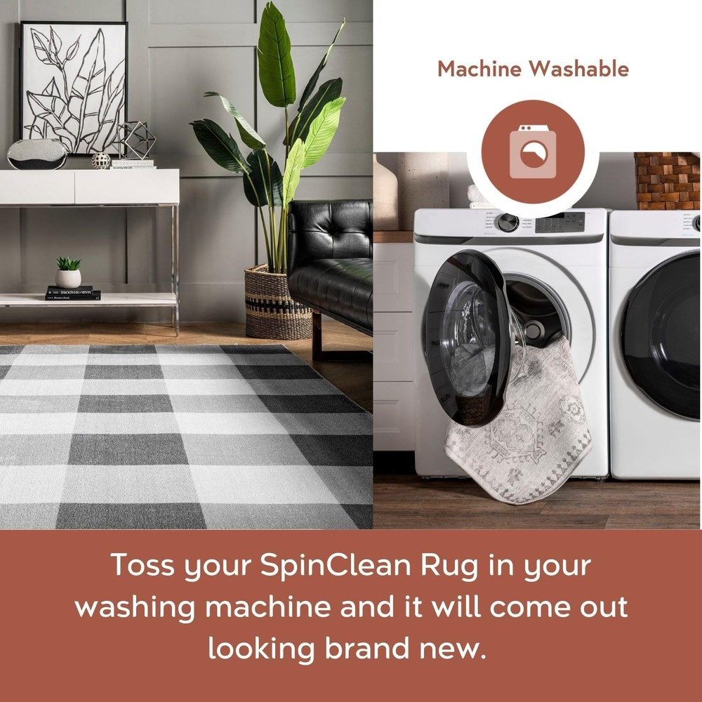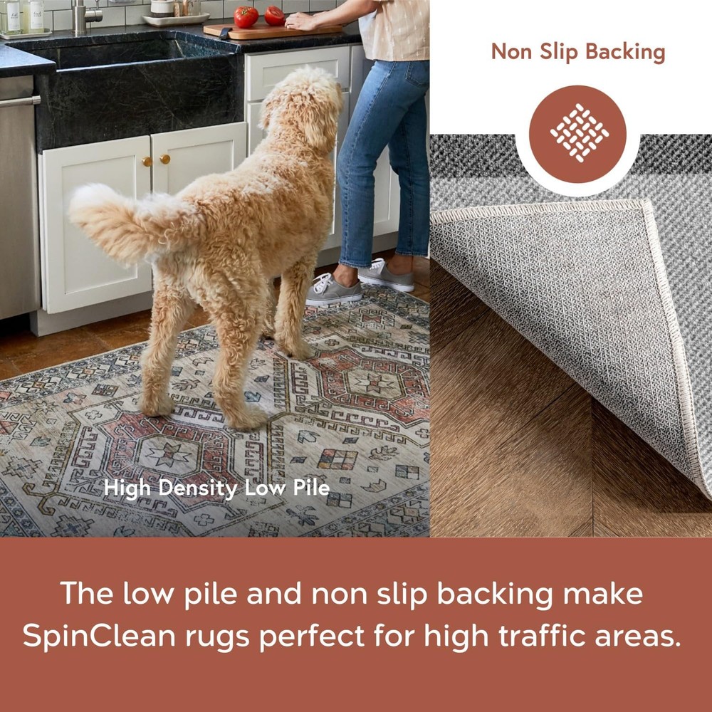 At , we believe that floor coverings and art should not be mutually exclusive. Founded with a desire to break the rules of what is expected from an area rug, was created to fill the void between brilliant design and affordability., The images we display have the most accurate colors possible.Rug Colors, sizes, patterns may vary slightly depending on how your rug is made and the size ordered.Due to different monitor resolutions and lighting you may notice a slight difference in color. Each handmade rug is unique to the artisan who weaved it.These are not considered defects Bunching, Creases and Folded Corners: You may see some creases and bunching in the pile and around the corners when you unroll your new rug. These waves will flatten within 2 -3 weeks as you begin to use your new rug. Use these tricks to help flatten your rug: Back Rolling: Roll the carpet out, then roll it back up reversely with the backside up. Let it sit rolled up reversely for a day or 2, or until it flattens out. Heavy Objects: Lay a piece of heavy furniture or objects on affected areas for a day or 2, or until it flattens out. If the corners are sticking up, curl them back and place heavy objects on affected areas going the opposite way. Heat: Use this technique as a last resort only. Place the rug over a cleared concrete or area like a driveway or sidewalk setting during dry sunny conditions. Allow the rug to be positioned for optimal sunlight as long as possible to give the rug time to absorb the sun's heat for up to 2 hours, but use more time if needed. Blow Dryer: If a large concrete patch with optimal sunlight is not accessible, flip the rug over and use a hair dryer to affected areas to heat up the creases. Always hold the hair dryer 7 to 12 inches away from the rug going side to side on a medium setting, as heat can sometimes cause backing to melt. Stylish and Practical: The SpinClean Machine Washable Collection offers an affordable, low-maintenance solution without compromising on style. This collection features a wide array of designs, from vintage to southwestern, boho, abstract, and modern geometric. Machine Washable for Easy Care: Maintaining this rug is a breeze with regular vacuuming and spot cleaning to preserve its beauty. For tougher stains, just toss your rug in the washing machine on a gentle cycle with cold water. We recommend line drying or using the air-only drying cycle without heat. Designed for Every Room: This area rug is kid and pet-friendly, making it ideal for any space in your home that needs an elevated touch. It ensures lasting style in your living room, bedroom, dining room, kitchen, bathroom, home office, dorm room, as a hall runner or entrance rug. Sleek and Functional Pile Height: The low pile of this area rug brings a sleek, sophisticated touch while being easy to clean and maintain. Designed to be placed conveniently under furniture and doorways or as an indoor entrance rug, this is the perfect high traffic rug for your home. Stain-Resistant Material: Our machine washable rugs are crafted from synthetic materials that are stain-resistant, lightweight, and easy to clean. The stain-resistant properties ensure that the rug maintains its vibrant colors and patterns, even after enduring the demands of everyday use. If your rug is located in an area that receives direct sunlight, regularly rotate your rug to maintain its appearance. Durable Design with Non-Slip Backing: This rug’s power-loomed design is made to endure everyday wear and tear, ensuring long-lasting durability. The integrated non-slip backing keeps the rug securely in place while the reinforced, quality-stitched edges enhance its resilience. For added comfort, pair it with of our rug pads for an extra cushioned feel underfoot.