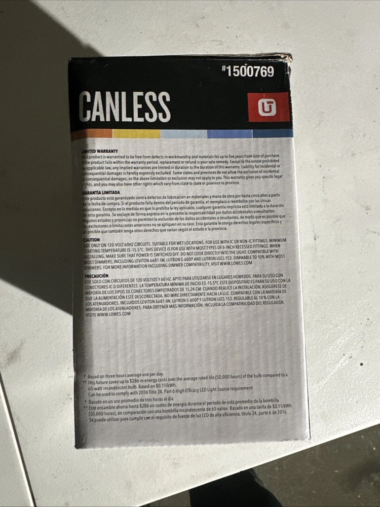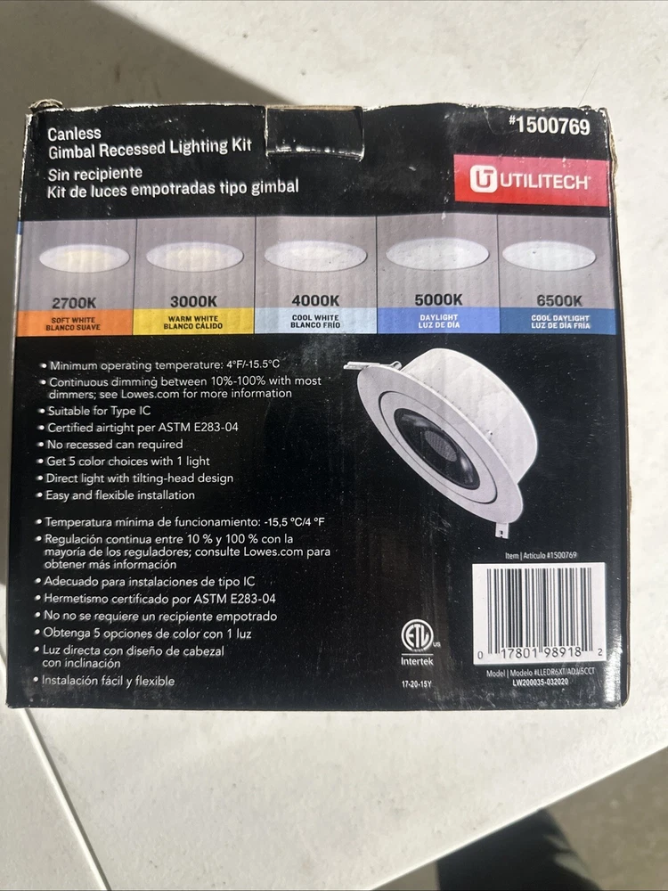 This is a modern Utilitech Canless Recessed Light Kit with a 6" diameter. It is dimmable with 5 settings and features a switch control. The LED light has a color temperature ranging from 2700k to 6500k, providing options from warm white to ultra daylight. With a power source of hardwired installation, this light fixture is suitable for indoor use in any room. It includes one unit and offers 850 lumens of brightness.