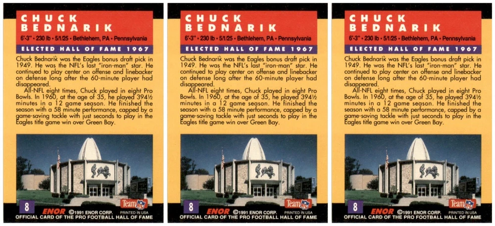 (3) 1991 ENOR Pro Football HOF #8 Chuck Bednarik Philadelphia Eagles Card Lot Condition: NM-MT