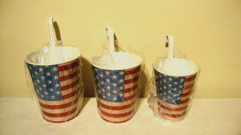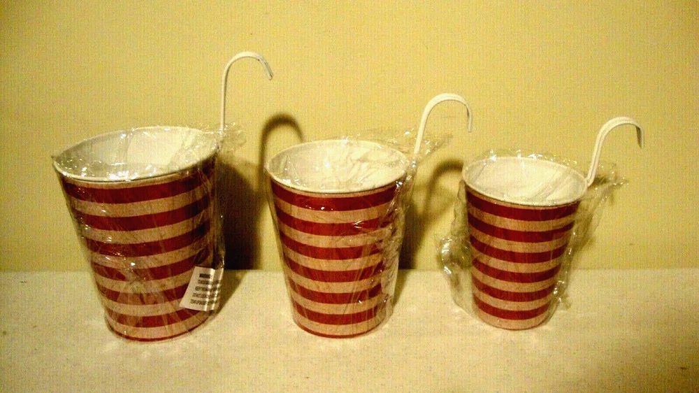 Here is a new set of 3 hanging planters, these are made of metal and each has an attached hook that will hang, these have american flag design and has a white finish insides, these measure as follows, large- 9" H x 5.5 " x 8" med- 8.5" H x 5" x 7", small- 7.5" H x 4.5" x 6" , nice set of hanging planters and are for indoors only and could add greens, etc and check out my many other nice Decor and Lighting.