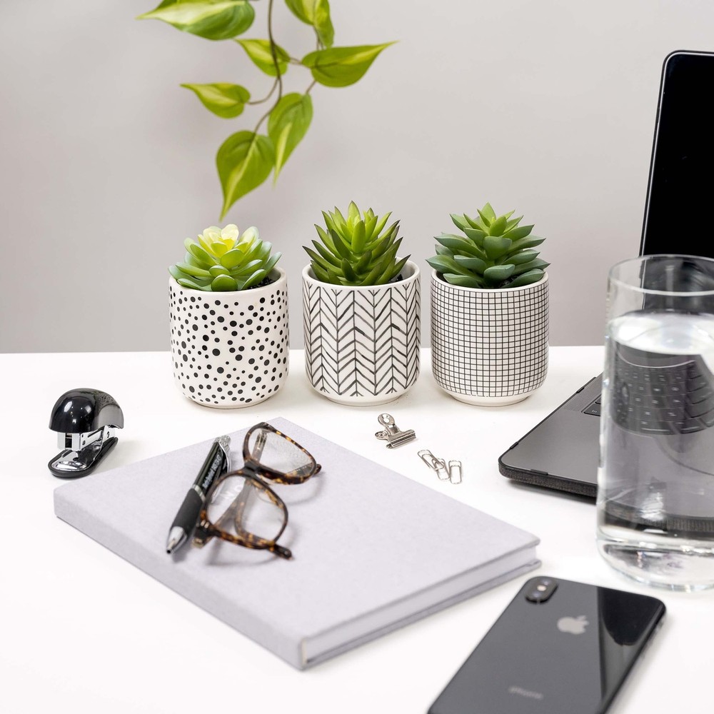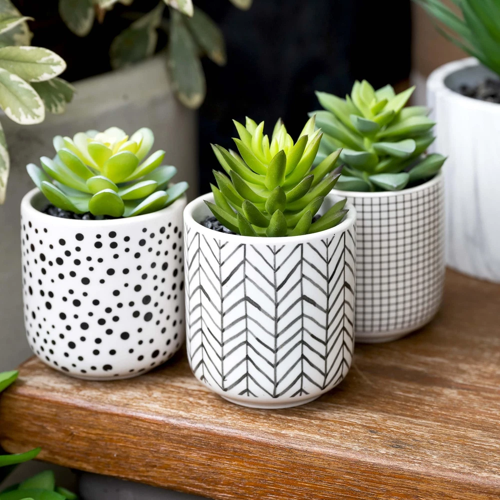 HIGH QUALITY - Small faux plants in gorgeous pots for shelf decor are our specialty. If you are looking to add some greenery to your knick knacks for shelves, these cute little potted plants are perfect SO LIFE-LIKE - Are you looking for really natural looking artificial plants? Our natural looking set of 3 decorative fake plants look so real. They look great in front of a chopping board on the kitchen counter top WOW FACTOR - faux potted plants - succulents artificial in ceramic pots - add elegance to any home decor. They look especially nice as office desk decor SUPER CUTE AND PERFECT SIZE - 4.75" high - these cute mini succulents in black and white pots suit book shelf decor, bathroom decor, dorm decor, mantle decor, or office desk decor SAVE TIME - This beautiful fake succulent set is effortless to maintain. No watering SAVE MONEY - Our artificial plants last for years. No more replacing plants GREAT GIFT - Artificial plant decor makes a superb present - a faux potted plant is a great mothers day gift for mom, or a perfect house warming present 100% HAPPINESS GUARANTEE - If you don't love your artificial potted succulent plant please contact us and we will make it right straight away.