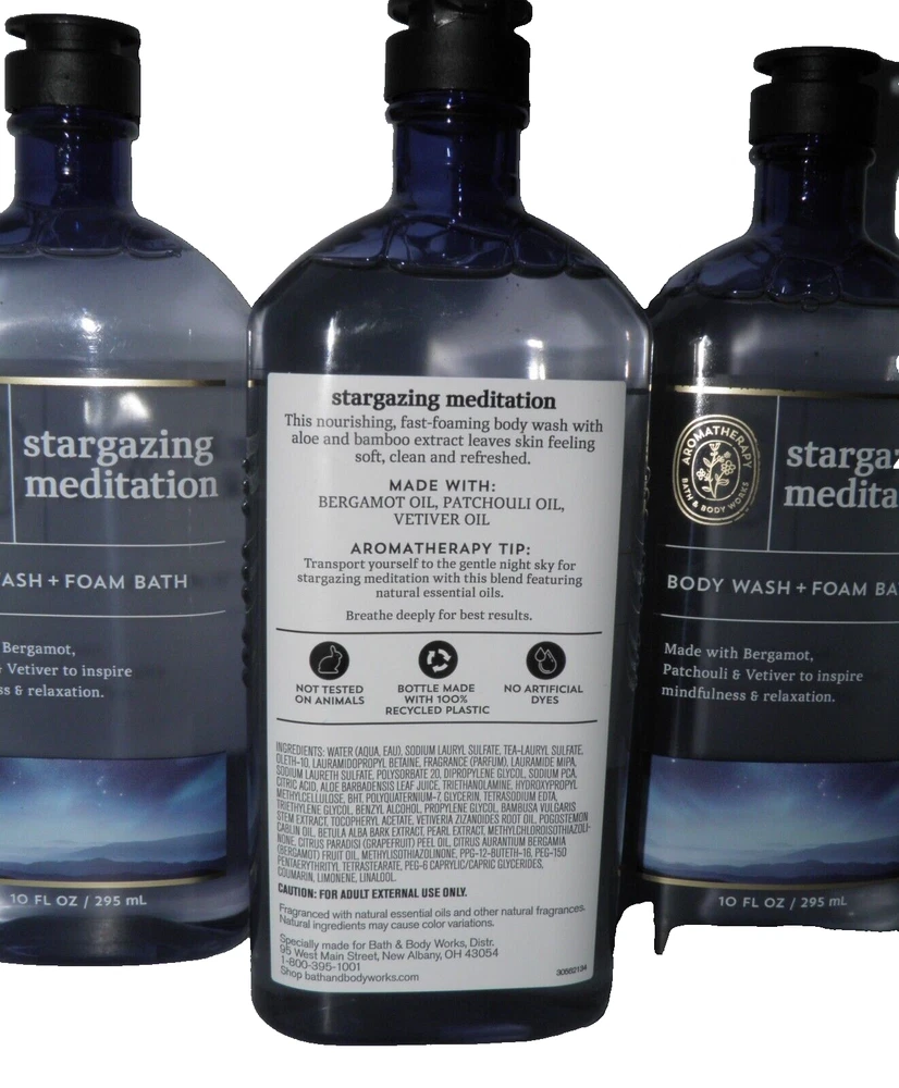 x3 Bath & Body Works Stargazing Meditation Body Wash Foam Bath Gel Aromatherapy 3 x 10 fl oz per order Mailing Address - We will ONLY ship to the address on file with eBay. Before making a purchase, please ensure that your address is correct. We may otherwise cancel the sale. Handling Time - Our handling time is set to THREE BUSINESS DAYS. We ship packages Monday - Friday, except on holidays. This listing is NOT sponsored by, affiliated with, or representative of the mentioned brand(s), trade name(s), or trademark(s) and does not claim any ownership of such. All trademarks or brands mentioned in this listing are registered trademarks of their original owners who reserve all their rights and ownership. The use or mention of any trade name, product name, or trademark is necessary for identification and is for reference purposes only.