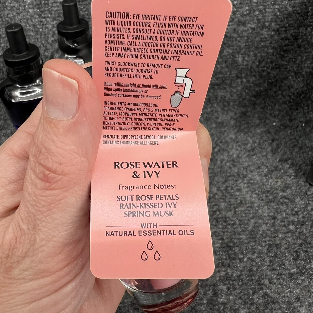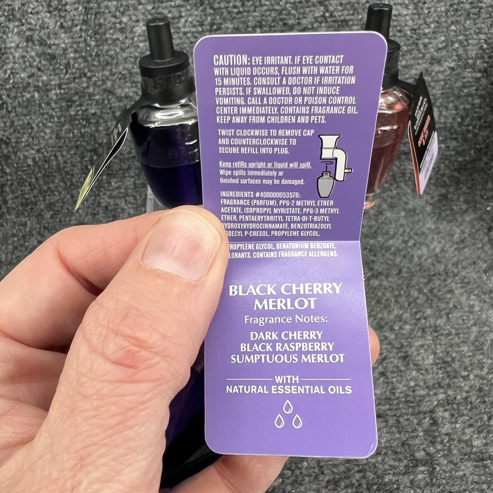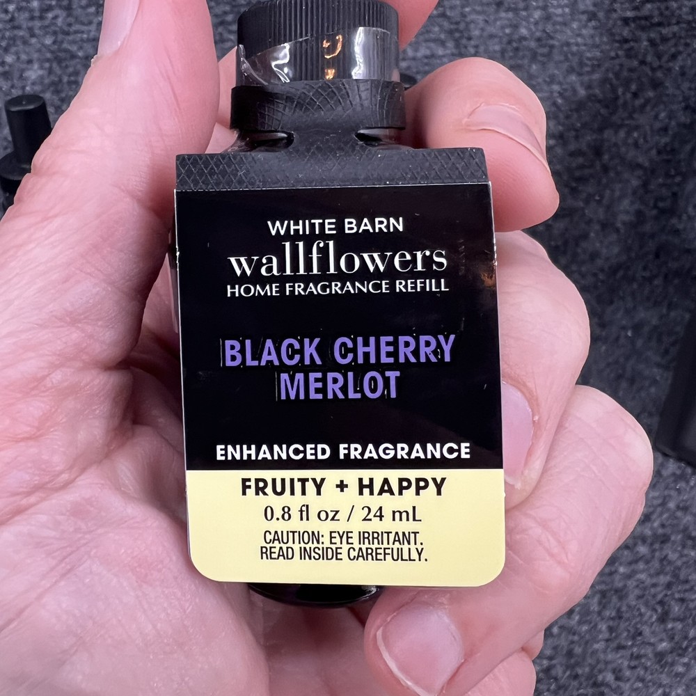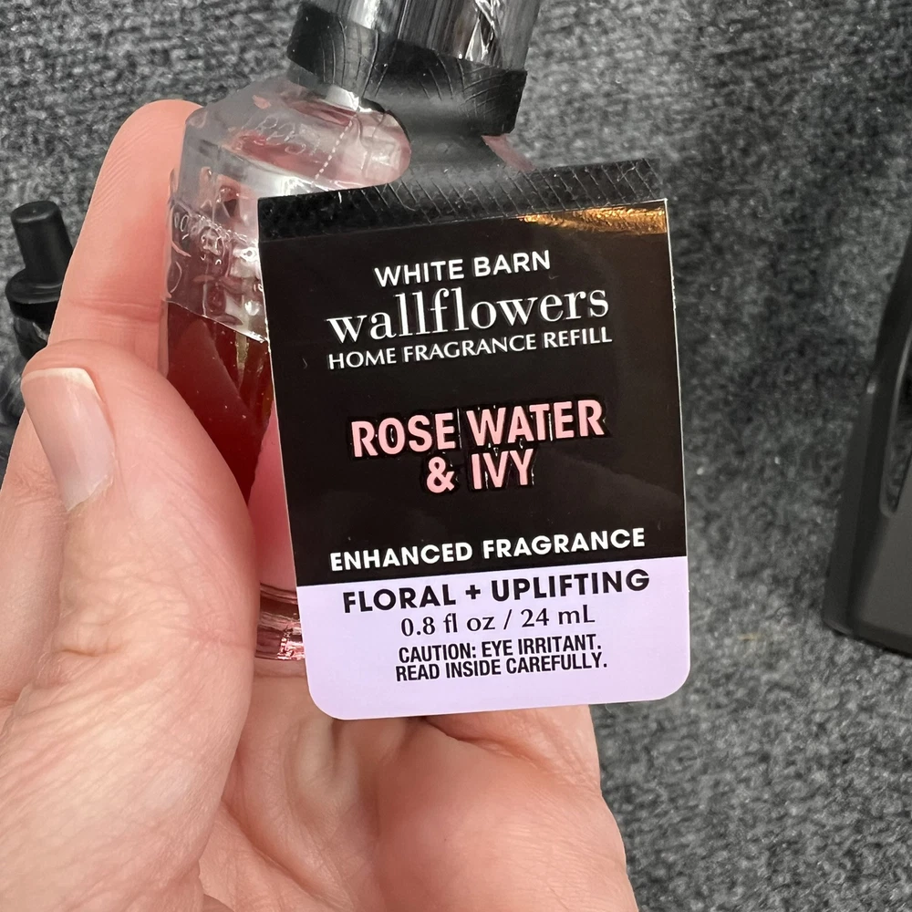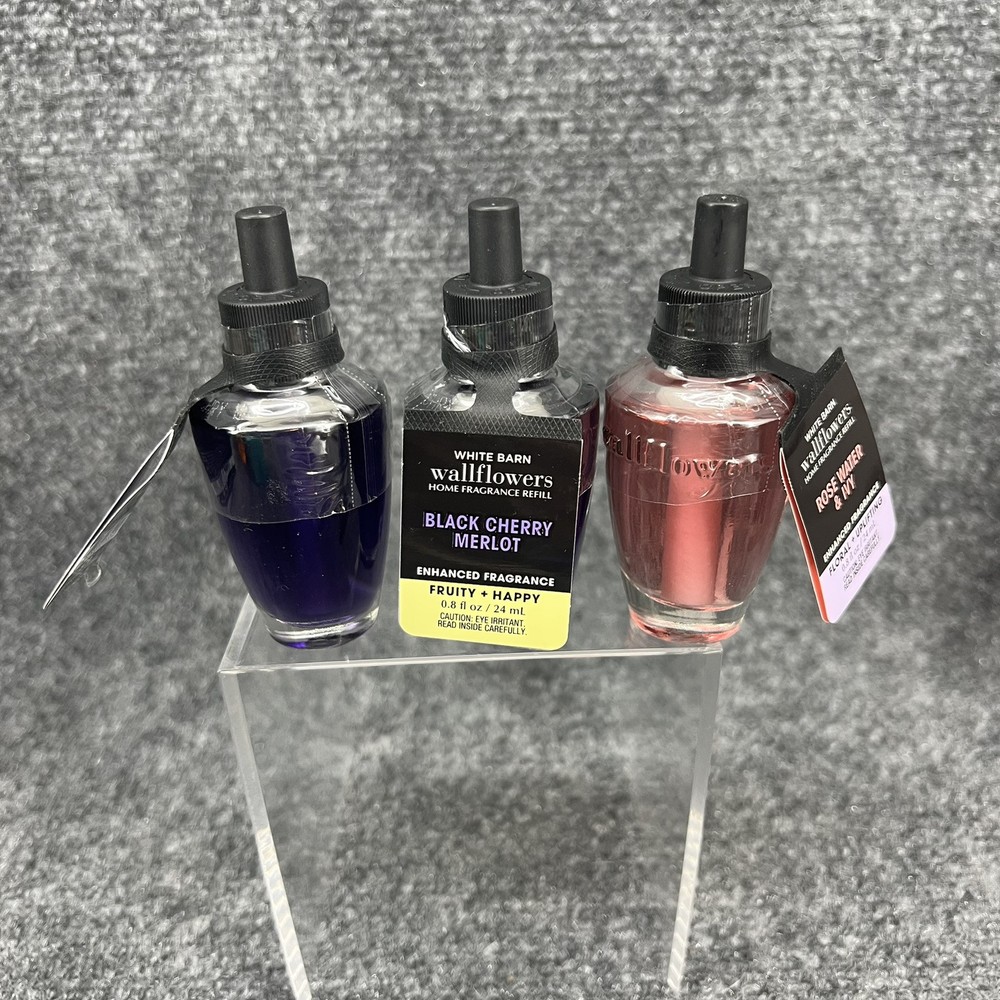 Lot of 3- Bath & Body Works Wallflower Fragrance Refills - (2) Black Cherry Merlot & (1) Rose Water Ivy. All 3 are brand new & still sealed. They are to be used with any of the Bath & body works or white barn fragrance plug (not included)- they will not work with Glade or Air Wick or any other plug in from the store. Please refer to the pictures for further.