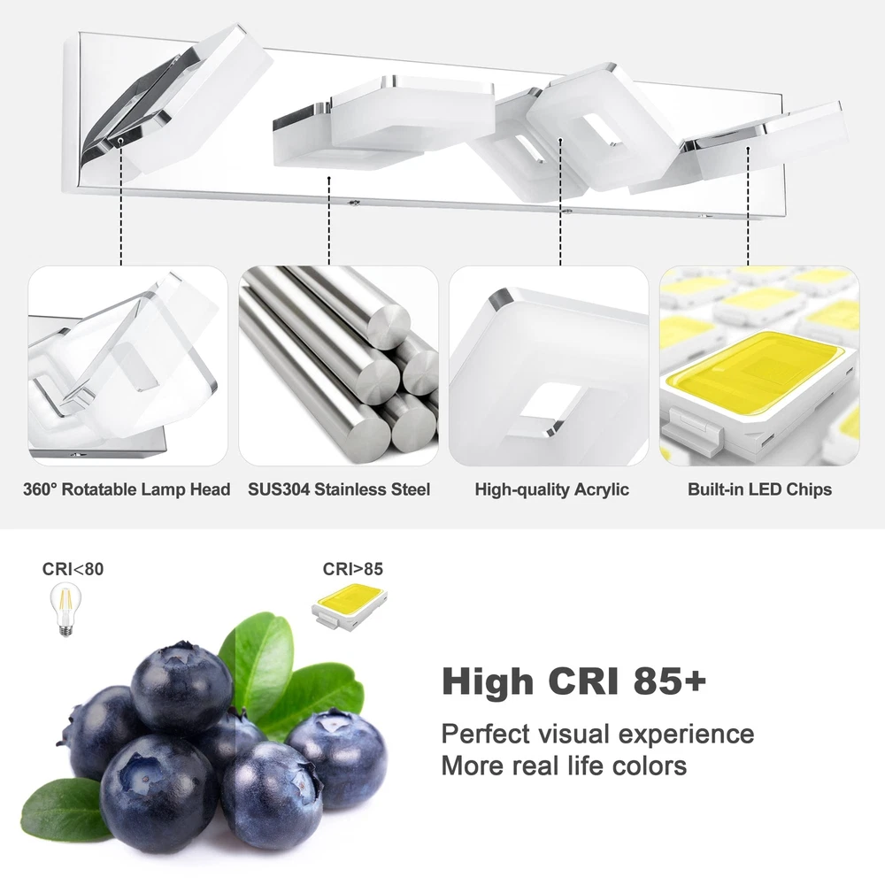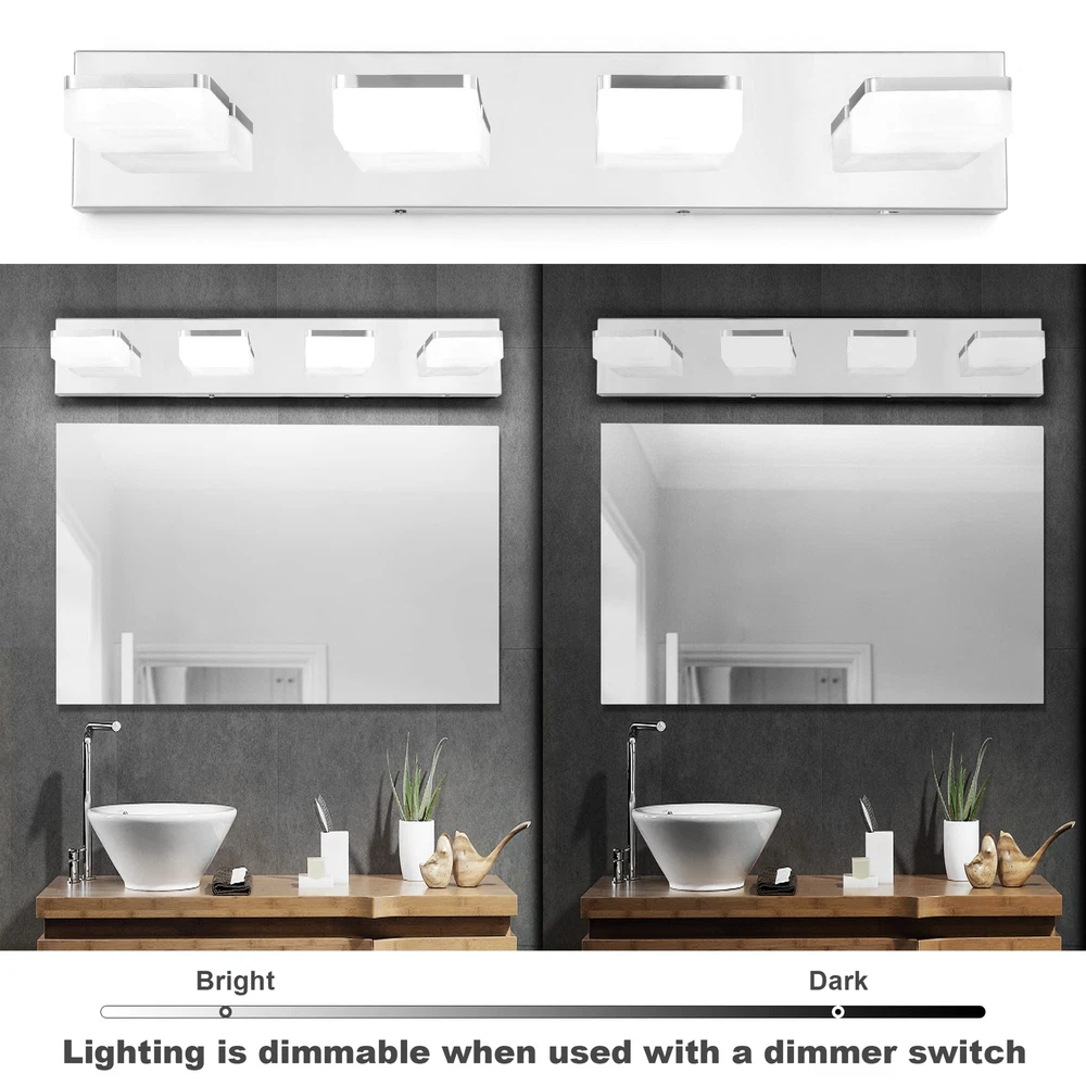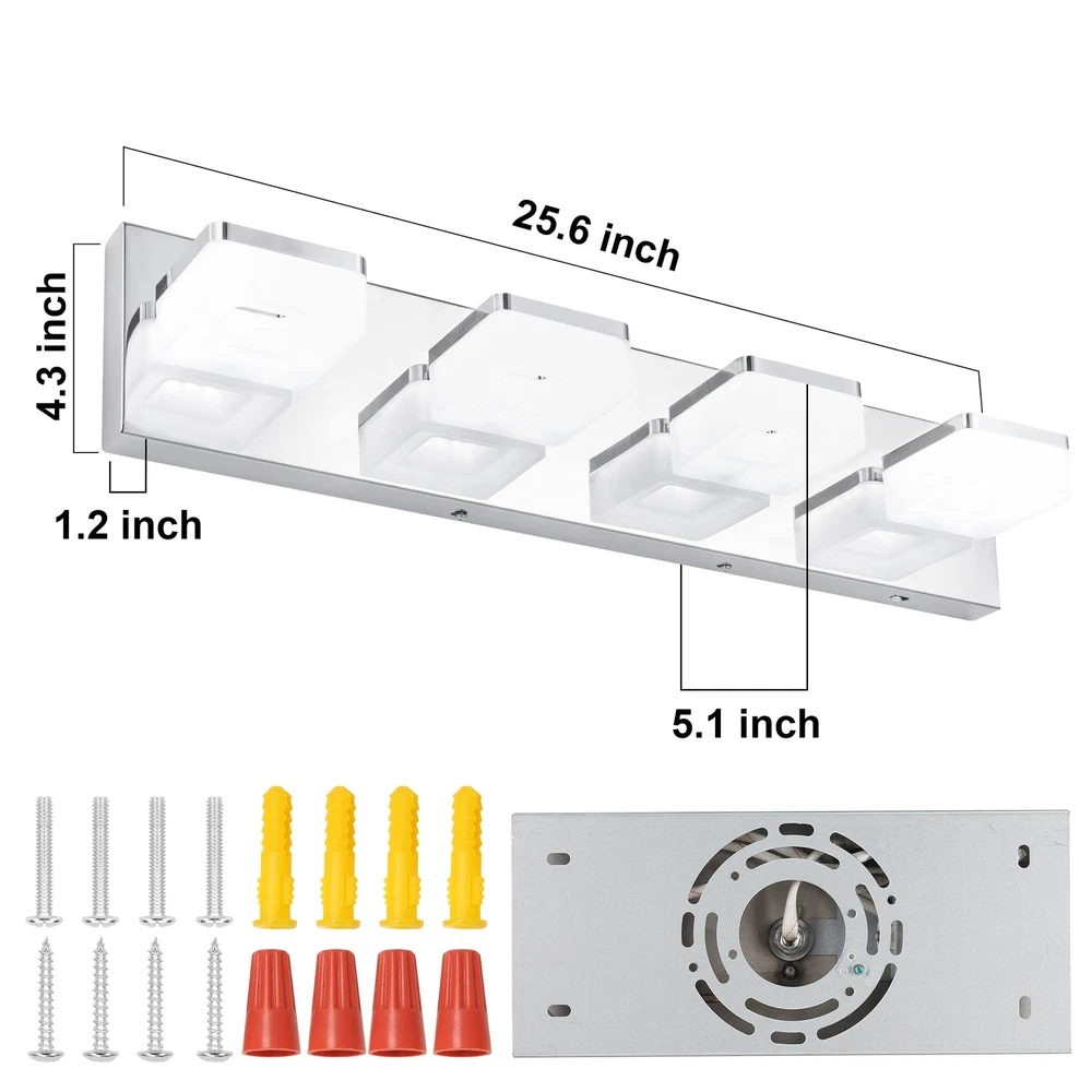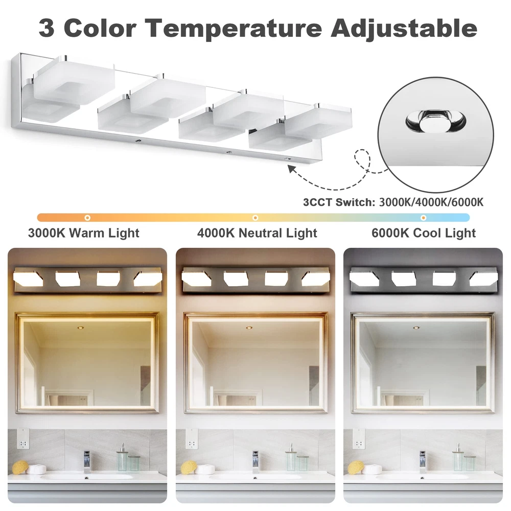 ใ€๐€๐๐ฃ๐ฎ๐ฌ๐ญ๐š๐›๐ฅ๐ž ๐Ÿ‘ ๐‚๐จ๐ฅ๐จ๐ซ ๐“๐ž๐ฆ๐ฉ๐ž๐ซ๐š๐ญ๐ฎ๐ซ๐žใ€‘Bathroom vanity light can customize your lighting experience, come with 3 color temperature 6000K cool light, 4000K neutral light, 3000K warm light. Compared with single color, this is more practical. You can choose the right light to meet different lighting needs. ใ€๐…๐ฎ๐ฅ๐ฅ๐ฒ ๐ƒ๐ข๐ฆ๐ฆ๐š๐›๐ฅ๐ž ๐•๐š๐ง๐ข๐ญ๐ฒ ๐‹๐ข๐ ๐ก๐ญ๐ฌใ€‘Bathroom lights over mirror is dimmable when used with a dimmer switch, adjust the brightness from 10%-100%, satisfy all your light needs. Whether in the bathroom, mirror cabinets, dressing room, bedroom, or living room, you can find the perfect light for your needs. Not Included Dimmer Switch. ใ€๐’๐ฉ๐ž๐œ๐ข๐Ÿ๐ข๐œ๐š๐ญ๐ข๐จ๐ง๐ฌใ€‘Backplate Size: 25.6" (L) x 4.3" (W) x 1.2" (H); โžคDistance From Wall: 5.1"; โžคMaterial: Acrylic + SUS304 Stainless Steel; โžคColor Temperature: 3000K/4000K/6000K; โžคDimmable: Yes; โžคWattage: 24W; โžคLumen: 1920LM; โžคInput: 120 V (AC), 60Hz; โžคCRI: >85; โžคLight Source: 2835SMD LED Chips; โžคLight Direction: Adjustable ใ€๐‡๐ข๐ ๐ก-๐ช๐ฎ๐š๐ฅ๐ข๐ญ๐ฒ ๐š๐ง๐ ๐๐ซ๐ข๐ ๐ก๐ญ๐ž๐ซใ€‘Modern bathroom light is made of high-quality acrylic and SUS304 stainless steel, classic chrome finish, excellent electroplate craft and sealing technology, anti-fog, moisture-proof, dust-proof and rust-proof. High-quality 2835SMD LED chips and frosted white acrylic lampshade make brighter light, save more energy. Soft light, no flicker, no dazzle, which can effectively protect your eyes and create comfortable atmosphere. ใ€๐Ÿ‘๐Ÿ”๐ŸŽยฐ ๐‘๐จ๐ญ๐š๐ญ๐š๐›๐ฅ๐ž ๐‹๐š๐ฆ๐ฉ ๐‡๐ž๐š๐ใ€‘Bathroom light fixture with 360ยฐ adjustable lamp head, you can move the light exactly where you need it. Rotate the head to illuminate any place, no longer worry about the inconvenience caused by the fixed angle of the lamp head. ใ€๐„๐š๐ฌ๐ฒ ๐ญ๐จ ๐ˆ๐ง๐ฌ๐ญ๐š๐ฅ๐ฅใ€‘Vanity light fixture is hardwired, with installation back plate, just connect directly to the reserved wire, fit US standard junction box, easy to install. All installation parts are included. Also comes with white gloves so no finger prints on the fixture during installation. Installation is very easy, just the instructions. Please feel free to us if you need any assistance. ใ€๐Ÿ๐Ÿ’ ๐Œ๐จ๐ง๐ญ๐ก๐ฌ ๐–๐š๐ซ๐ซ๐š๐ง๐ญ๐ฒ ๐†๐ฎ๐š๐ซ๐š๐ง๐ญ๐ž๐ž & ๐‹๐ข๐Ÿ๐ž๐ญ๐ข๐ฆ๐ž ๐‚๐ฎ๐ฌ๐ญ๐จ๐ฆ๐ž๐ซ ๐’๐ฎ๐ฉ๐ฉ๐จ๐ซ๐ญใ€‘If you have any quality problem within 24 months, please feel free to . We provide support, we will surely address your issue until 100% customer satisfaction.