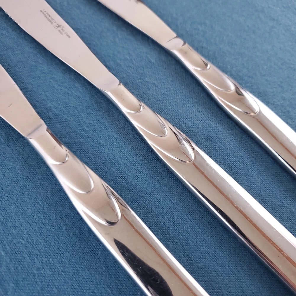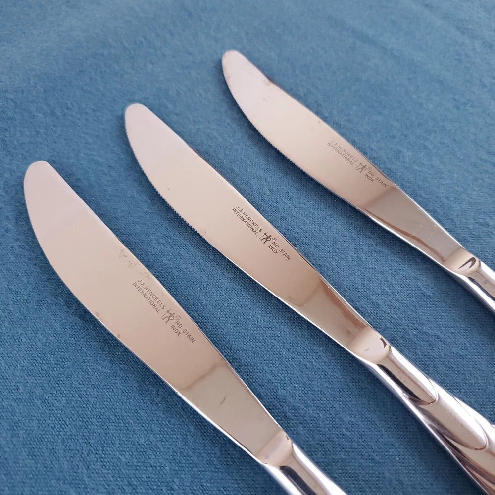 (3) Dinner Knives Solid JA Henckels Zwilling RAPTURE Stainless China Some staining on blades, see photos. Overall good condition. Please view the photos carefully for condition details. Don't forget to check out the other items in my shop. I'm getting in new fun things all the time. Thank you for looking! Have a great day!
