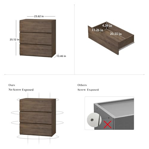 Return Policy Fast Delivery Trusted seller 3 Drawer Dresser, Wood Chest Drawers with Storage for Closet, Bedroom, Living Room and Hallway, Drawers Dresser Bedside Nightstand, Walnut, Brown Product Description SUFFICIENT STORAGE: With a generous tabletop and three exceptionally deep drawers, this 3-drawer bedroom chest provides ample storage space for organizing sundries and accessories. Additionally, it adds a touch of glamour to your living space. STURDY STRUCTURE: Crafted from high-quality MDF wood and equipped with quality hardware, this contemporary 3-drawer dresser ensures exceptional strength and enduring durability. Each drawer has a capacity of up to 35 lbs. MODERN DESIGN: Designed with sleek lines and a minimalist flat-front style, this drawer chest seamlessly blends into any decorative theme. Its distinctive cut-out handles and elegant beveled base contribute to a contemporary, clutter-free aesthetic for your space. MULTI-FUNCTIONAL FURNITURE: Beyond serving as a storage dresser, this versatile piece can double as a tall nightstand beside your bed, a side end table in the living room, or easily complement other cabinets in the collection for a cohesive look. This 3 drawer dresser measures 23.62W 13.46D 25.12H inches. Shipping Returns Payment Shipping Shipping is FREE to all addresses other than APO/PO boxes in the lower 48 states. All our stock ships from US-based warehouses. Shipped via USPS or UPS (depending on location and package weight) Unless stated otherwise, all orders will ship within 24-72 hours of your payment being processed. Check our feedback to see the great reviews of FAST shipping we offer. Returns Seller does not accept returns Payment We currently accept payment via eBay managed payments only. Once payment is cleared, we will dispatch your shipment within 1-3 business days. Please refer to the "Shipping" tab for more information regarding shipping speed to your destination.