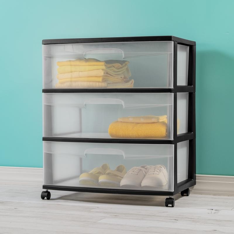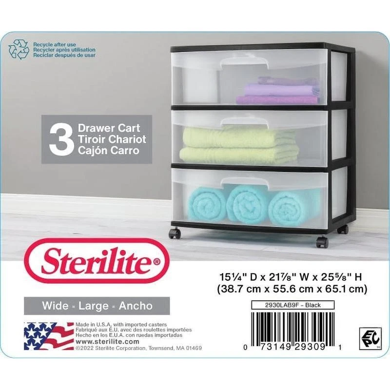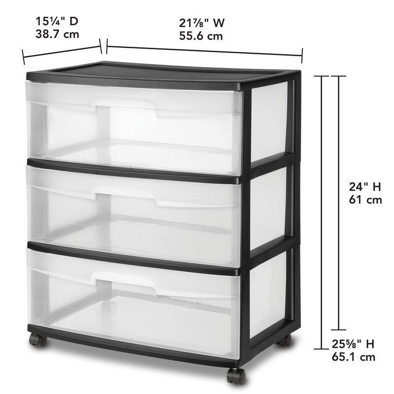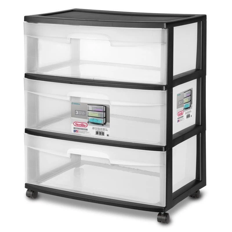 You may also like Large Clear Storage Bins W/ Scoop Front Easy Access 6 Count Plastic Organizers 35.2 USD 37.05 USD Free shipping 5% off 12 Qt Stackable Plastic Storage Bins 2 Pack W/ Handles Clear Organizers New 13.98 USD 14.72 USD Free shipping 5% off 6 Pack Ice Cube Bin Space Efficient Stackable Freezer Organizer BPA Free New 19.84 USD 20.88 USD Free shipping 5% off 2*6 Pack Small Plastic Storage Bins Decorative Organizers W/ Handles Home Office 22.47 USD 23.65 USD Free shipping 5% off 3PC Lidded Storage Bins Set of 2 Stackable Plastic Organizers Home Office Decor 39.55 USD 41.63 USD Free shipping 5% off Stackable Clear Plastic Pantry Organizing Bins Storage Set of 3 Home Use 29.43 USD 30.98 USD Free shipping 5% off Durable Portable Footlocker Storage Box W/ Wheels Camping College Moving New 37.22 USD 39.18 USD Free shipping 5% off 5 Pack Medium Stacking Baskets Open Plastic Storage Organizers Space Saving Bins 32.27 USD 33.97 USD Free shipping 5% off 3 Pack Decorative Large Plastic Versatile Storage Bin White 0.9 Lbs Durable 19.57 USD 20.6 USD Free shipping 5% off Plastic Cubby Bin Storage Organizer Classroom Craft Toy Shoes Set of 5 New 29.52 USD 31.07 USD Free shipping 5% off Durable Woven Storage Bin W/ Handles Organizer Home Toys Clothes Blankets New 19.0 USD 20.0 USD Free shipping 5% off Stackable Plastic Storage Baskets Open Organizer Bin Home Office Pantry 2 Pack 13.1 USD 13.79 USD Free shipping 5% off The Sterilite 3-Drawer Wide Cart Black offers a practical and versatile storage solution to your home. This product is ideal for organizing and storing a variety of household items that are frequently used in bedrooms, attics, garages, kitchens, pantries, bathrooms, craft rooms, nurseries or dorm rooms. The Sterilite 3-drawer cart features clear drawers that allow contents to be easily identified while keeping them contained. Keep clothing, towels, craft supplies, toys and more organized and neatly stored. The 3 drawer storage cart has a stop feature that prevents drawers from being accidentally pulled all the way out. It also comes with four wheel casters that allow for it to be rolled easily over most surfaces from one area to another. The Sterilite 3-Drawer Wide Cart Black measures 15. 25" L x 21. 875" W x 24" H. Sterilite 3 Drawer Wide Cart Black: Measures 15. 25" L x 21. 875" W x 24" H Sterilite 3-drawer cart is a multi-purpose and versatile storage option for any room of the home Clear drawers allow contents to be easily identified Easy pull-out handles with drawer stops to prevent drawers from being removed accidentally 4 wheel casters allow 3-drawer storage cart to be easily moved over almost any surface Ideal to use in bedrooms, attics, garages, kitchens, pantries, bathrooms, craft rooms, nurseries or dorm rooms Sterilite 3-Drawer Wide Cart Black is ideal for storing a variety of household items You may also like Stainless Steel Serving Fork Set of 4 Durable Dishwasher Safe Kitchen Utensils 14.51 USD 15.27 USD Free shipping 5% off 1 Gallon Extreme Degreaser Cleaner Professional Strength Non-Abrasive Surfactant 15.42 USD 16.23 USD Free shipping 5% off Bardstown Dining Side Chair Plush Cushion Durable Wood Easy Maintenance Comfort 156.49 USD 164.73 USD Free shipping 5% off 3 Pack Low Sugar Milk Chocolate Truffles Keto Friendly 12 Count Delicacy Treats 28.87 USD 30.39 USD Free shipping 5% off High-quality Glass Carafe W/ Rubber Wood Stopper Water Juice Cocktail Home Bars 22.04 USD 23.2 USD Free shipping 5% off Utility Wraparound Light 2ft 15.8W LED 1790 Lumens Energy Star Indoor Lighting 34.9 USD 36.74 USD Free shipping 5% off OEM 8 Inch Self Propelled Drive Wheel Troybilt Snapper Yard Machine Murray New 42.0 USD 44.21 USD Free shipping 5% off Crossmill Coffee Table W/ Storage Retro Rectangle Wood Indoor Furniture New 197.9 USD 208.32 USD Free shipping 5% off Hanging Towel Rack 6 Towel Holder Rust Resistant PVC Bathroom Storage Solution 105.93 USD 111.51 USD Free shipping 5% off Solid Shag Indoor Area Rug 5x7 Stain Resistant Non-Slip Backing Tufted Design US 52.98 USD 55.77 USD Free shipping 5% off Professional Makeup Case 4 Retractable Trays 1 Drawer Organizer Lockable New 99.65 USD 104.89 USD Free shipping 5% off Medium Roast Ground Coffee 40.3oz Airtight Container Fresh Flavor Ideal Brew New 25.52 USD 26.86 USD Free shipping 5% off