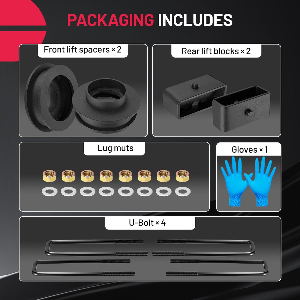 Specifications: Quantity: Four (4) Front lift kit real thickness: 2.52" Front lift kit raise height: 3" Rear lift kit real thickness: 2" Rear lift kit raise height: 2" Material: 6061-T6 Aerospace Grade Aluminum. Important Note: Due to suspension geometry, the ratio of the lifting height to the thickness of the lift kit is not 1:1. 【Increase the height of your Car】: These will raise the front of your truck by 3 inch and the rear of your truck by 2 inch, Because of suspension geometry,the ratio between lift height and kit thickness is not 1:1. 【Aggressive look】: Once you install it on your truck,it will give your truck a cool look.Accurate numerical control precision and high quality, ensure your driving safe and comfortable. 【Process and Material】: Forged from 6061-T6 aluminum alloy,CNC automatic processing,surface anodic oxidation and heat treatment,not only ensure high precision and stability,but also enhance the hardness and corrosion resistance of the material. 【Warranty and Services】: All Leveling kits are covered by 2 years warranty,Please feel free to contact us with any questions regarding our products and services. Specifications: Quantity: Four (4) Front lift kit real thickness: 2.52" Front lift kit raise height: 3" Rear lift kit real thickness: 2" Rear lift kit raise height: 2" Material: 6061-T6 Aerospace Grade Aluminum. Important Note: Due to suspension geometry, the ratio of the lifting height to the thickness of the lift kit is not 1:1. Payment Delivery details Terms of sales About us Contact us Payment 1.We only accept PayPal. PayPal is the only online payment method we accept. Please make sure you have a valid/confirmed PayPal account prior bidding. 2.All Paypal Payments must be Confirmed. Payment must be made within 48hrs of the auction end time. Non-Paying bidders will be reported. 3.When you get your package,maybe you will pay some charges, it's taxes for local customs,not pay to us, and the fees are depends on the customs, all buyer are same. Delivery details 1.Items will be shipped within 2 business days after payment is received. 2.We ship to your eBay address. Please make sure your eBay address is correct. Buyer takes responsibility if eBay address is wrong. 3.Import duties, taxes and charges are not included in the item price or shipping charges. Please check with your country customs office for these additional charges. 4.We shipping using UPS or USPS from our nearest warehouse to you. Tracking numbers will be emailed upon shipment. Terms of sales 1.Please feel free to email us if you have any question. 2.We appreciate you contact us via eBay message when you are not satisfied rather than open case or leave negative feedback directly. We'll try our best to solve the issue. 3.Refund will be issued once we receive your returned items. Buyer is responsible for all return shipping charges. 4.Please contact us for return process before you return the item. 5.All items for exchange or refund must be returned in "as new" condition. About us We are the responsible seller ,always provide high-quality products and best service .If you have any questions, please contact us, and will try our best to help you. Please contact us by eBay Message, and we will reply you within 24 hours. Thank you very much! Contact us We are the professional auto parts manufacturer , and provide line lock, AN hose end fittings , fuel line , fuel filter , fuel regulator , exhaust cutout , exhaust tips , exhaust muffler and so on .The quality of the product to be secured. If you have any questions or any needs , please contact us , and will try our best to help you.