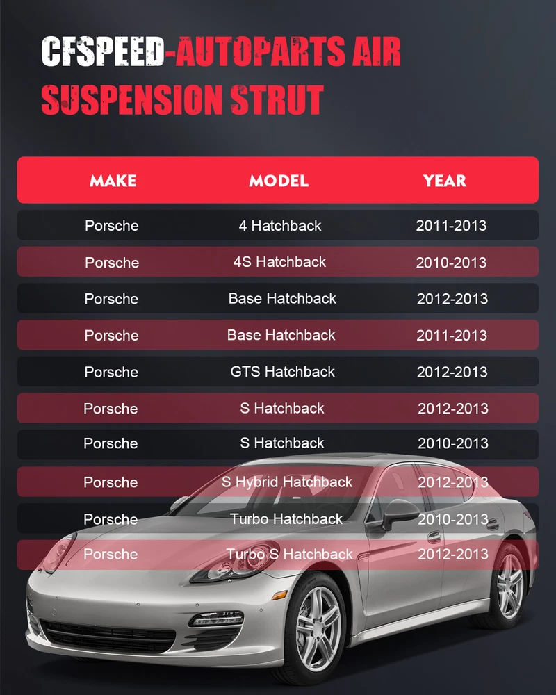 Notes: Please double confim the compatibility as well as the OEM number before purchasing. It is highly recommended that air shocks struts be replaced in sets Instruction is not included. Professional installation is recommended Pre-assembled and ready to install! No special tools required! 3PCS Front Suspension Shock Strut Compressor For Porsche Panamera GTS 2010-2013 Vehicle Fitment Information 3* Front Suspension Shock Strut Compressor For Porsche Panamera 970 Chassis G1 Notes: Please double confim the compatibility as well as the OEM number before purchasing. It is highly recommended that air shocks struts be replaced in sets Instruction is not included. Professional installation is recommended Pre-assembled and ready to install! No special tools required! 3PCS Front Suspension Shock Strut Compressor For Porsche Panamera GTS 2010-2013 Vehicle Fitment Information Porsche Panamera 4 Hatchback 4-Door 3.6L 2011-2013 4S Hatchback 4-Door 4.8L 2010-2013 Base Hatchback 4-Door 3.0L 2012-2013 Base Hatchback 4-Door 3.6L 2011-2013 GTS Hatchback 4-Door 4.8L 2012-2013 S Hatchback 4-Door 3.0L 2012-2013 S Hatchback 4-Door 4.8L 2010-2013 S Hybrid Hatchback 4-Door 3.0L 2012-2013 Turbo Hatchback 4-Door 4.8L 2010-2013 Turbo S Hatchback 4-Door 4.8L 2012-2013 OEM Part Number Front Air Suspension Strut: 97034305107,97034305108,97034305109,97034305110,97034305111,97034305112, 97034305114,97034305115,97034305116,97034305117,97034305118,97034305120,97034305121,97034305122 97034305207,97034305208,97034305209, 97034305210,97034305211,97034305212, 97034305214,97034305215, 97034305216, 97034305217,97034305218,97034305220, 97034305221,97034305222,97034305223 Air Suspension Compressor Pump: 97035815110,97035815111,97035815124 Item Specifications: Improves Ride & Handling,Guaranteed Exact Fit for easy installation 100% BRAND NEW, premium ISO/TS 16949 quality - tested to meet or exceed OEM specifications Our air suspension struts replace the original air strut of your vehicle and offer you maximum ride comfort with high durability. Security, accuracy and quality of the product match the original part. Our air struts are made of high-quality materials and are covered by a 1-year limited warranty and a 30-day money-back Or Replacement guarantee. Each air suspension strut comes complete with air spring and shock absorber as well as the new electromagnetic control valve. All strut modules are new, high-performance parts. Our air struts shocks are designed for superior ride quality by adjusting quickly to different road and vehicle conditions, while offering ultimate safety and functionality. Removal Guideline : Caution: Damage to the vehicle and air suspension system can be incurred if work is carried out in a manner other than specified in the instructions or in a different sequence. 1.To avoid the possibility of short circuits while working with electric components consult your owner's manual on how to disconnect your battery. 2.Consult your vehicle owner's manual, service manual, or car dealer for the correct jacking points on your vehicle and for additional care, safety and maintenance instructions. Under no circumstances should any work be completed underneath the vehicle if it is not adequately supported, as serious injuries and death can occur. 1.Set steering to straight ahead. 2.Lift vehicle and remove rear wheel. 3.Locate and remove the air line to deflate the air shock. Turn the metal clip approx. 90°to remove the air line fitting from the air shock. 4.Locate and remove the electrical connector from the top of the air shock. 5.Loosen and remove the upper and lower shock mounting nuts. 6.Support the axle to relieve pressure from the air shock's mounting points. Remove the upper and lower air shock mounting bolts. 7.Remove the air shock from the vehicle. 8.Removal complete. Installation Guideline : Tighten all nuts and bolts to manufacturer's specifications during the installation process. Do not remove the air fitting from the air strut. Doing so may cause damage and/or void warranty. Remove the white shipping pin from the new air fitting and insert the air line until fully seated. 1.Installation is in reverse order of air strut removal. Item Specifics Placement on Vehicle Left Right Front Type Air Suspension Shock Fitment Type Direct Replacement Part Type Strut & Spring Assembly Adjustable Yes Metal Fitting Connection Design Standard Hose Thread Upper Mount Type Stud Lower Mount Type U-Bracket Surface Finish High Quality Drive Layout Front Engine RWD & 4WD Platform 970 Custom Bundle Yes Material Iron Aluminium Alloy Rubber Quantity 3PCS Brand Unbranded Payment PayPal preferred. Payments are expected within 7 days after the last winning auction is closed; Otherwise Unpaid Item Dispute will be filed with eBay. Shipping Product will be shipped within 2 business days after full payment is received and verified. Delivery Time is about 3-7 business days to most of countries. All domestic orders will be shipped via USPS, UPS or FedEx from our US warehouse and usually arrives to your door in about 3-5 business days. We ship the package to your shipping address in eBay instead of the one in PayPal. Please tell us your shipping address if it is different from the one in eBay. The tracking number will be given for the customer to check the shipping status online (registered or faster service only). We are not responsible for any wrong or undeliverable addresses. Please verify and update your shipping address on eBay during checkout. Returns WARNING : Cancer and Reproductive Harm - www.P65Warnings.ca.gov. We stand behind every product we sell. All of our brand new items come with a 60-Days money-back guarantee. We define the item as defective only if it doesn't function as described. It is the buyer's responsibility to understand the item description before bidding. We will replace the defective items, provided that they are in stock within the warranty period posted with the listing and the buyer return the original item