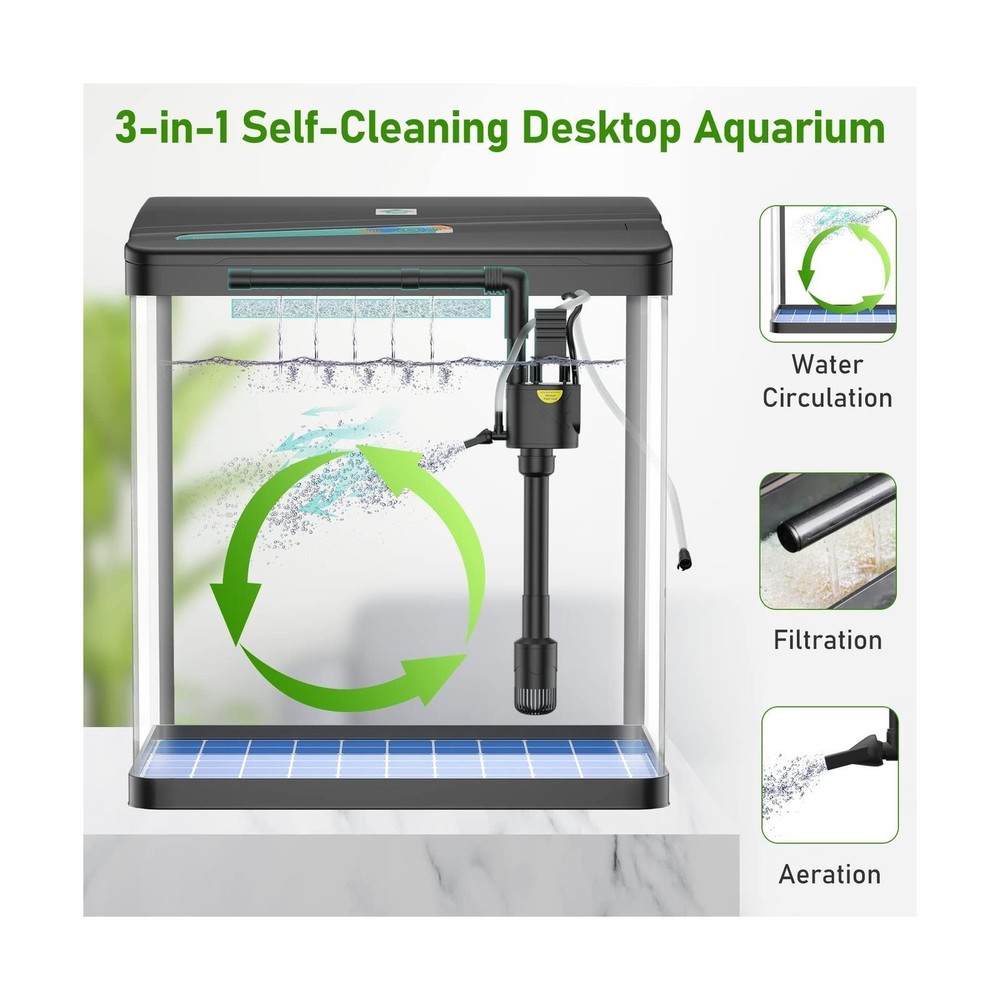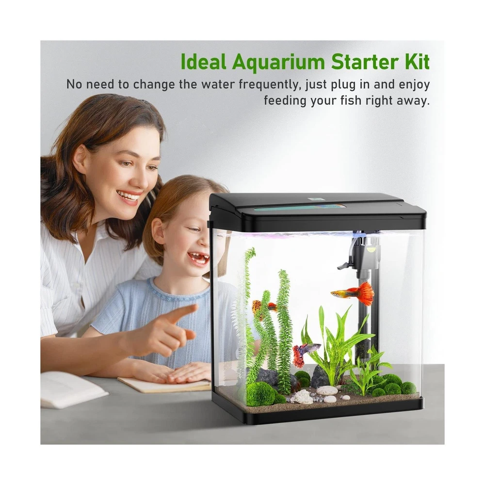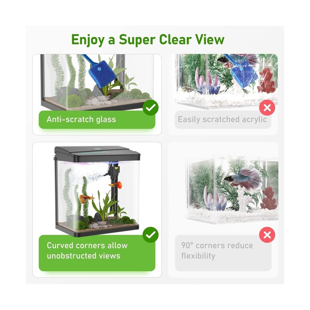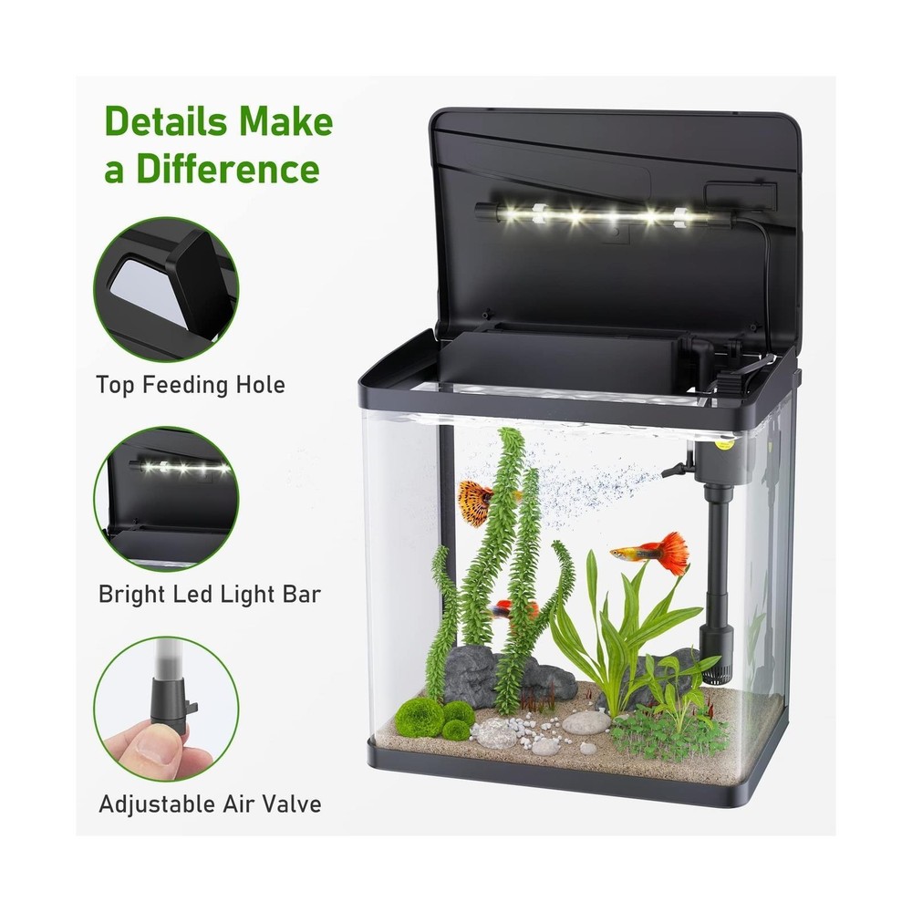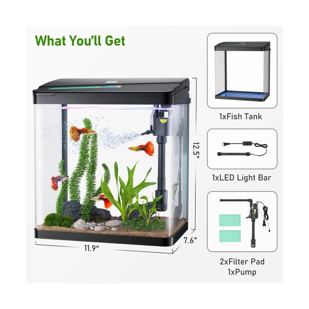 MADE FOR ALL AQUARIUM LOVERS: The PONDON aquarium kit provides a quick and stylish foundation for starting your new aquarium. It is equipped with all essential accessories for your home aquarium. 3 IN 1 SELF CLEANING FISH TANK: The aquarium has a quiet adjustable flow filter pump, providing oxygen, running water circulation, and removing impurities. In addition, it includes an LED lighting system that shows the natural underwater effect of sunlight. CLEAR AND ANTI-SCRATCH GLASS: The betta tank is made of high quality float glass, providing a super clear view and protecting the tank from scratches when you clean it. What’s more, the curved corner design allows viewing from multiple angles. SLEEPING WITH FISH TANK: Generating little noise, the submersible aquarium pump provides quiet living space for you. Measuring 11.9''*7.6''*12.5'', the fish tank allows you to place it in the bedroom, living room, or office. EFFORTLESS SETUP: Easily assembled filter pump and hanging light allow easy access to the tank. In addition, all you have to do is to adjust the water flow by adjusting the switch. Product Dimensions: 11.9"L x 7.6"W x 12.5"H