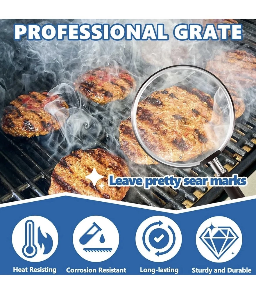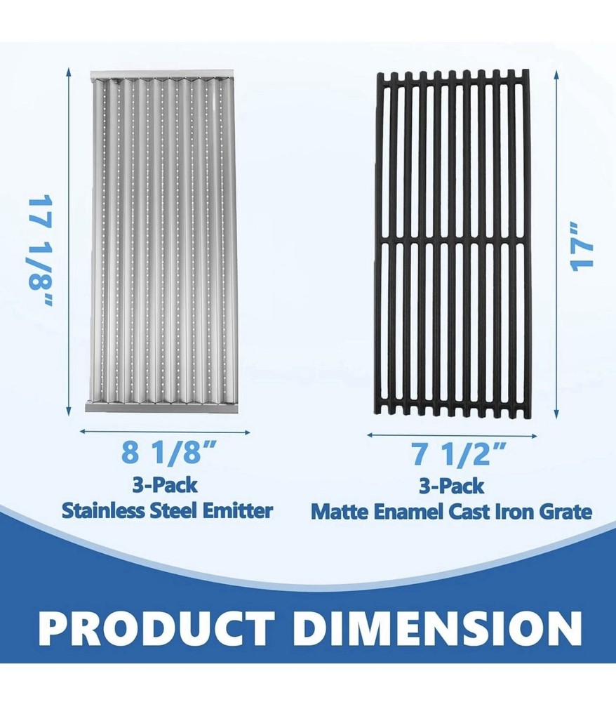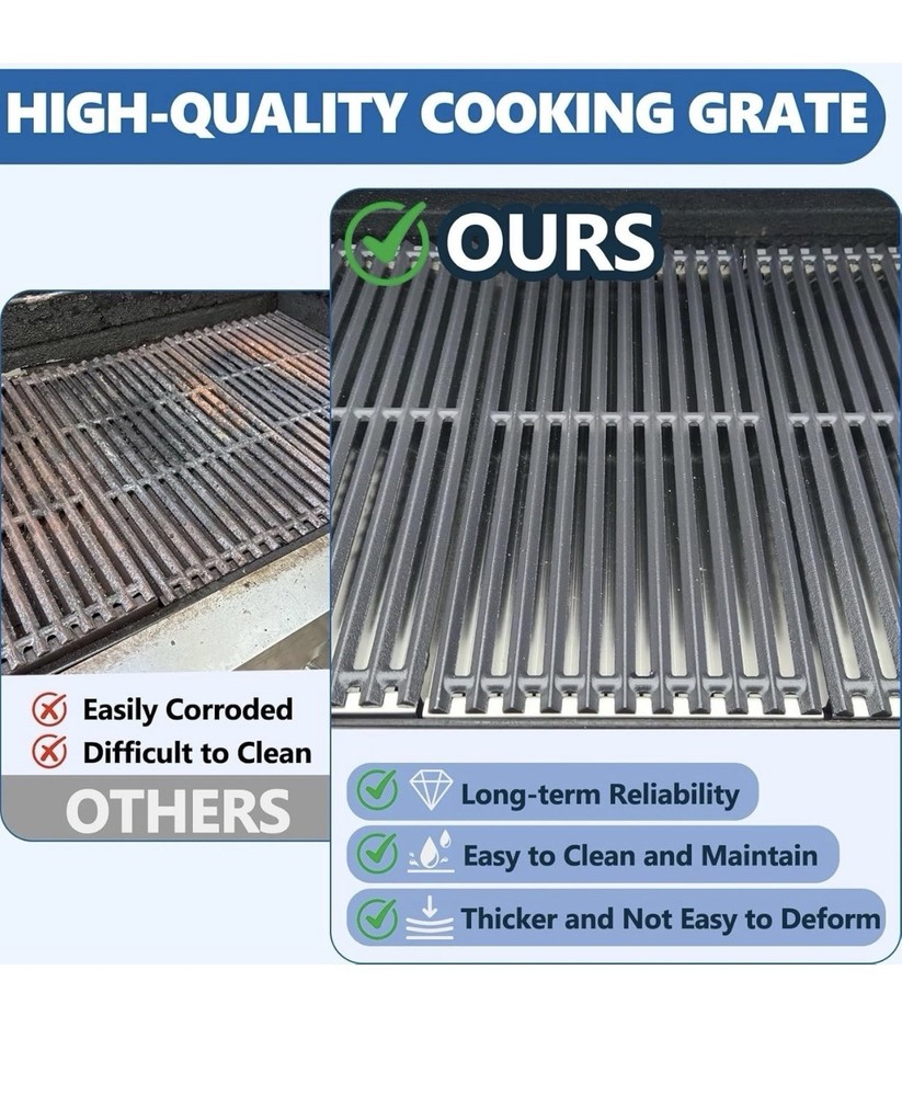 Charbroil Grill Grates Fits Charbroil Infrared Grill Grates 463242516 463242515 466242615 463243016 463367016 466242516 Charbroil Tru Infrared 3 Burner Grill Replacement Parts More features Perfect Compatibility: Replacement for Charbroil Commercial Infrared 3-Burner models (charbroil 463242516, 463242515 charbroil grill grates, 466242515 charbroil infrared grill grates, 466242615, 463243016, 463367516, 463367016, 466242516, 466242616, 463346017, 463246018 char-broil grill replacement parts). Also perfect for SmartChef TRU-Infrared 3-Burner (4463346017), Signature TRU-Infrared 3-Burner (463342620, 463367016), Medallion Series Modular Outdoor Kitchen Amplifire 3-Burner (463246018). *Replaces original parts: G466-0025-W1A, G474-0017-W1, G466-2400-W1, CHRG466-2400-W1.* Package Included: 3 premium stainless steel emitter plates, charbroil grill replacement parts and 3 heavy-duty cast iron cooking grates, char broil grill replacement parts. Directly replaces worn parts for optimal performance. Please check the size of your grill before ordering. Superior Heat Distribution & Performance: Emitter plate's multi-hole design ensures even heat dispersion across the entire grill surface. Significantly reduces flare-ups while locking in juices for more flavorful results. Easy Installation & Maintenance: Simple drop-in replacement – no tools required. Durable cast iron grates, charbroil tru infrared 3 burner grill replacement grates develop a natural non-stick patina over time. Clean effortlessly with a standard nylon grill brush.