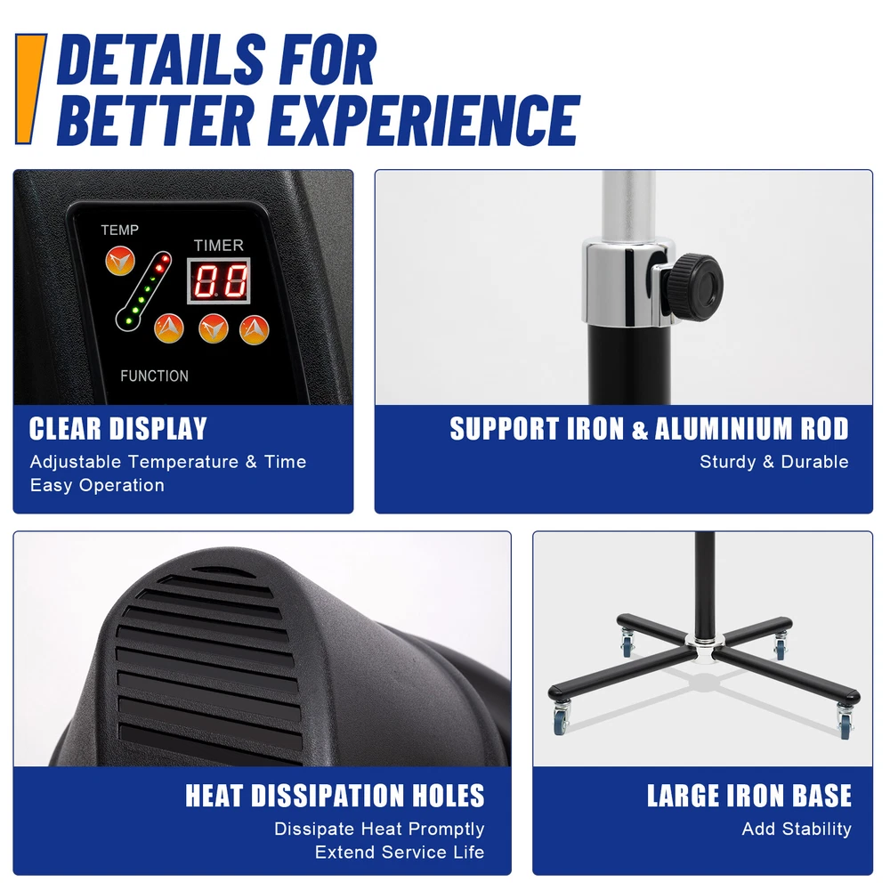 Description This beautiful and practical hair dryer is your ideal choice. High-quality materials make it safe and durable. It uses high-power infrared heating technology to achieve rapid heating and save time. At the same time, multiple functions can meet customers' daily styling needs. The four universal wheels at the bottom and an extended power cord are convenient for movement and use. Its high-quality and beautiful appearance will attract more customers for you. Key Features Build to Last: Premium iron, aluminum, ABS, and exquisite painting and electroplating process make this product wear-resistant, corrosion-resistant, high-temperature, and deformation-resistant, so it can withstand the test of time. Package Included 1*Freestanding Hair Dryer 1*English Manual 3 In 1 Hair Dryer Roller Ball Climazone Infrared Color Processor Salon Perming Description This beautiful and practical hair dryer is your ideal choice. High-quality materials make it safe and durable. It uses high-power infrared heating technology to achieve rapid heating and save time. At the same time, multiple functions can meet customers' daily styling needs. The four universal wheels at the bottom and an extended power cord are convenient for movement and use. Its high-quality and beautiful appearance will attract more customers for you. Key Features Build to Last: Premium iron, aluminum, ABS, and exquisite painting and electroplating process make this product wear-resistant, corrosion-resistant, high-temperature, and deformation- resistant , so it can withstand the test of time. High Efficiency: The high-power machine (950W) use infrared technology to quickly heat up to the desired temperature, and the 360° rotating heating disc transfers heat evenly to the roots of the hair, reducing customer waiting time. Besides, it can help customers promote blood circulation, accelerate metabolism, and make hair elastic. Thoughtful Design: It has three working conditions to choose from cold air, hot air, and rotating. The blowing outlet can be adjusted up or down with a knob in the range of 30-45° so that you can comfortably enjoy the hair care process. In addition, its six function modes and adjustable temperature and time (10-60 minutes) make it easier for you to use. Adjustable Height : It is height adjustable from 58.46-66.14 inches to meet the needs of people of different heights, providing comprehensive lighting and better hair care. Convenient to Move: Four anti-sticky hair universal wheels allow you to move freely to any place with less noise. Safe to Use: The approximately 7.15ft long power cord provides you with more usage locations while keeping you away from the power source. It will be safer to turn on the main power switch and select the usage mode before pressing the start/pause button. Easy to Clean: The smooth surface makes it very easy to clean, so you just need to gently wipe it with a cloth. Beautiful Appearance: The classic black and smooth surface makes it look very neat and beautiful. High beauty value makes your work more enjoyable. Protective Package: The double wrapping of foam and cardboard box can effectively protect the product in transit. Buy with Confidence: We are honored that you have chosen our product. We have sufficient confidence in the quality of the product so that you can buy it confidently. But if you have any questions, you can contact our customer service, he will patiently answer and solve your problems. Details Stable Base: The sturdy support rod and large four-legged base ensure good stability, making it safer to use. Heat Dissipation Holes: It comes with cooling holes to help the machine dissipate heat promptly, ensuring safety and extending service life. Clear Display: You can see the temperature and time clearly with the display on the control panel. It makes your operation easier. Application It can be used in barbershops, beauty salons, and other places, and is suitable for perms, color, treatment, semicolor dryhead care, and so on. Specification Color: Black Martial: Aluminium, Iron, ABS Process: Painting, Electroplating Technology: Infrared Plug Type: US Standard Voltage: 110V Power: 950W Frequency: 60Hz Time Control Range: 10-60mins Three Functions: Fan, Heat, Rotate Six Modes: Perm, Color, Treatment, Semicolor, Dry, Manual Power Cable Length: 2.18m/7.15ft Heater Diameter : 50cm/19.69inch Base Size: 68*49cm/26.77*19.29inch Height Adjustment Range: 148.5-168cm/58.46-66.14inch Package Size: 69*52*39.5cm/27.17*20.47*15.55inch Gross Weight: 12.05kg/26.57lbs Net Weight: 10.25kg/22.6lbs Package Included 1*Freestanding Hair Dryer 1*English Manual All Accessories for Assembly Notes Please read the manual carefully and pay attention to the safety precautions inside. External collision should be avoided. Please allow the slight color difference caused by the shooting light and the 1-3cm error due to manual measurement, and make sure you do not mind before ordering. Payment Delivery details Terms of sales About us Contact us Payment We accept ebay payment 。 Fees such as import duties, taxes are not included in the item price or shipping costs. These charges are the buyer's responsibility. Delivery details Shipping: 2-9 working days to: USA Terms of sales We maintain high standards of excellence and strive for hundred percent customer satisfaction. Feedback is very important to us. We hope that you contact us immediately before you give neutral or negative feedback, so that we can address your concerns. It is impossible to address issues if we do not know about them! About us Your satis faction is our ultimate goal. We work hard to earn your trust and future business. Our certified technicians have tested each item before shipping. The unit comes with 1 year limited warranty on all manufacturing defects. a) If you receive a defective item, you may return it or ask for a discount. Please contact us within 14 days after you receive the package. b) What you returned must be intact and in i