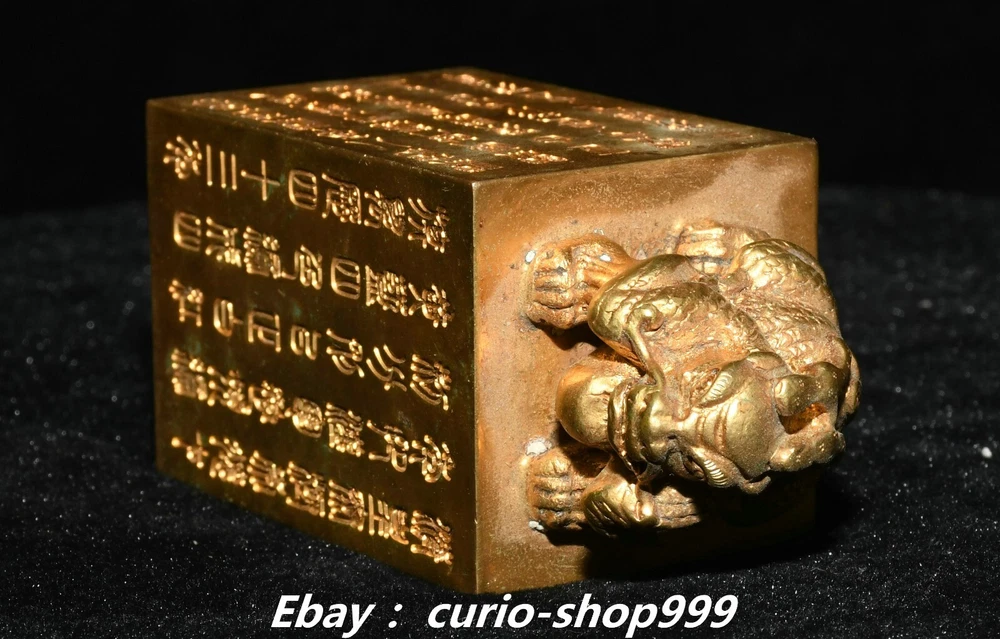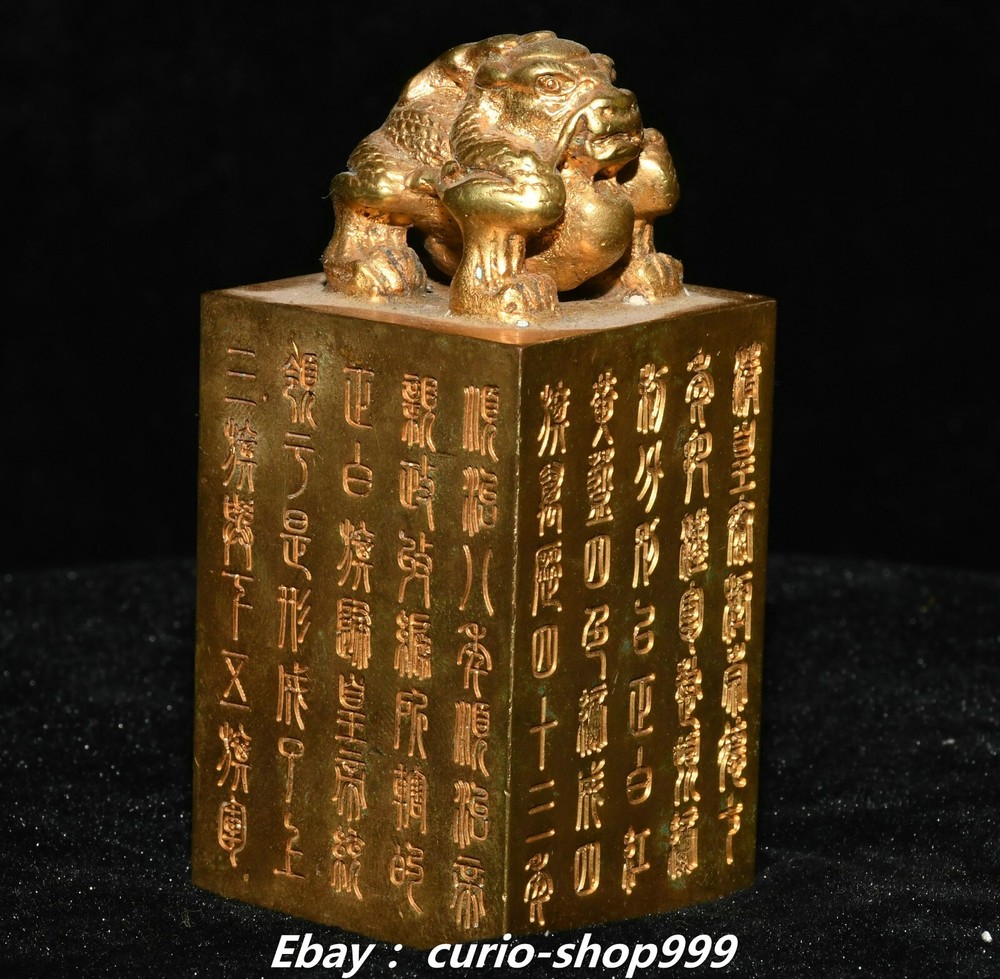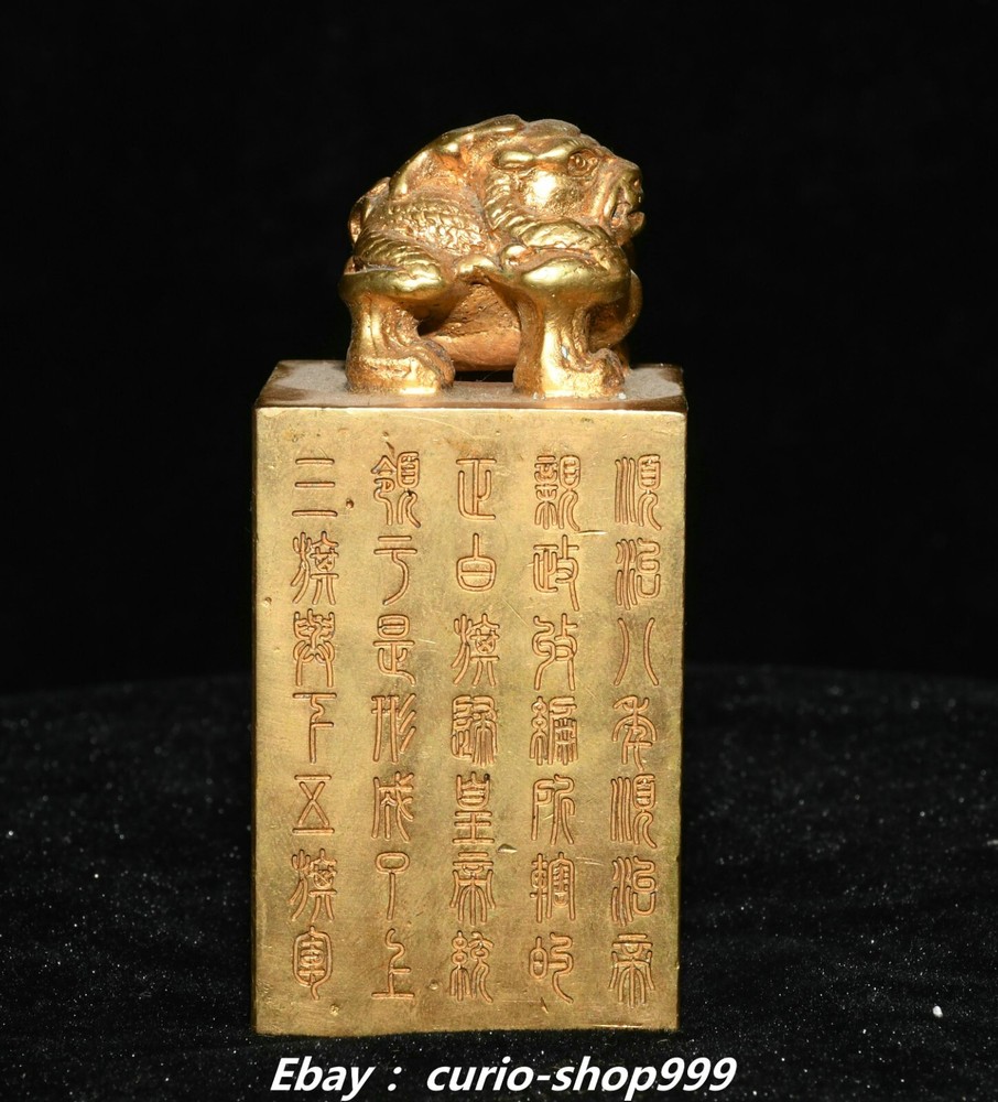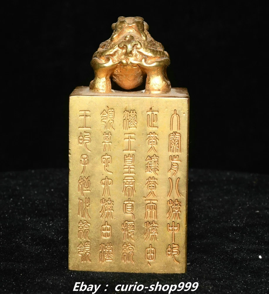 $ 136.763.5" China Dynasty Copper Gold Inscription Dragon Loong Beast Seal Stamp Signet