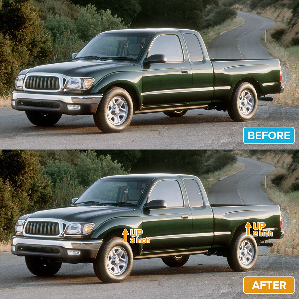【Compatible】Leveling lift kit replacement for 1995-2004 Tacoma (6 lug models only) FITMENT - 3" Front and 2" Rear Leveling Lift Kit for 1995-2004 Tacoma. RAISE THE VEHICLE HEIGHT - These will raise the front of your truck by 3 inch and the rear of your truck by 2 inch, Because of suspension geometry,the ratio between lift height and kit thickness is not 1:1 AGGRESSIVE LOOK - Once you install it on your truck,it will give your truck a cool look.Accurate numerical control precision and high quality, ensure your driving safe and comfortable MATERIAL - Forged from 6061-T6 aluminum alloy,CNC automatic processing,surface anodic oxidation and heat treatment,not only ensure high precision and stability,but also enhance the hardness and corrosion resistance of the material WARRANTY & SERVICES - All Leveling kits are covered by 2 years warranty,Pls feel free to contact us with any questions regarding our products and services Compatible with: 1995-2004 Tacoma 2WD 4WD (6 lugs only) Does not fit 5-Lug Tacoma models Important Note: Lift the front by 3". Due to suspension geometry, the ratio of the lifting height to the thickness of the lift kit is not 1:1. Package: 2 x 3inch Front Leveling Lift Kit 2 x 2inch Rear Leveling Lift Kit 4 x U-Bolt 1 Set Nut.