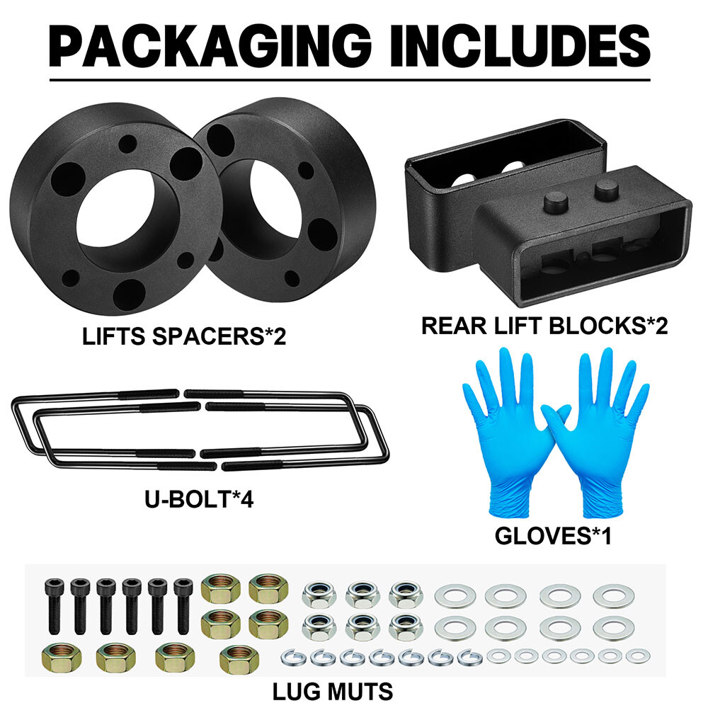 Specifications: Quantity: Four (4) Front lift kit real thickness: 2" Front lift kit raise height: 3" Rear lift kit real thickness: 2" Rear lift kit raise height: 2" Material: 6061-T6 Aerospace Grade Aluminum with 12.9 grade studs Important Note: Due to suspension geometry, the ratio of the lifting height to the thickness of the lift kit is not 1:1. Compatible with: 2007-2023 Chevy Silverado 1500 (2WD/4WD) 2007-2023 GMC Sierra 1500 (2WD/4WD) Package: 2 x 3inch Front Leveling Lift Kit 2 x 2inch Rear Leveling Lift Kit 4 x U-Bolt 1 Set Nut. 1 Pair Gloves 【Compatible】2007-2023 Silverado 1500 2WD/4WD, 2007-2023 Sierra 1500 2WD/4WD. 【Increase the height of your Car】: These will raise the front of your truck by 3 inch and the rear of your truck by 2 inch, Because of suspension geometry,the ratio between lift height and kit thickness is not 1:1. 【Appropriate application】: Compatible with 2007-2023 Silverado 1500/ Sierra 1500 Pickups. 【Aggressive look】: Once you install it on your truck,it will give your truck a cool look.Accurate numerical control precision and high quality, ensure your driving safe and comfortable. 【Process and Material】: Forged from 6061-T6 aluminum alloy,CNC automatic processing,surface anodic oxidation and heat treatment,not only ensure high precision and stability,but also enhance the hardness and corrosion resistance of the material,The product itself is also equipped with 12.9 class studs. 【Warranty and Services】: All Leveling kits are covered by 2 years warranty,Please feel free to contact us with any questions regarding our products and services. Specifications: Quantity: Four (4) Front lift kit real thickness: 2" Front lift kit raise height: 3" Rear lift kit real thickness: 2" Rear lift kit raise height: 2" Material: 6061-T6 Aerospace Grade Aluminum with 12.9 grade studs Important Note: Due to suspension geometry, the ratio of the lifting height to the thickness of the lift kit is not 1:1. Compatible with: 2007-2023 Chevy Silverado 1500 (2WD/4WD) 2007-2023 GMC Sierra 1500 (2WD/4WD) Package: 2 x 3inch Front Leveling Lift Kit 2 x 2inch Rear Leveling Lift Kit 4 x U-Bolt 1 Set Nut. 1 Pair Gloves