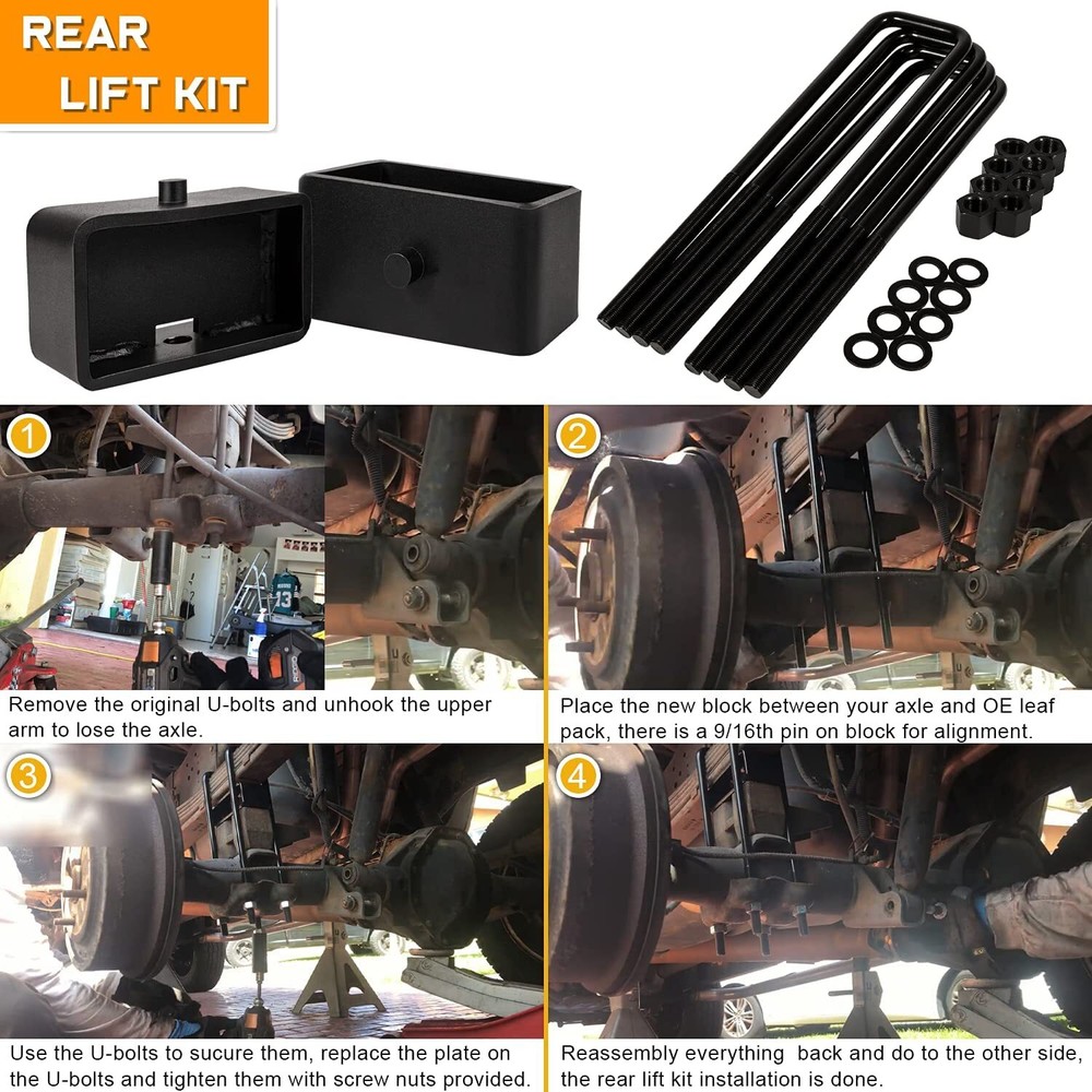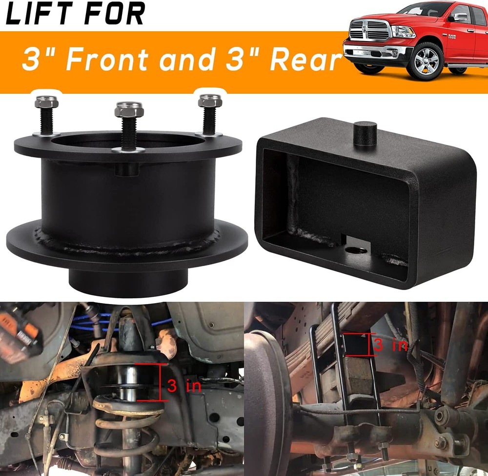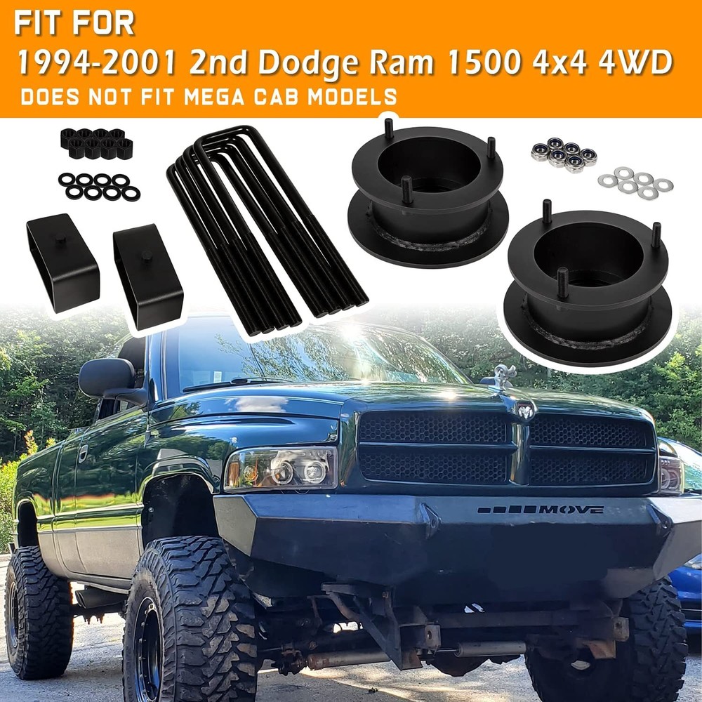 3" Front & 3" Rear Full Lift Kit forDodge 1994-2001 Ram 1500 4WD 2WD Suspension Fitment: For 1994-2008 Dodge Ram 1500 2WD, For 1994-2013 Dodge Ram 2500 2WD, For 1994-2012 Dodge Ram 3500 2WD . (Does NOT fit Mega Cab models) Detail: 3-Bend, One-Piece, Rear Steel blocks with a built in taper for Optimal Ride Quality. 5.05" Long x 2.45" Wide Steel Blocks. Round U-Bolts 11.22" Length, 4.4" Width, 3.92" Thread Length, 9/16" Threads. Allows clearance for up to 33" tires. Easy To Install: No Special tools required. No spring compressor needed. The front spacer kit is placed right above your coil spring and installs with simple hand tools and a jack. The rear lift blocks are also a very easy install and are placed right between your axle and leaf pack. The rear also comes tapered to maintain your drive angle as well. Estimated install time is about 2-4 hours. Material: Heavy-Duty Steel Construction: Rugged and durable steel process, finished with non-slip wax to protect from rust and corrosion for long-lasting reliability. Precision HD Plasma CNC cut and Powder Coating Performance Front Spacers. Retains factory smooth ride and will work with stock shocks. Advantage: Raise the overall height and obtain extra inches of ground clearance. Help the vehicle's off-road performance by avoiding the obstacles that can be found on the ground. Retains factory smooth ride and will work with stock shocks This is a 3-inch front and 3-inch rear lift kit that can raise the overall height and obtain extra inches of ground clearance. This helps the vehicle’s off-road performance by avoiding the obstacles that can be found on the ground. Package Included: Full Kit Suspension Lift Kit 1. Payment methods accepted: Payoneer. Our payoneer account allows you to pay by credit card, debit card and your paypal balance. 1. We ship items to Your ebay address.Please make sure your ebay address is correct before you pay, cause it cannot be changed once the order shipped out. 2. All of our items are shipped from our Warehouse in USA. 3. Please feel free to contact us by ebay "Contact member" if you cannot get your order on time. 1. Return to us within 60 days from the delivery date for exchange or refund. Refund will be given as Money back or item exchange (buyer's choice). 2. Return shipping fee is the responsibility of buyer unless the return is a result of our mistake. And all NON-seller mistake returns for refund are subject to 20% re-stocking fee. 3. If you need return, please contact our customer service representative, let us know the detailed problem and send us some pictures for confirmation. 1.Please contact us via ebay using"Contact member". We will respond within 24hours or less.Thank you for your understanding. 2. We maintain high standards of excellence 5-stars and strive for 100% customer satisfaction! Positive Feedback is very important to us. 3. Pls contact us first before you leave Neutral or Negative feedback. We will do our best to solve the problem, thanks!