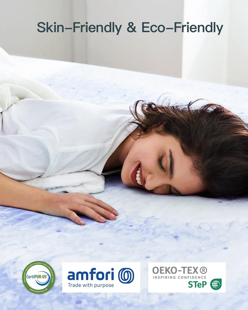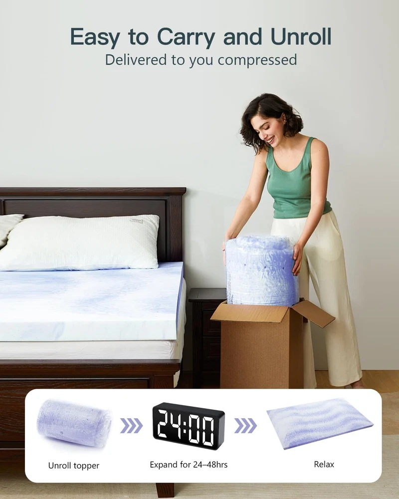 Upgraded Sleep Experience: Improve comfort & support for sleep without spending a fortune on a new bed. Renew an old mattress, transform a hard mattress, or enhance a new mattress with this full memory foam mattress topper. All-Night Comfort: This high-density memory foam mattress topper full conforms to your body and provides real support for shoulders, back, waist, hips, and legs. It's suitable for all sleeping positions and brings ultimate relaxation. Breathable & Cool: This full bed topper is breathable and has airflow channels to carry excess heat away, helping you have a cool night. It's also infused with cooling gel for an enhanced cooling effect. Certified Mattress Topper: The full foam mattress topper has been tested to meet rigorous CertiPUR-US standards for content, emissions, and durability. It's safe and skin-friendly, so the whole family can use it with confidence. Easy to Carry & Unroll: The foam mattress topper is convenient for use around the home on sofa beds, air mattresses, and floors. The topper is delivered to you compressed and needs 24–48 hours to fully expand (may take longer in low temperatures).