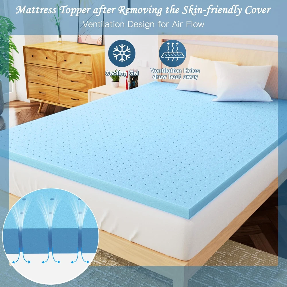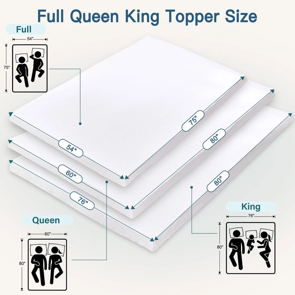 【Upgraded Gel Memory Foam & no weird smell】No smell at all. High-density memory foam provides adaptive comfort and support. memory foam mattress topper is breathable to prolong the service life of the mattress, and will bring you a new sleeping experience that is comfortable and not stuffy all night. Enjoy deeper and better and more comfortable sleep. 【Certification】The topper has obtained CertiPUR US certification and cover is certificated OEKO-TEX. Undergone rigorous testing, meeting standards for harmlessness, materials, performance, and durability. It is also very friendly to pregnant women and children, and is suitable for all families 【Skin-friendly Cover & Durable Zipper】Made with skin-friendly and breathable fiber. The topper cover is machine washable and wear-resistant, with adjustable elastic straps and anti-slip surface backing to prevent sliding, straps are stretchy and reliable. Premium durable zipper for convenient disassembly and washing, won't break. Keep your topper fresh and clean. 【Pressure Release and Support】The memory foam mattress topper can easily fit the curve and shape of your body, and the stress points are evenly distributed, without compressing the spine and joints, so as to achieve better sleep. Sleeping on a memory foam mattress feels like floating on clouds, with blood flowing throughout your body, providing a perfect sleep experience. You couldn’t even feel the floor under. 【Breathable & Ventilated Design】The gel memory foam mattress topper is infused with heat-absorbing gel to regulate temperature, and the vents increase airflow for breathability. No trapped heat with this topper. Compared with ordinary memory foam, it is more breathable, more sensitive, and softer. 【Tips】Allow 24-48 hours for expansion. After your topper is fully expanded, you could enjoy the benefits of topper. it's a game-changer for you. You deserve a restful night! 【Worry-Fr ee 10-Year Limited Warr anty】Provides 120-day guarantee, 10-year worry-fr ee warr anty, and lifelong . If you have any questions, please feel fr ee to us and you will receive a satisfactory response within 24 hours.