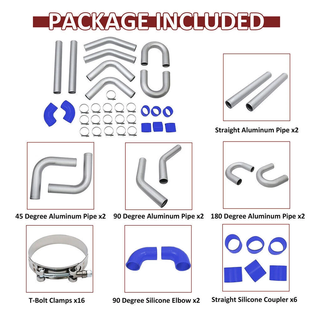 3" Universal Aluminum Turbo Intercooler Elbow Pipe Kit +Silicone Hose+Clamp Description: Pipe OD: 3 ", aluminum pipe length: 23.62" / 60cm, thickness: 1.8mm The tube set is mainly used for automobile refitting the turbocharger cooling inter-cooled device pipe of the suite and admission line Anodized T6061 aluminum and polished surface pipes resist wear, rust and corrosion for extra durability Universal fitment, depending on the size of your Intercooler Specifications: Condition: 100% Brand New Aluminum Pipe Length: 23.62" / 60cm Thickness: 0.7inch/1.8mm Material: Aluminum Color: Silver Surface Finish: Oxidation Corrosion resistance and light weight Made from High Quality Light Weight T6061 Aluminum Compatibility: Universal 3" Pipe What You Get: 3" (OD) Straight aluminum pipe x2 3" (OD) 90 Degree aluminum pipe x2 3" (OD) 45 Degree aluminum pipe x2 3" (OD) U Shape aluminum pipe x2 3" Straight silicone coupler x6 3" 90 Degree silicone coupler x2 Stainless Steel T-Bolt clamps x16 Note: 1.If you has any problem, please feel free to contact us. 2.Please let us know before you send us the neutral/negative feedback that wont help to finish the issues. And I will definitely try my best to provide the best solutions which would meet your satisfactory. Payment Delivery details Terms of sales About us Contact us Payment 1.Payment must be received within 11 days after winning the item,UPI (Unpaid Item Case) will be filed automatically if buyers fail to make the payment in 11 days after item ends. 2.If you have difficulty paying for the item, please email us to cancel the order. Delivery details 1. Items will be sent out in 48 hours on payment received from Monday to Friday. Orders during weekends and holidays will be posted in the following working day. 2. Please make sure your shipping address and the order information is correct before placing an order. We will not be responsible for item loss due to wrong or unknown address. 3. Products will be shipped from NJ/CA via USPS/UPS/Fedex/DHL. Shipping time is usually 2-7 business days (except Saturday and Sunday.) If you need the item urgently, please contact us for details before you buy. Terms of sales 1.We accept 30 days return/refund guarantee. 2.If the item you received is faulty, damaged or incorrect, or any further problems, you can return it for replacement or refund, please contact our customer service on eBay within 30 days from item received. 3.For damaged items on arrival, please contact us first, sending us an email with a photo is preferred. We will offer solutions to such cases. Full refund or replacement will be guaranteed. About us Welcome to thebetterautopartszone We are specialized in auto accessories for more than 8 years and we have been exporting all kinds of items concerning the auto-parts that come with high quality & best price & excellent after-sales service! Thank you for shppping at our eBay store. Contact us 1.Please contact us first if you have any questions such as product damaged, item not arrived, wrong item sent and item does not work. All those issues would be solved immediately with your satisfactory! 2. Please contact us first before you left us a negative/neutral feedback and we are pleased to solve the problems you met. 3.Please feel free to contact us if you have any problems and we would always be here for your need . Other Part Number Turbocharger Supercharger Interchange Part Number Mandrel bent beaded flared Items Included Clamps, Hoses, T-Bolts Model For Universal 3" Pipe Size 3" (76mm) Fitment Type Performance/Custom Custom Bundle No Color Silver UPC 763341149158 Material Aluminum MPN BIK10995 Modified Item No Placement on Vehicle Front Brand TB Shipping Notes We have multiple warehouses in US, and will choose the nearest one for shipping, according to your address and our inventory Type Intercooler Pipe Kit Shipping policy 1 Business day Multi-warehouse shipping! Item Condition New Manufacturer Warranty 1 Year Features Corrosion resistant, Light weight, Anti Rust, heat resistant Package Quantity 1 Finish Oxidation