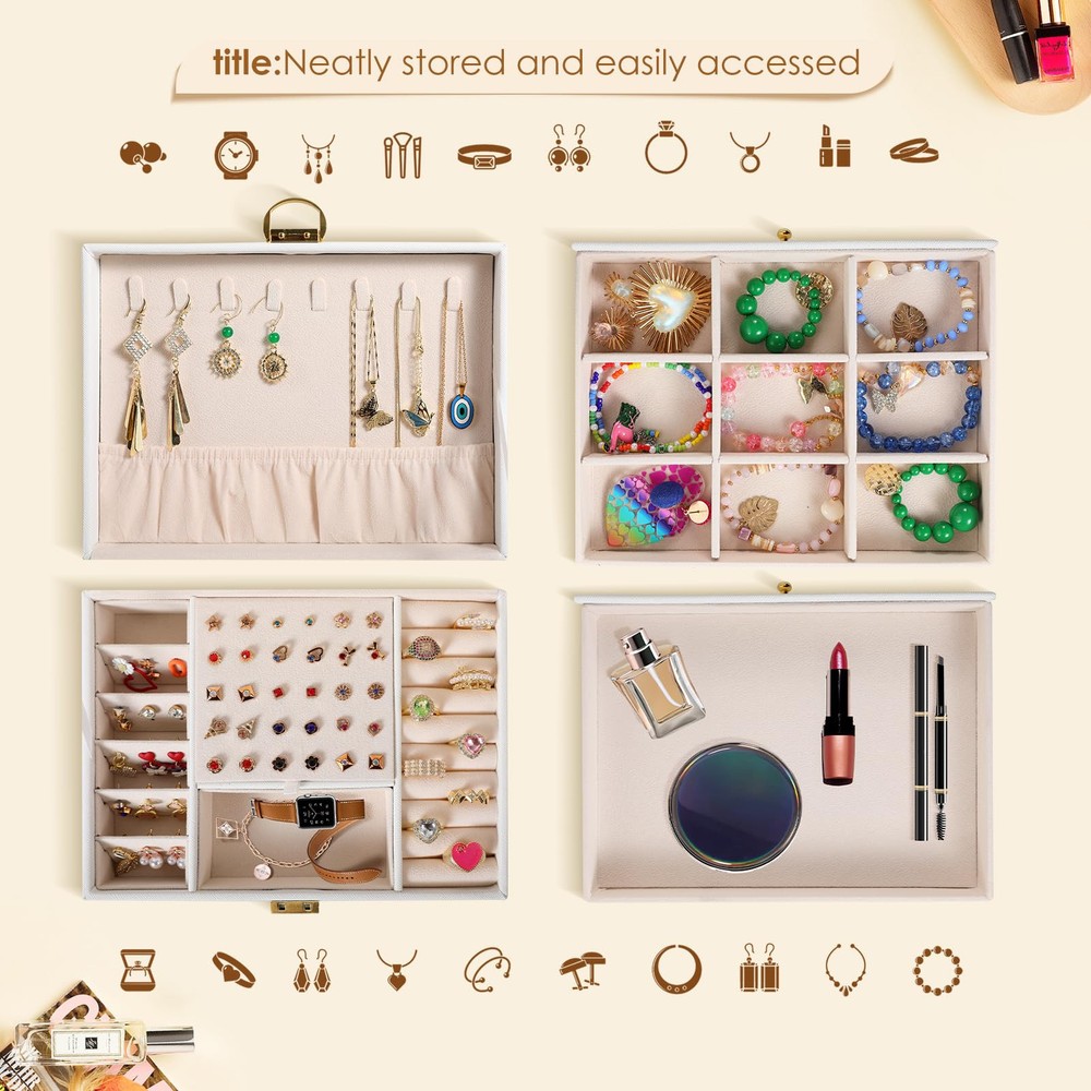 【Elegant Craftsmanship】The skillfully knitted box cover of the stud earring organizer box showcases a distinctive allure, while the PU leather fabric on the surface adds a prominent textured touch. Inside, the velvet lining in versatile colors provides a tender and comfortable room for your lovely gems. With unparalleled elegance, this fashionable jewelry holder organizer captures every moment of your cherished jewelry, adding allure to your stylish life. 【3-Layer Jewelry Organizer Drawer】Experience the epitome of organization with our large-capacity, 3-layer earring holder organizer, thoughtfully designed with 2 convenient drawers. Each layer boasts a specially designated area for your precious jewelry pieces, ensuring easy access and perfect storage. From earrings, rings, and ear studs to necklaces, bracelets, watches, and even compartments for your lipstick, sunglass and perfume, every cherished item finds its exclusive place with this vintage jewelry box. 【Customizable Jewlery Box】Indulge in the ultimate convenience with our jewelry organizer box featuring removable dividers, allowing you to customize it to perfectly match your unique preferences. Create personalized compartments that cater to your specific needs and effortlessly adapt the box to accommodate various jewelry sizes and styles. 【Jewelry Storage & Display Case】Not only a nice bathroom counter organizer helper, with fashionable outlook of earring box , this jewelry box seamlessly becomes a captivating part of your room decor, whether it's in the bedroom, bathroom, or dressing room. Its chic design effortlessly enhances the ambiance of any space, adding a touch of elegance and sophistication. Embrace the harmonious blend of practicality and beauty, making this jewelry holder a cherished centerpiece that exudes charm and style in every corner of your home. 【Valentines Day Gifts for Her】Our exquisite jewelry box is the perfect valentine gift for women and girlfriend, making it the best choice for any occasion like Christmas, Mother's Day, birthdays, weddings and Valentine's Day, with the timeless appeal of this jewlery organizer, versatile functionality, and thoughtful organization, offering a captivating and sentimental present that will be cherished and adored, becoming a shining star in their room decor and a symbol of your affection for the remarkable women and moms in your life. 【Birthday Gifts for Mom Grandma From Daughter】 Ease of use jewelry organizer drawer, comfortability jewlery box & storage. The women girls jewelry box is reasonably structured and sturdy to keep all your jewelry in order. Ideal jewelry thanksgive day christmas gift present Box.