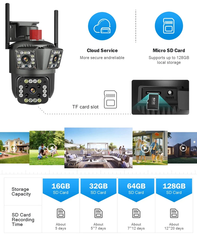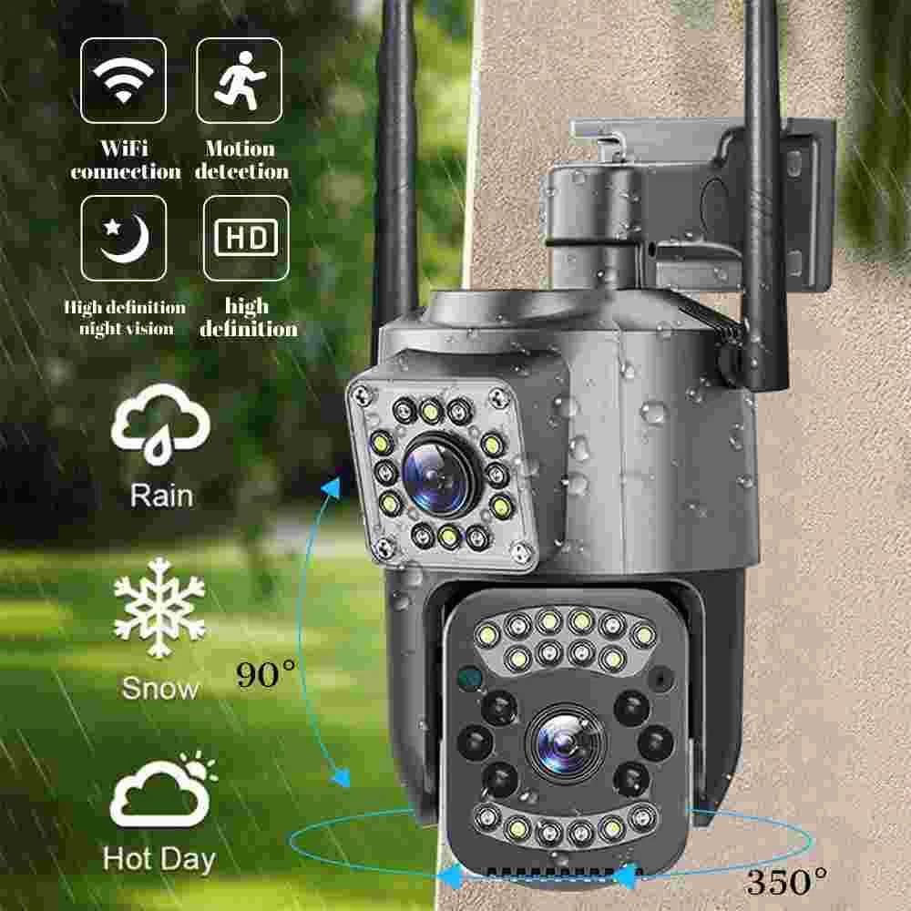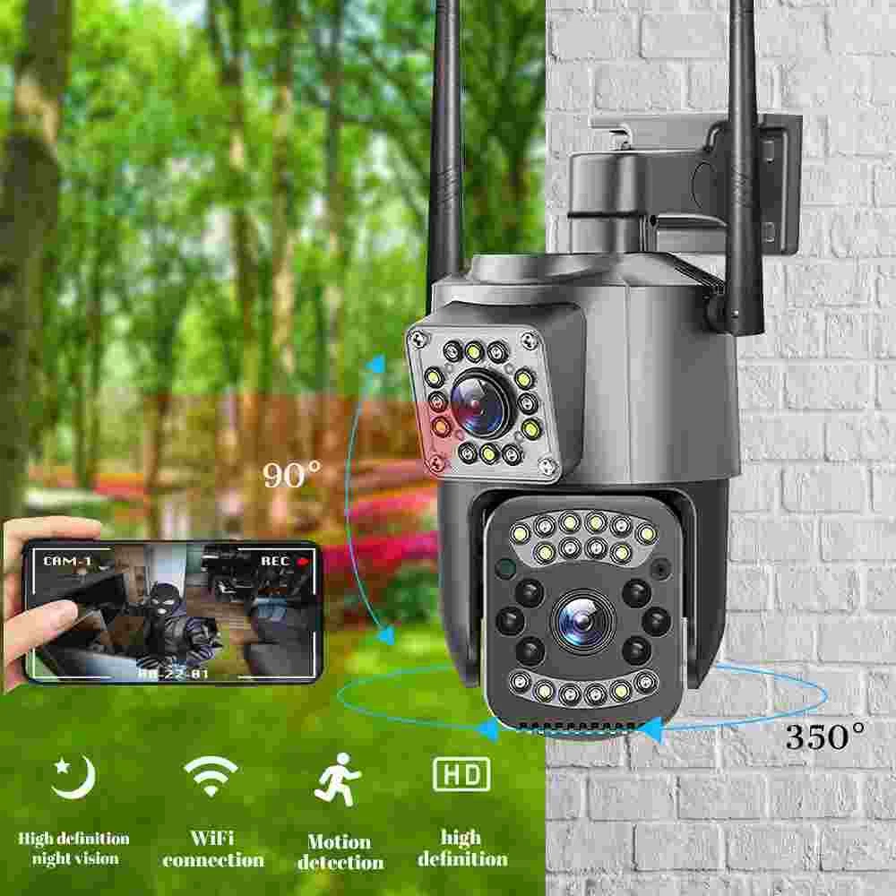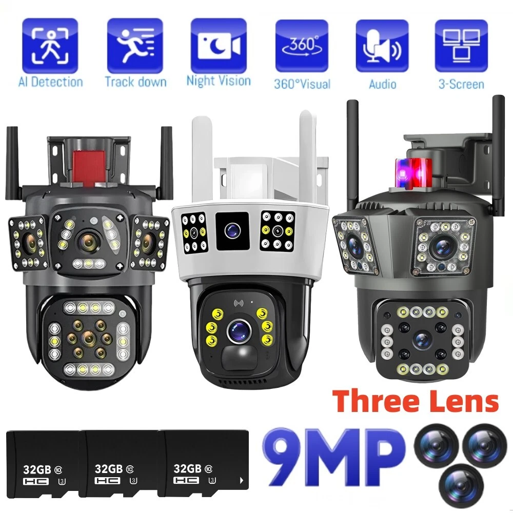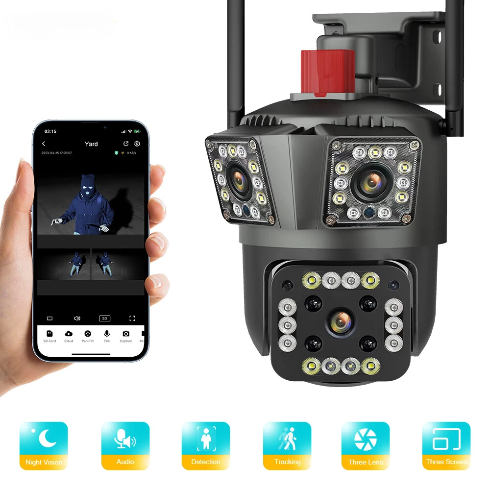 9MP Camera Product specifications: Sensor: 3MP+3MP+3MP Lens: 3.6mm Infrared light: upper infrared 12 lights, white 10 lights, lower infrared 10 lights, white 4 lights Low illumination: 0.01Lux Effective distance: 8-10 meters Switch: automatic Termination (s): N/A Thunder sensor: None 2. Video imaging Lens pixel: 3 million+3 million+3 million Compression format: H.264 High profile Effective resolution: 1920x1080P Visual angle: 105 degree Frame rate: 1080P 18FPS Mirror flip function: Yes Visual mode switching: ultra clear&high-definition&automatic 3. Audio Voice communication: two-way intercom Audio input: built-in microphone Audio output: built-in speaker 4. Network mode Network interface: wireless (WiFi) or 4G, without network port Network protocols: IP, TCP, DHCP WPS Domain name resolution: Yes Port transmission: P2P Platform: Dual Stream DHCP: Automatic 5. Wireless Output power: 802.11g: 10.95dBm (0.012w) 802.11b: 10.74dBm (0.012w) 802.11nHT40: 11.58dBm (0.014w) 802.11nHT20: 11.07dBm (0.013w) Frequency: 2412-2462MHZ 6. Antenna Antenna: omnidirectional antenna Antenna gain: 3dBi Network security: WEP, WPA-PSK, WPA2-PSK FCC identification number: 2APD7-R9820 Bandwidth: 40000 khz Modulation: DSSS, OFDM 7. Pan tilt Pan tilt angle: horizontal left and right: 355 degrees, vertical up and down: 110 degrees“ 8. Control Management Remote control: App remote Multi user management: Share up to 5 users Split screen view: up to 4 split screens display Mobile applications: IOS&Android 9. Alarm and notification methods Mobile detection: yes Information push method: Mobile phone automatic push (1 image, 3 second video) Information push interval: 5 seconds APP name: IPC360 home Storage method: Amazon Cloud (overseas) Alibaba Cloud (mainland)/TF Dual Lens Camera Features : 1. 2K 4MP (2MP+2MP) HD Dual Lens Network IP Camera For Indoor&Outdoor 2. Dual light source design, built-in 8 pcs infrared light + 8 pcs white light, night vision infrared and night vision full color can be set; 3. Pan&Tilt: horizontal 0~350 degrees, vertical 0~90 degrees; 4. 2.4G WIFI + RJ45 network port for Internet access; 5. power supply DC 12V/2A 6. Dual Design, Support SD / TF storage and cloud storage; 7. Two-way voice intercom, two-way video synchronous recording and playback 8. Humanoid detection/vehicle detection/pet detection/other detection 9. Automatic tracking/movement alarm, alarm output sound and light linkage; 10. AI intelligent algorithm to achieve video 3D positioning and continuous tracking of target alarms; 11. Support Android/IOS APP remote management (V380 Pro). Real Two Way Audio Notice: APP: V380 PRO does not support 10XZOOM 3 Lens Camera Ensure your home is protected from every angle with our cutting-edge surveillance technology. The Double 3MP WiFi Camera features not one, but two lenses and three imaging screens, providing a 360-degree view with no blind spots. two of these lenses serving as decorative elements with the LED lights working properly.Keep a watchful eye on every corner and enjoy the peace of mind that comes with comprehensive security. VTS01 3 Lens Camera 3 screens shows on the V380 app Three images can be viewed simultaneously, and each image can be individually enlarged. Real time alerts Set up monitoring areas in advance, conduct actual testing, and promptly push alarm information. IP66 Waterproof / Dustproof The camera is equipped with IP66 case , which is waterproof, sun-proof and dust-proof. It is suitable for any environment. Clear Two Way Audio Built-in microphone and speaker / Customized new speakers with loud volume; You could talk to anyone nears the camera ( Warn someone to leave your house ). Advanced H.265 Video Compression H.265 (HEVC) doubles the coding efficiency compared with its predecessor H.264. H.265 video saves around 50% of the bit rate at the same quality of coding.H.265 only need less bandwidth,faster loading speed,more smooth video,Lower bite rate,higher image quality! 10X Zoom(Both 3 cameras support zoom) you can switch from 1X to 10X zoom instantly;it can fast zoom in or zoom out without lag;watch far and near images Simultaneously through Picture in Picture,don't miss a detail. Full Color Night Vision: When the white LED light is on, the camera will display colorful vision at night, and there are three night modes for you to choose. Ai Human Detect Alert Quickly finds human targets and immediately sends a notification to your phone, letting you see what happens anywhere. It only detects the human shape and will not trigger falsely for objects such as cars and trees. PTZ Control by APP Rotates 355° Horizontally and 90° Vertically.You can control it in the APP directly whenever you want and wherever you are.