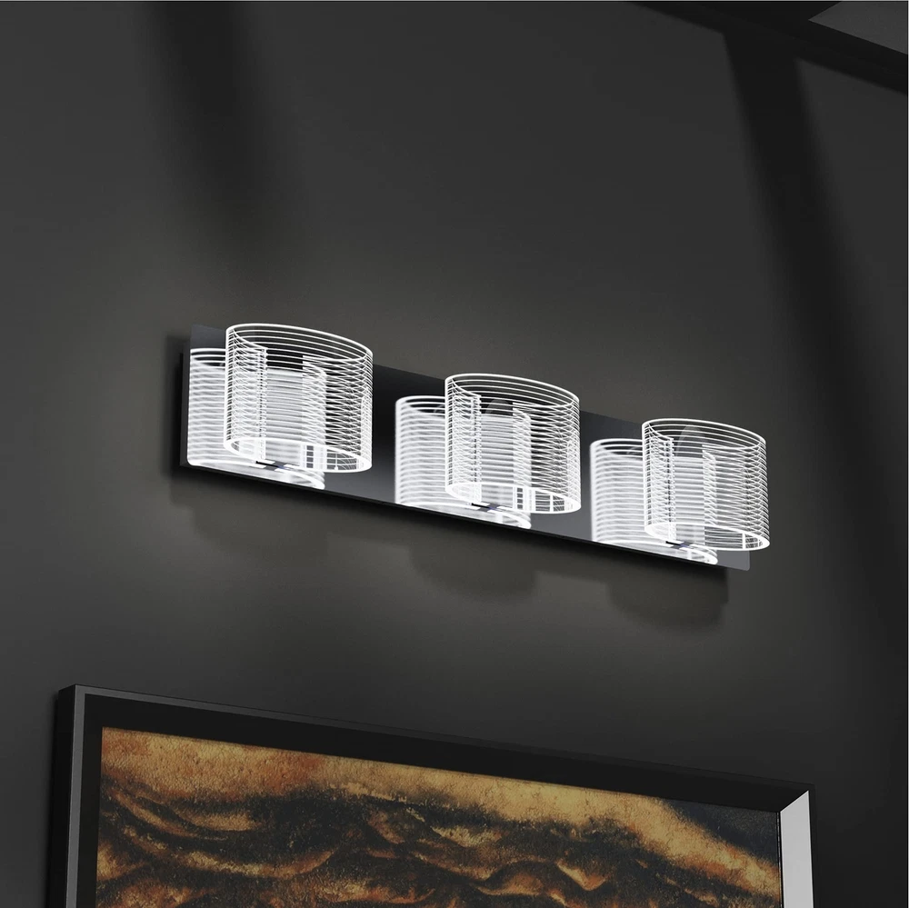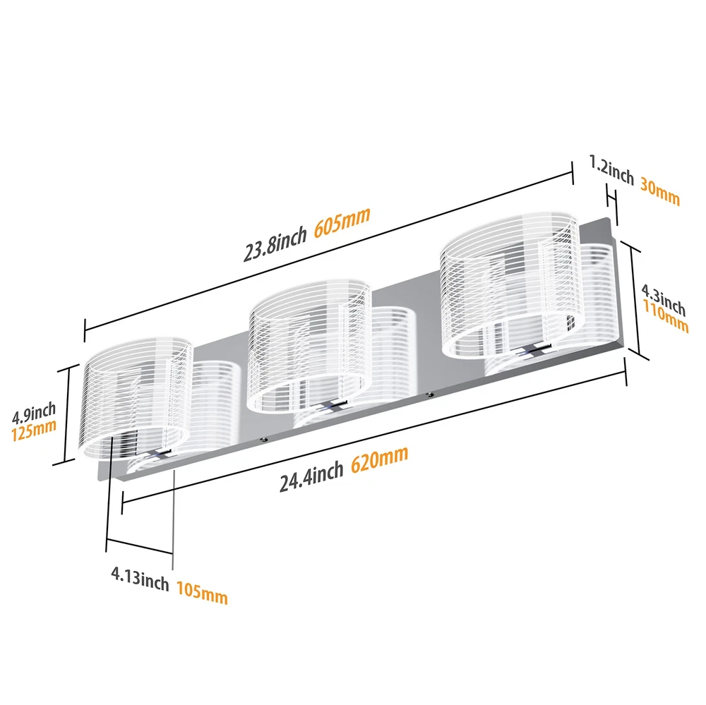 【Outstanding Outlook】 The graceful and unique design of bathroom light fixture. The rectangle chrome finishing metal base with the Linear design with Premium Pure Clear Oval Lampshade. 【Quality Material】 Bathroom vanity light fixture has done the chrome finish on the body, and the lampshades are made of premium pure clear acrylic material; Supreme and Beautiful. The reflection on the chrome finish base highly improve the brightness lumen of bathroom light fixture. 【Dimmable LED Lighting】Bathroom vanity light comes with the dimming lighting function, and the lighting can be dimmer and brightened depending on the scenes and preference. Vanity light has a total of 24W output to support 1560LM lumens, and it illuminates 6000K color temperature pure white. 【Interior Application】 Bathroom light fixture is widely applied for all interior. Chrome finish outlook and ETL waterproof driver allow vanity light to operate under damp and dry interiors. Perfect for pictures lighting, hallway lighting, stairway lighting, vanity light, bathroom vanity light. 【Easy to Install】 No Switch on vanity light. Suitable for US standard junction box and easily connection to the reserved wires. All mounting hardware and installation instruction are included in the package. Bathroom vanity light has the dimension of L: 24 inch* W: 5.11 inch* H: 4.1 inch.