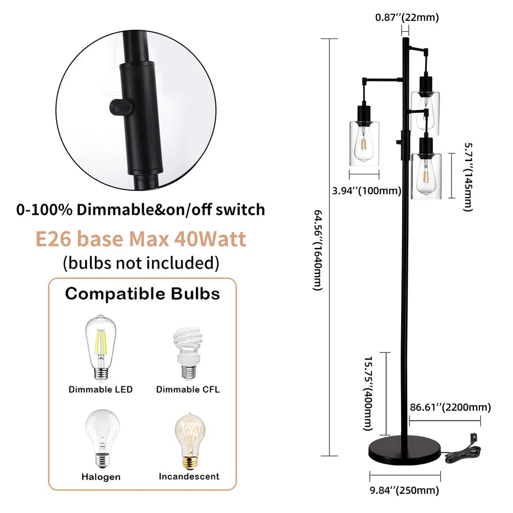 ๐ฌ%-๐ญ๐ฌ๐ฌ% ๐ฆ๐๐ฒ๐ฝ๐น๐ฒ๐๐ ๐๐ถ๐บ๐บ๐ถ๐ป๐ด: the dimmable floor lamp is built with an on/off dimmer switch, just simply twist it then you can dim the brightness from 0%-100%. Ideal for living room, bedroom, bedside, office study, reading ๐ฏ-๐๐ฒ๐ฎ๐ฑ๐ ๐ฃ๐ฟ๐ผ๐๐ถ๐ฑ๐ฒ ๐ฏ๐ฒ๐ฌยฐ ๐๐ถ๐ด๐ต๐๐ถ๐ป๐ด: 3 lights of this farmhouse tree standing floor lamp lie in 90ยฐvertical separately, no lightness angle, provide a 360ยฐ stable lighting, you can fully enjoy the comfortable soft warm ambience under the light ๐๐๐น๐ฏ๐ ๐ฅ๐ฒ๐พ๐๐ถ๐ฟ๐ฒ๐บ๐ฒ๐ป๐: Our industrial floor lamps are Compatible with E26 Dimmable LED, Dimmable CFL, incandescent, halogen bulbs and Edison bulbs etc(40W max, bulbs NOT Included, Dimmable Bulb Only). ๐๐น๐ฎ๐๐ ๐ฅ๐ฒ๐ฝ๐น๐ฎ๐ฐ๐ฒ๐บ๐ฒ๐ป: glass shades for this industrial floor lamp are fragile during transportation. We will promptly replace the defective shades when there is any damage or defect . Feel free to contact us ๐จ๐ ๐ฆ๐๐ฎ๐ป๐ฑ๐ฎ๐ฟ๐ฑ,๐ฆ๐๐๐ฟ๐ฑ๐ ๐๐ฎ๐๐ฒ: All the socket, switch,bulbs and cord are comply with UL standard for the farmhouse floor lamp. with sturdy pole and heavy base keep the tall lamp stable & firm!