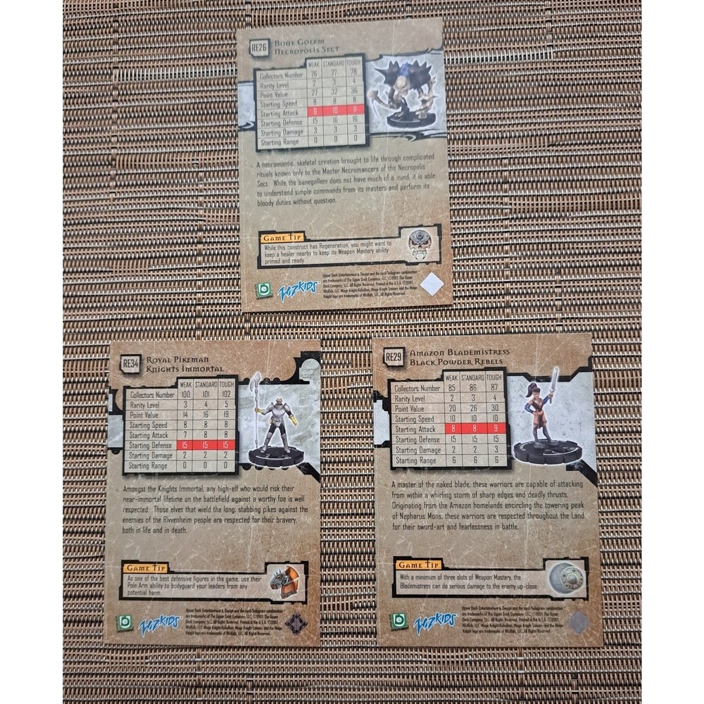 3 Mage Knight Rebellion 2001 Card Game Cards. Includes Royal Pikeman, Bone Gollum and Amazon Blademistress. In great condition. Please see all photos and judge condition for your self. Will ship fast and with care!