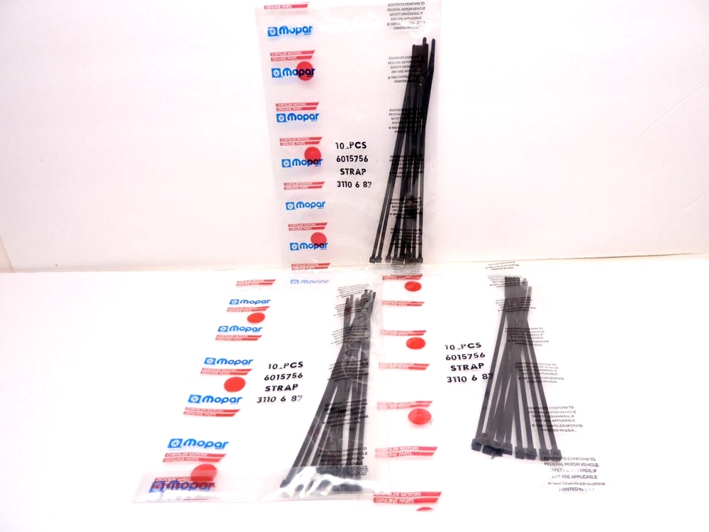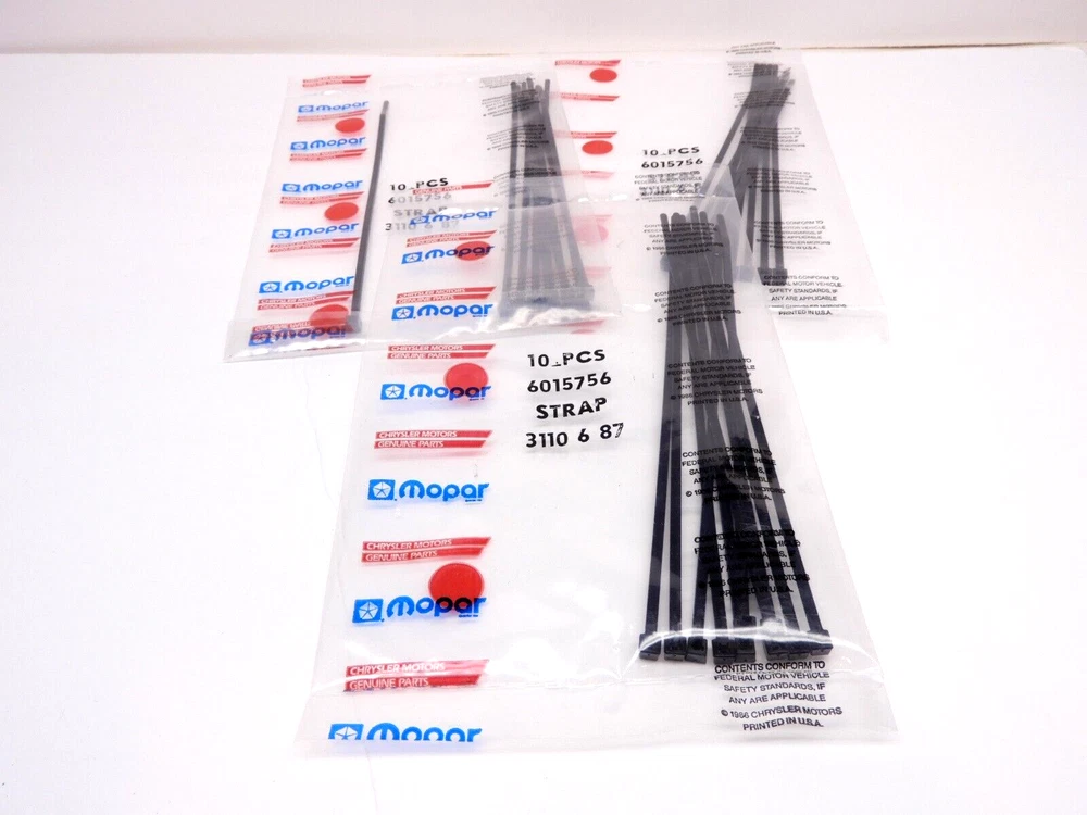 I'm offering... 3 NOS MOPAR SEALED PACKAGE OF 10 BLACK PLASTIC STRAPS CHRYSLER PART NUMBER: # 6015756 PACKAGE IS DATED JUNE 1987 THIS IS FOR 3 SEALED PACKAGES AS SHOWN! NICE ADDITION TO ANY MOPAR MEMORABILIA COLLECTION! PLEASE SEE ALL THE PICTURE'S INCLUDED WITH THIS AUCTION FOR CONDITION & PROPER APPLICATION PRIOR TO BIDDING. FREE SHIPPING! I will be happy to answer any questions. THANK YOU