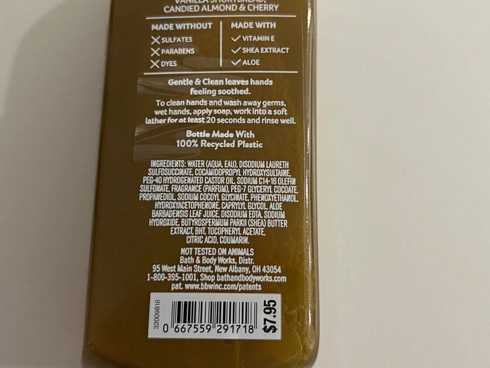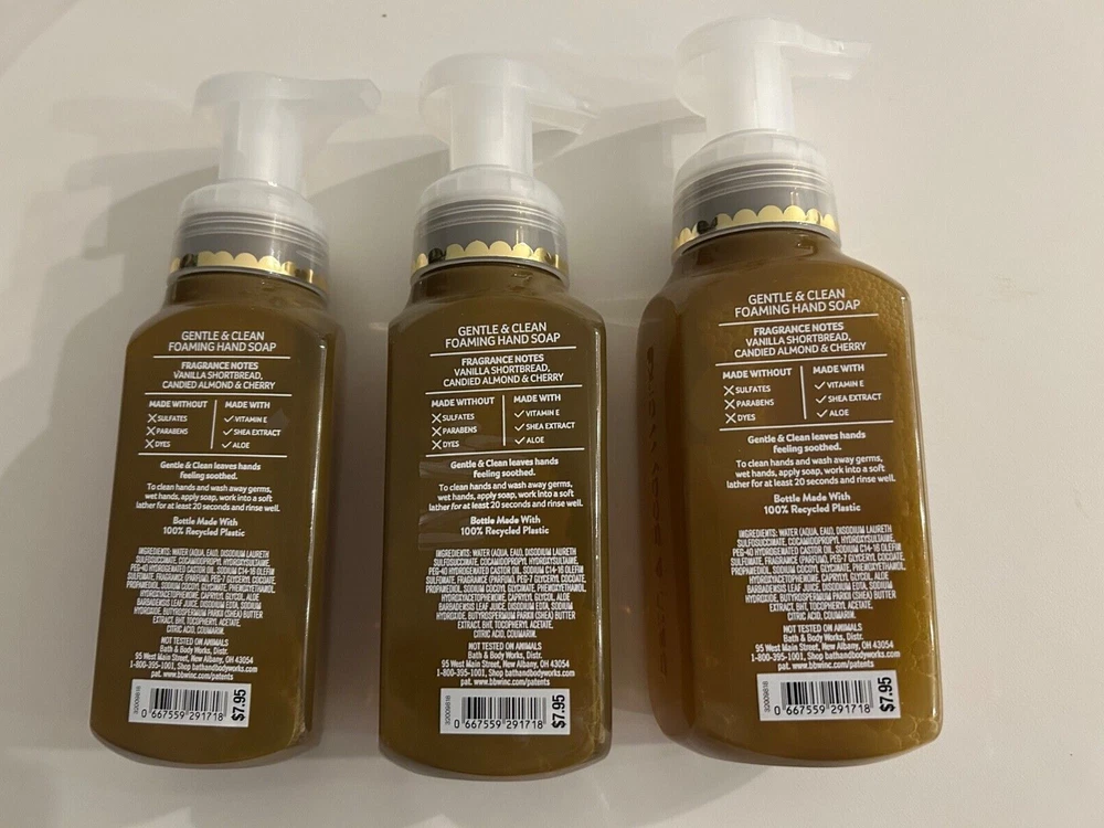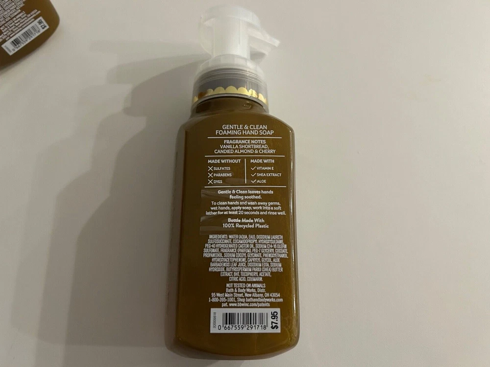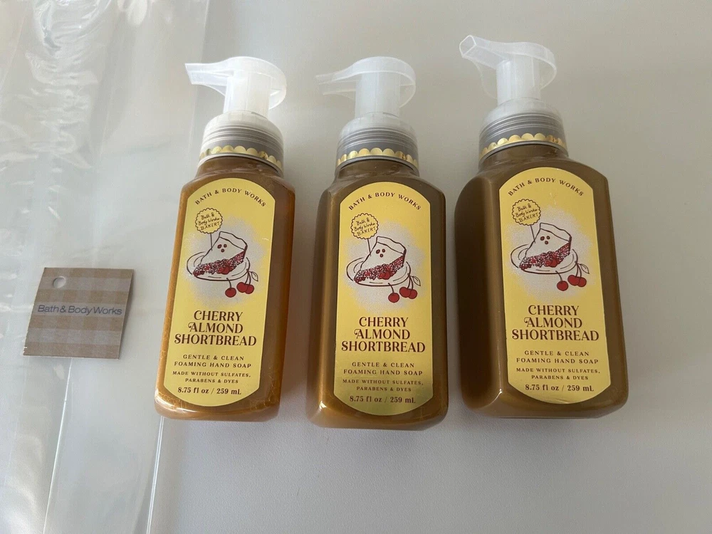 This auction is for 3 identical, brand new, BATH & BODY WORKS Gentle & Clean FOAMING HAND SOAP i n CHERRY ALMOND SHORTBREAD scent in the 8.75 oz. size . They are brand new, never opened. You will receive exactly what is in the photos.This is a great deal with an amazing smell! I am including the clear cello bag and a to/from tag. I will send them out the same day that payment is made. Good luck!