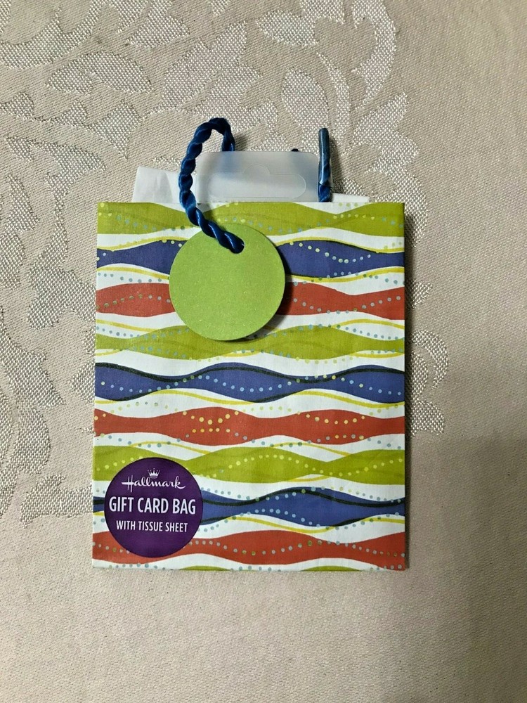 Gift Card Bags Lot of 3 - Red, Blue, & Green Stripes with White Tissue and Green Round Tag - NEW Measures about 4 5/8" Tall x 4" Wide x 1 3/4" Deep. Tag measures about 1 1/2" Ships by USPS