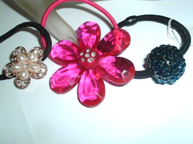 Three ponytail holders, one of a bright pink lucite flower with white rhinestones, one a golden flower with white pearls and rhinestones and the last a ballroom ball with midnight blue rhinestones and all three have elastic stretch bands for your ponytail. Never worn, condition is excellent, fun to wear. Three for the price of one. We combine ship.