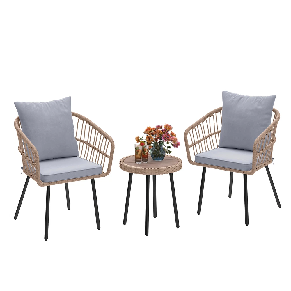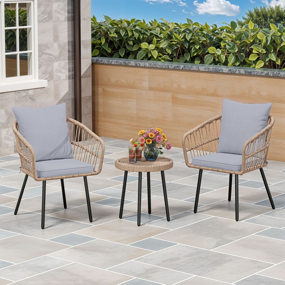 3 PCS Gray Patio Rattan Wicker Bistro Set w/ Thick Foam Chairs & Table