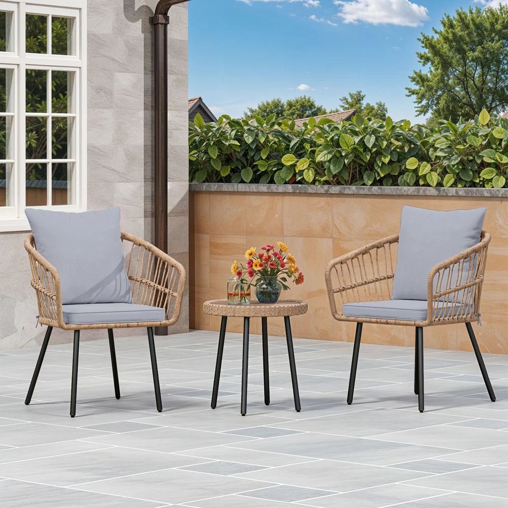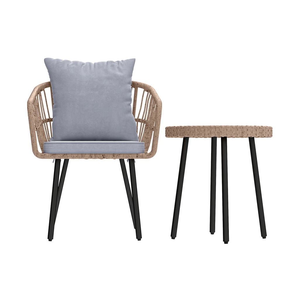 Number of Items in Set: Three-Piece Table Height: 18.3 in Weight Capacity: Chair 259 lbs, Table 66 lbs Features: Adjustable Height, Machine Washable, UV Protected, Water-Resistant, Waterproof, Weather-Resistant, With Armrest, With Backrest Department: Adults, Kids Feature: ESCP Umbrella Included: No Table Width: 17.71 in Material: Rattan, Wicker, Metal Chair Width: 24.8 in Manufacturer Warranty: 1 Year MPN: BEYSHqubYW California Prop 65 Warning: This product can expose you to chemicals including Phthalates, which is known to the State of California to cause cancer, and birth defects or other reproductive harm. Table Shape: Round Table Length: 17.71 in Cushions Included: Yes Chair Height: 28.74 in Tabletop Material: Metal Cushion Color: Gray Brand: Homnia Type: Table & Chair Set Tabletop Color: Beige Assembly Required: Yes UPC: 197839529311 Assembly Status: Assembly Required Chair Depth: 24.8 in gtin13: 197839529311 Chair Color: Beige Chair Back Material: Rattan Set Includes: Chairs, Cushions, Seat Cushion/Pad, Table Color: Gray Seating Capacity: Up to 2