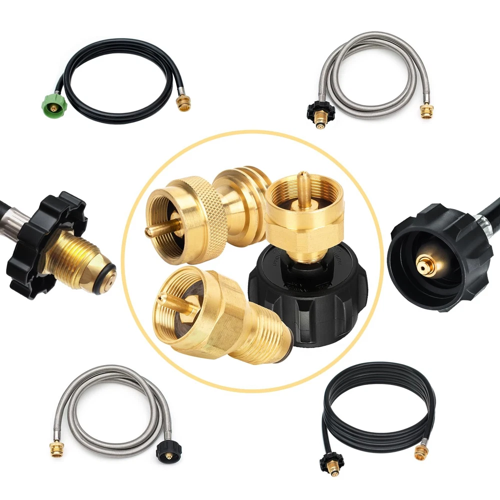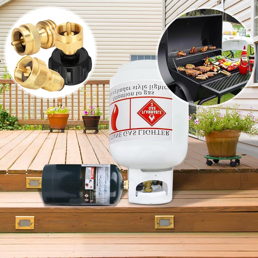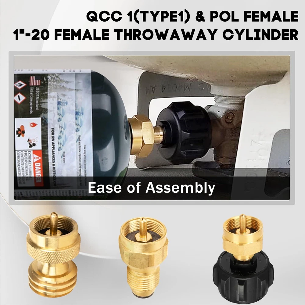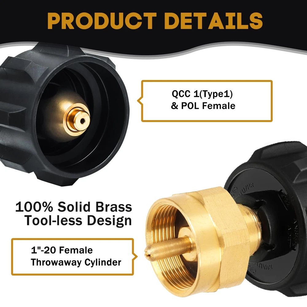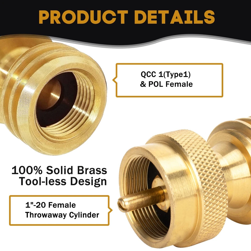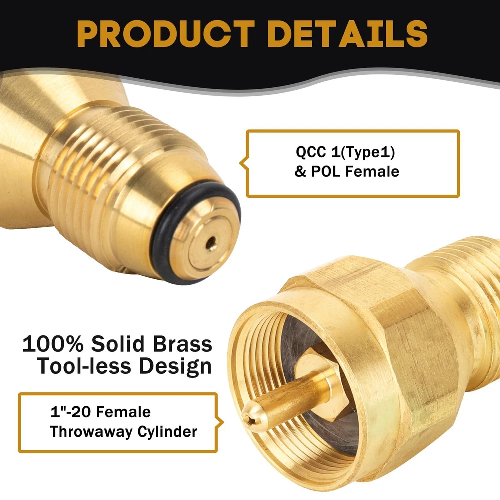 Package includes: 1* 20lb to 1lb propane adapter (1''-20 female throwaway cyliner x QCC-1 and Female POL); 1* QCC1 Regulator Valve Propane Refill Adapter; 1*POL universal propane refill adapter. Our 1lb propane tank adapters are made of 100% solid brass that won't break during use, provides a tight leak-free connection, and comes with a bundle of sealing bands for safer and more reliable use. Complete kit for easy use. Not only do our kits refill your small 1lb gas bottle, there is also a 1 lb to 20 lb propane adapter that allows you to more easily and quickly connect a small 1 lb canister bottle to a gas grill or propane tree, perfect for carrying and using on outdoor camping trips. Built-in safety features, the adapter has an automatic gas flow cut-off to ensure you don't overfill your 1 lb disposable cylinder, very safe with no gas leaks. After-sales service, before and after the purchase you encounter any problems please contact us, we will provide you with a satisfactory solution.