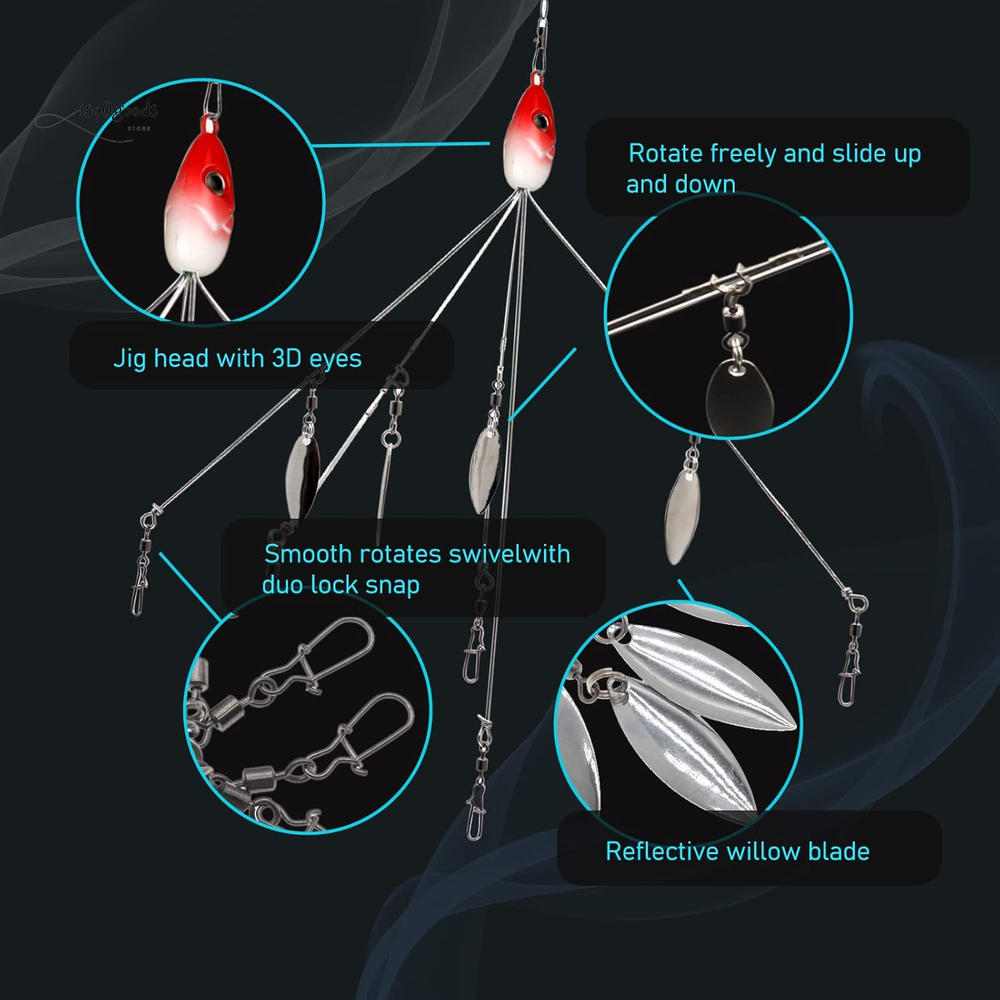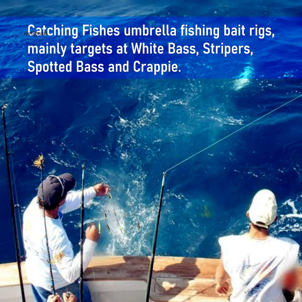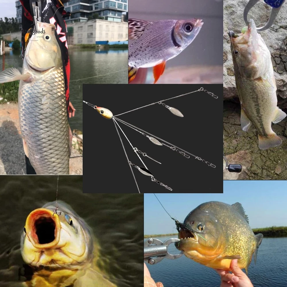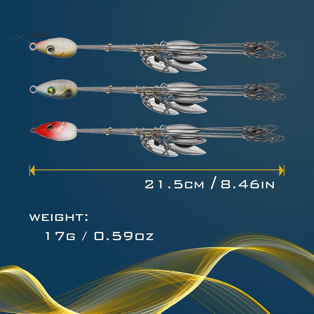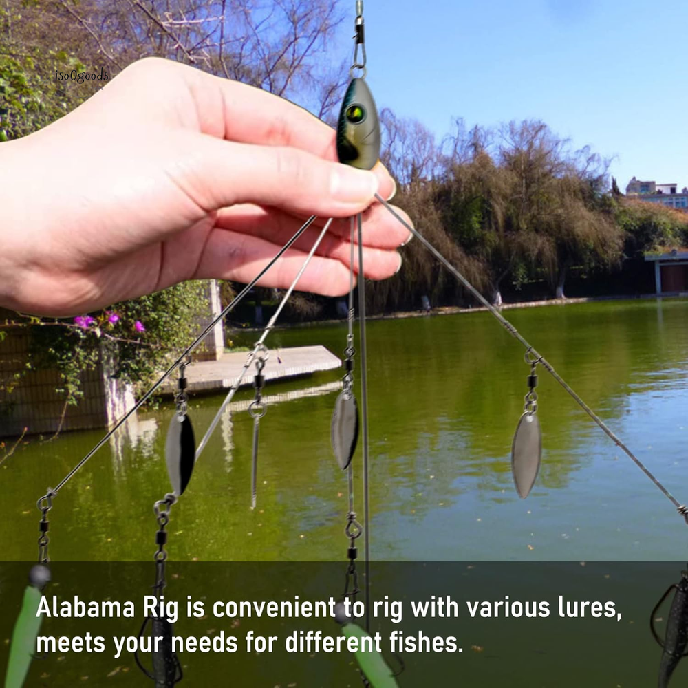 Product Description Enhance Your Fishing Experience with Our Premium Alabama Rig Package Includes: Our set features 1 Red, 1 Yellow, and 1 Blue Alabama Rig. Each rig measures 21.5 cm (8.46 in) in length and weighs 17 g (0.6 oz). Designed for anglers looking to cast multiple baits at once, this rig is the ultimate companion for giant bass fishing. High-Quality Construction: Crafted with a top-notch swivel ring, this rig allows the spoon to spin freely, effectively catching bass over 10 lbs. The smooth-running ball bearings and clevis help the four bright, shimmering willow leaves spin effortlessly, creating more sparkle and vibrations to attract fish from a distance. Versatile Bait Compatibility: Featuring 5 sturdy steel arms, our Alabama rig ensures strength and flexibility. The sinkerless design with blades and high-quality snaps and swivels make it easy to rig with a variety of lures. Suitable for Various Waters: Perfect for both saltwater and freshwater fishing, whether you're casting in a lake, river, sea, or from a boat. This bait set is designed to help you land an impressive catch. Target Fish: Ideal for catching a wide range of species, including channel bass, striped bass, yellow perch, walleye, pike, muskfish, roach, largemouth or smallmouth trout, snook, salmon, and more. Premium Alabama Rig Features: Package Includes: 3 pcs (Red, Yellow, Blue) Style: 4 blades Length: 8.46 inches Weight: 0.6 ounces Additional Set Includes: 2 pcs (Purple, Blue) Style: 8 blades Length: 8.8 inches Weight: 0.77 ounces Transform your fishing game with our meticulously designed Alabama Rig. Order now and experience the thrill of catching giant bass and other target fish with ease!