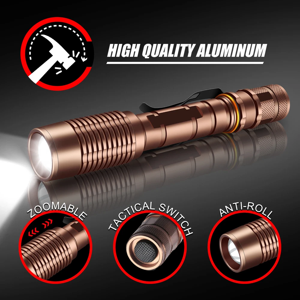 3 Pack 990000LM Super Bright LED Flashlight Work Light LED Torch Lamp Zoomable Note: 3.7v Rechargeable battery is not included. Features: Super Bright LED Flashlight Featured with adjustable focus; waterproof performance; memory function 1.【Bright Flashlight】 Super bright LED flashlight output irradiation distance up to 1000ft, with a long lifespan of 100,000 hours. Perfect for everyday use, like dog walking, camping, emergencies. 2.【5 Modes & Zoomable】 The waterproof flashlight LED have 5 light workingh modes: High > Medium >Low > Strobe >SOS (with a slight press of the power button to switch light mode) . The LED flashlight with focused function, you can just stretch flashlight head to adjust the focus, zoom in for close work or zoom out for distance. 3.【Long-Lasting】 In the case of fully charged, the super bright zoomable LED flashlights torch can be used for 4 hours under high light, 20 hours in low light. 4.【Waterproof & Durable】 The flashlight high lumens super bright waterproof is made of excellent aluminum alloy, impact-resistant up to 5 feet. With water-resistant, you can stop worrying about unexpected weather rain or snow. Please don't put into water for a long time. 5. 【Memory mode function】 This LED flashlight super bright Remembers and Turns on to the Last Setting that it is Operated On. 6. This is the same super bright zoomable LED flashlight that is used by the military, police, and the elite navy seals etc. and it's best for those who need a strong and good flashlight-like police officers, hunters or campers. Specifications: 1. LED: LED 2. Color: Bronze 3. Light Color: White 4. Material: Aircraft Aluminum 5. Switch Location: Tail 6. Zoomable: Yes 7. Led Lifespan: 100,000 hours 8. Power Supply: 2 x 3.7v Li-ion Rechargeable Battery ( Not include ) 9. Mode Arrangement: High, Medium, Low, SOS and Strobe(With a slight press of the power button changes the operating mode.) Package Includes: 3x Super Bright LED Flashlight (No Battery) On Jan 24, 2025 at 04:04:18 PST, seller added the following information: