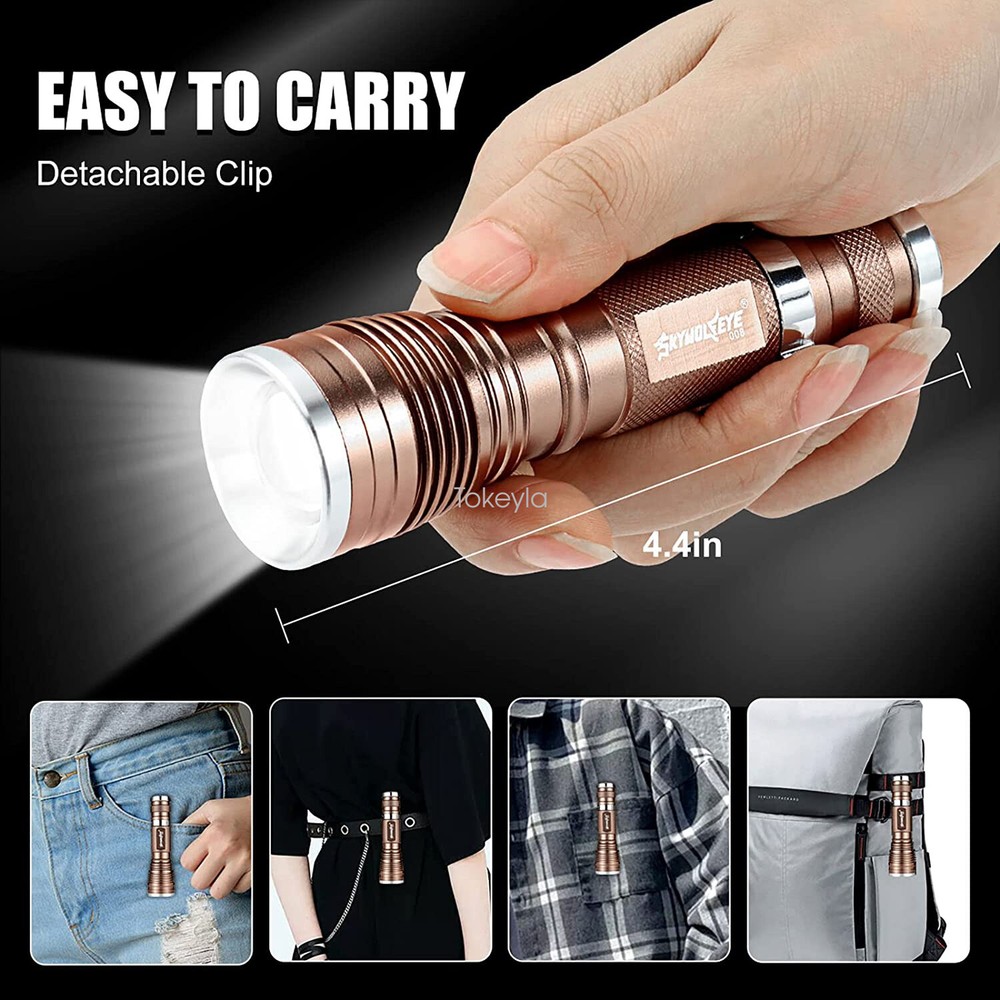 Number of Batteries: 0 Model: Super Bright LED Flashlight Type: Flashlight Color: Bronze Lighting Technology: LED Item Width: 1.26 inch Material: Aluminum Brand: Sky Wolf Eye Number of Lights: 1-3 Voltage: 3.7V Features: Clip On, Handheld, Rechargeable, Waterproof, Super Bright Zoomable LED Flashlight, Super Bright LED Flashlight, Flashlight High Lumens Super Bright Waterproof, LED Mini Flashlight Super Bright, Mini LED Flashlight Portable Work Light Item Height: 0.94 inch IP Rating: IP50 Battery Included: No Custom Bundle: No Number of LEDs: 1 Item Length: 4.45 inch Operating Time: 1-5 Hours Power Source: 1x 3.7v Lithium Rechargeable Battery(Not Included) Item Weight: 4.0 ounce MPN: Does Not Apply Country/Region of Manufacture: China
