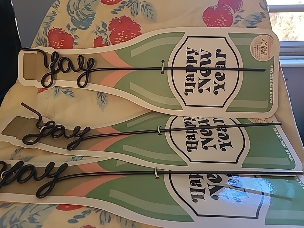 Add some festive flair to your New Year's celebration with this pack of three fun plastic straws! Perfect for any occasion, these straws come in a sleek black color and are made of durable plastic material. Use them to stir up your favorite cocktails or add them to your party tableware and serveware collection. These straws are ideal for any home or garden project and make a great addition to your greeting cards and party supply collection. Whether you're hosting a party or just looking for some fun accessories, these plastic straws are sure to add a touch of excitement to your celebration. 3 Straws says YAY