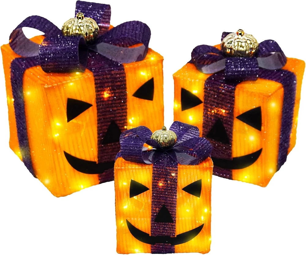 3 Pack Halloween Lighted Gift Boxes - Orange & Purple LED Outdoor Decor